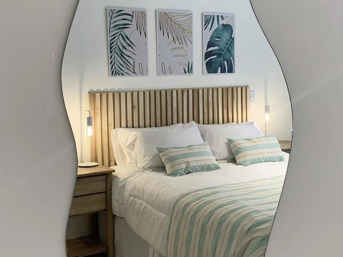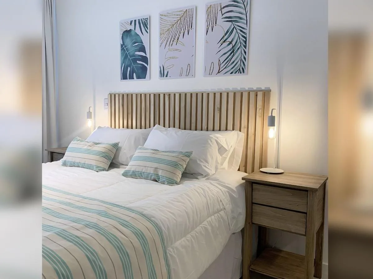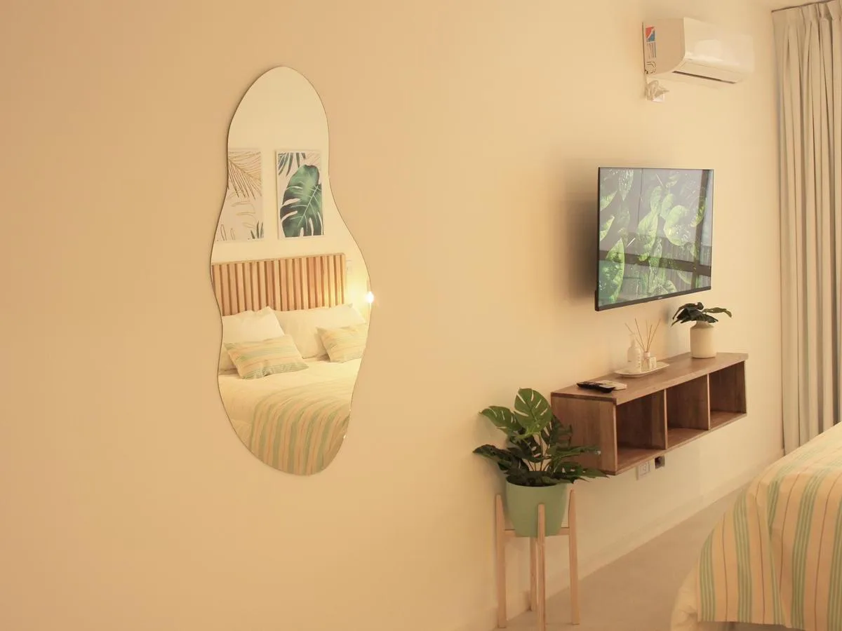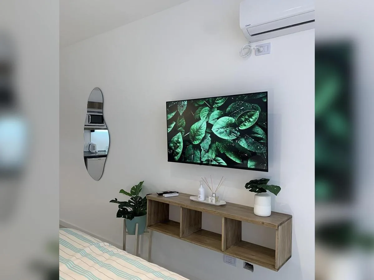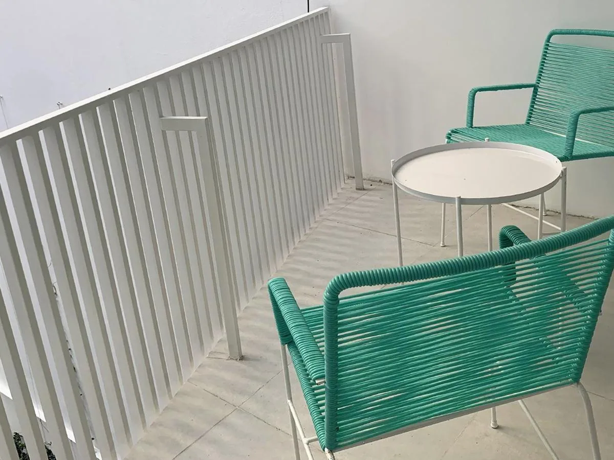 Kitnet de 1 ambiente no 1º andar, unidade 09, com varanda. Conta com cama queen na área de descanso, cozinha completa com bancada e banquetas e banheiro completo. O prédio tem lavanderia, piscina na cobertura e academia equipada.