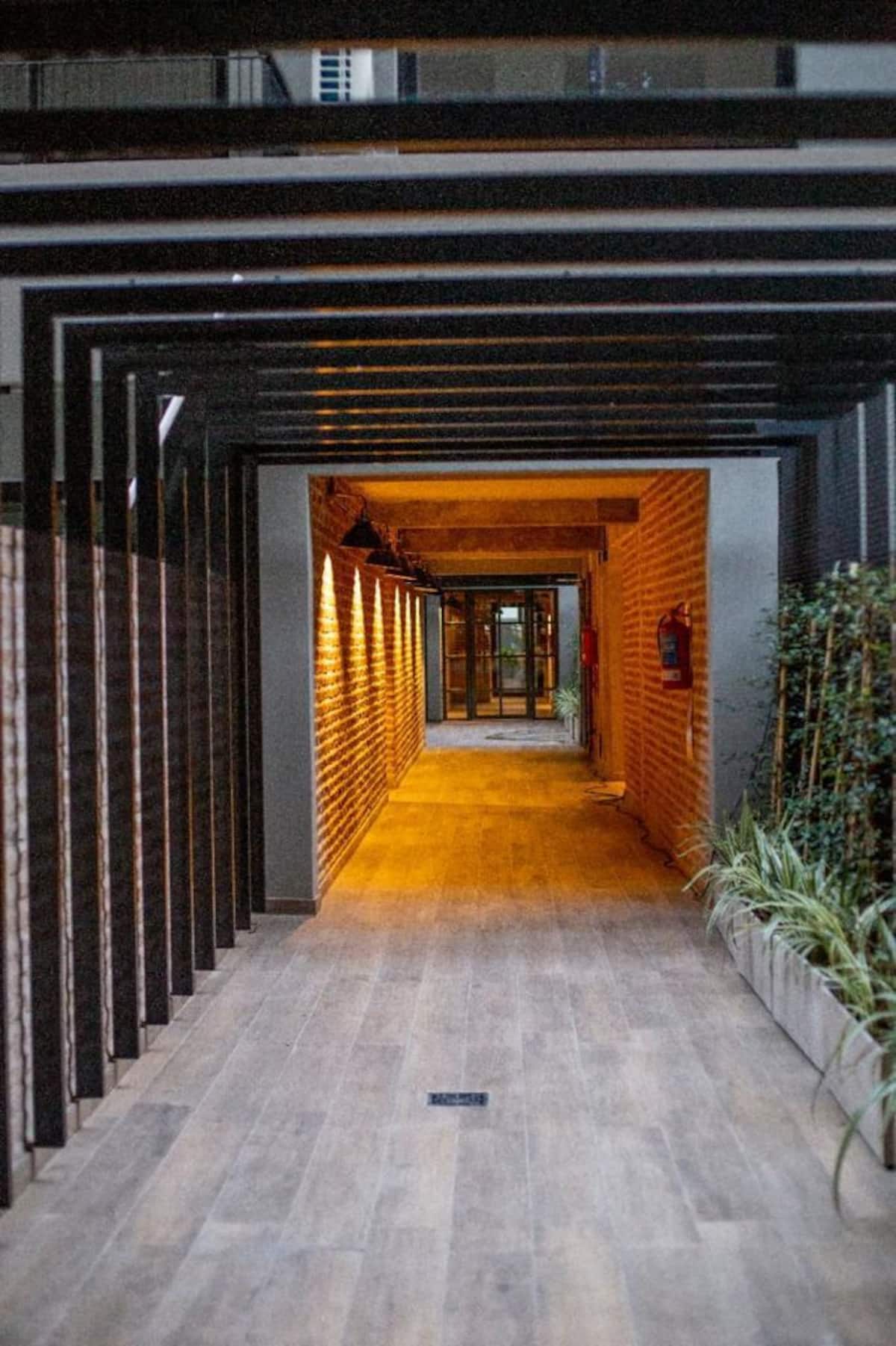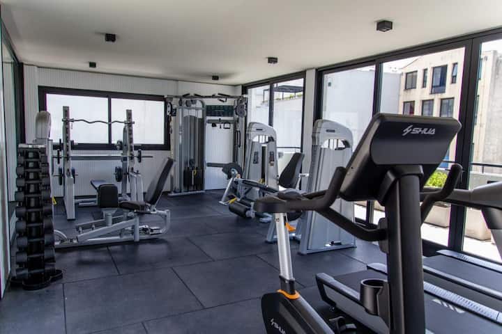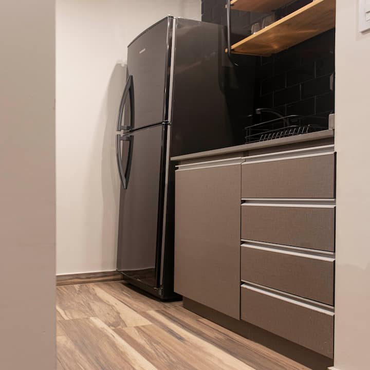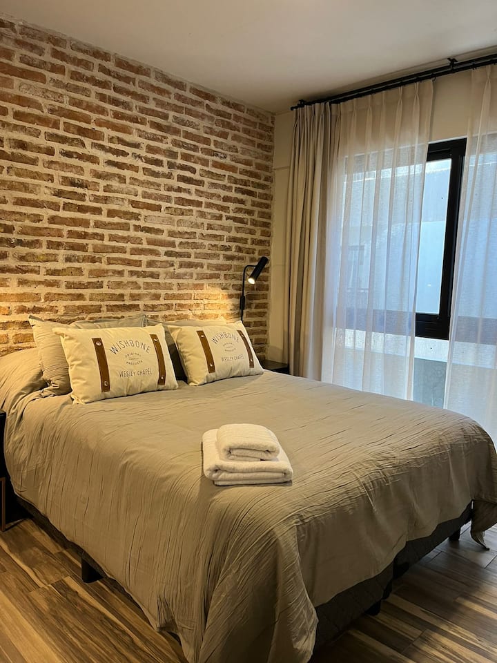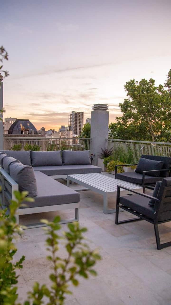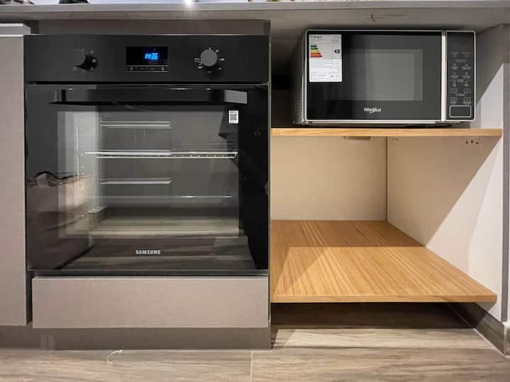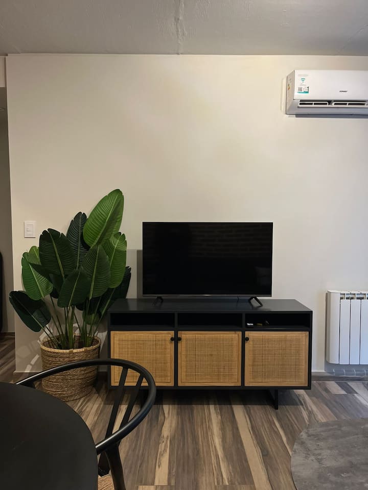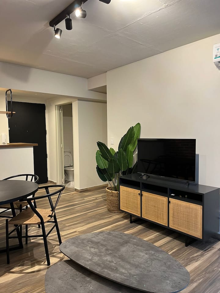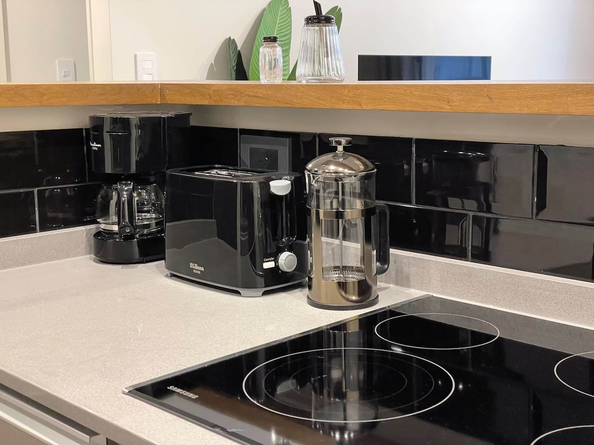 Apartamento em San Telmo com 1 dormitório, ar-condicionado nos dois ambientes e cortinas blackout. O aquecimento é individual por piso radiante. O banheiro é suíte e inclui bidê, chuveiro e banheira; há secador de cabelo e itens de higiene. A cozinha tem forno, fogão elétrico, geladeira com freezer, micro-ondas, torradeira, chaleira elétrica e cafeteira com filtro programável. Há Wi-Fi de alta velocidade, TV Smart 4K de 42" com TV a cabo e roupa de cama e toalhas com capas. O prédio oferece pisc