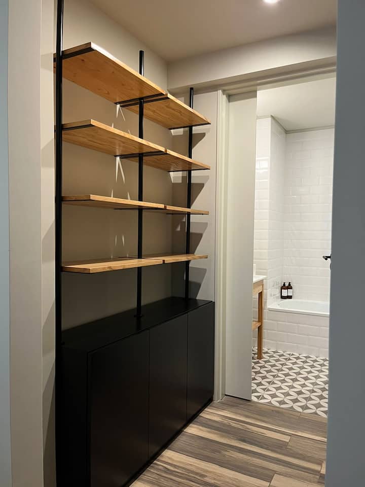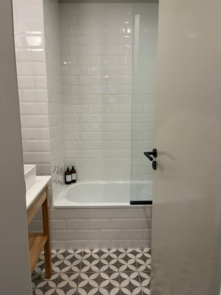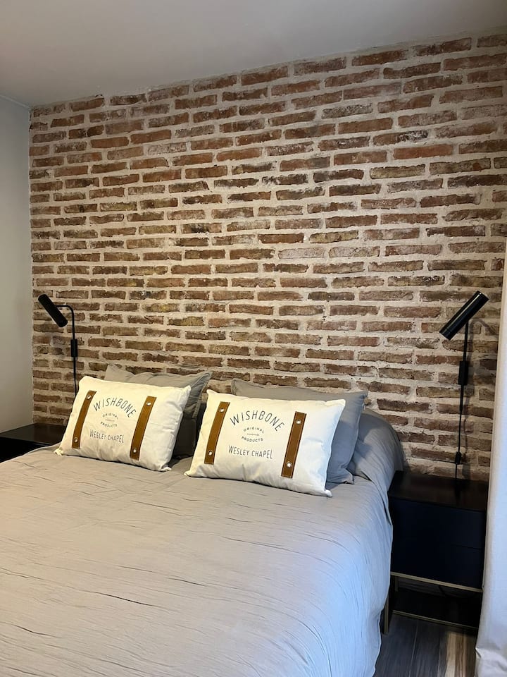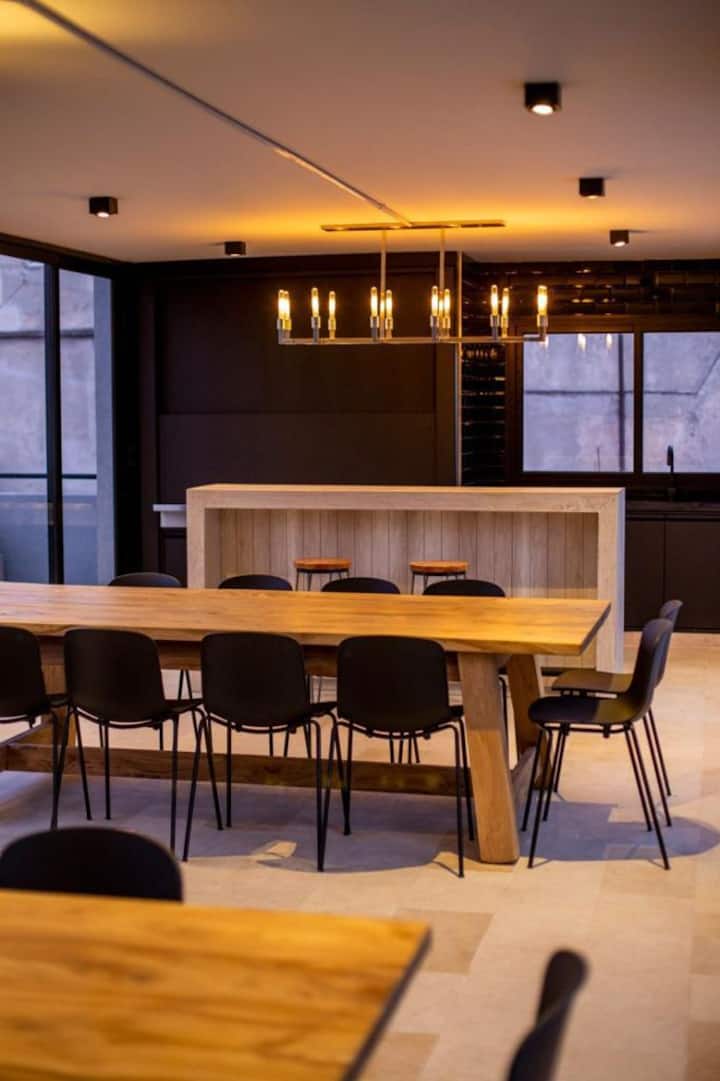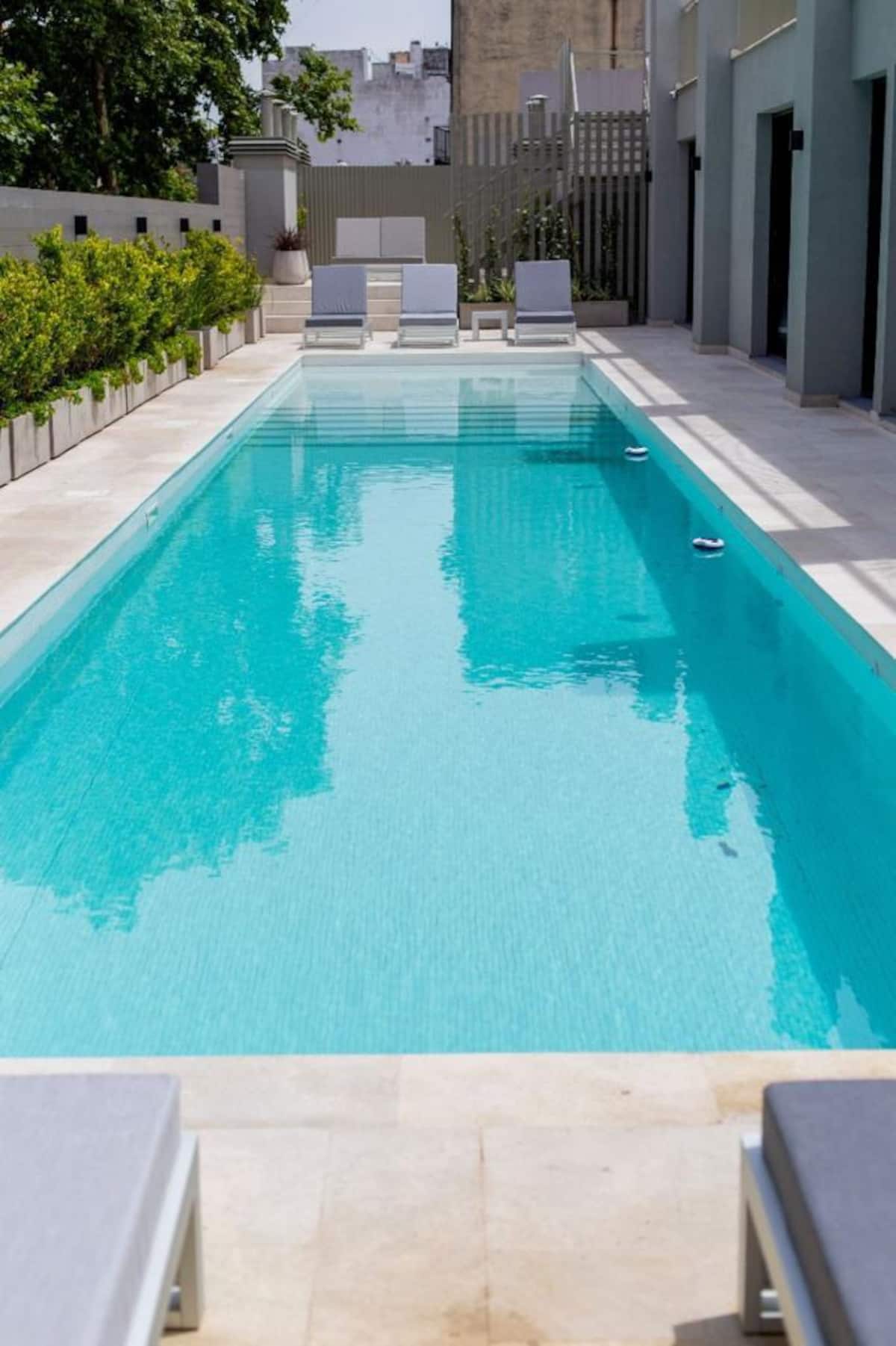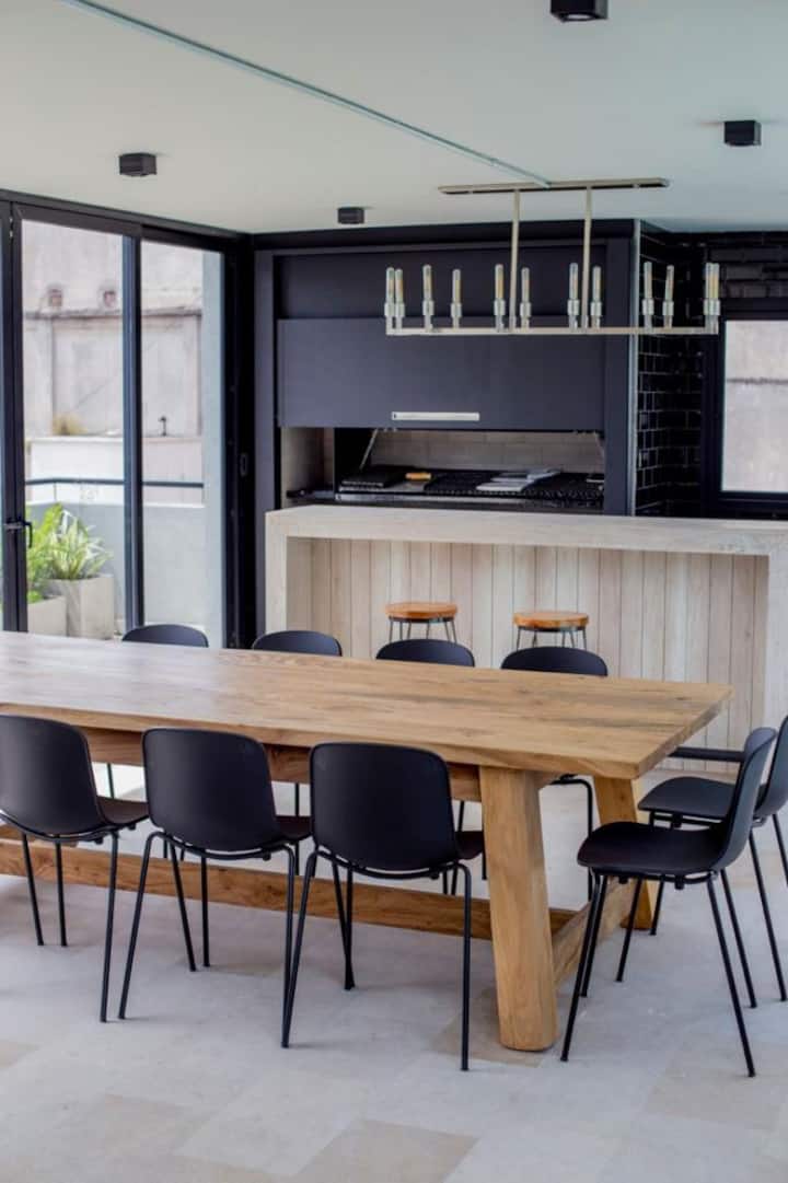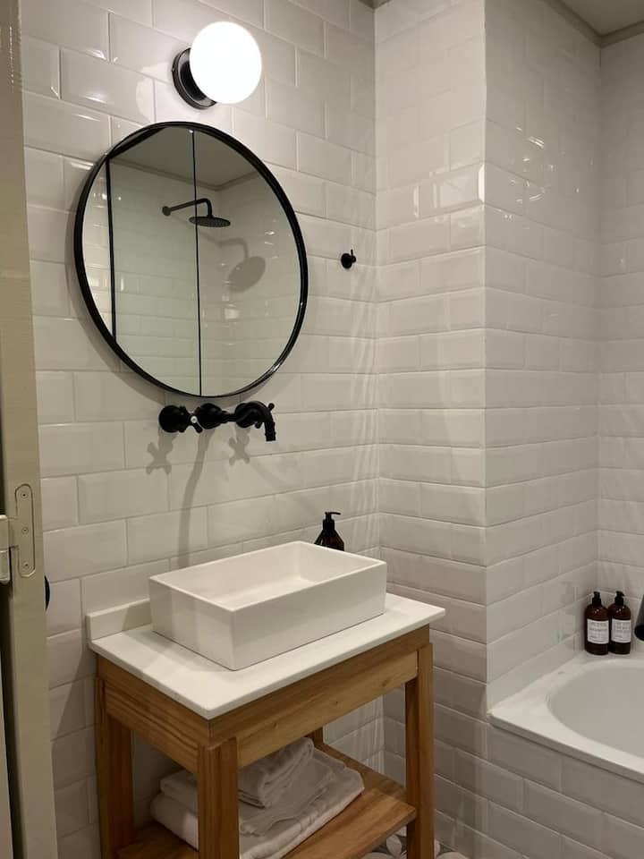 Apartamento em San Telmo com 1 dormitório, ar-condicionado nos dois ambientes e cortinas blackout. O aquecimento é individual por piso radiante. O banheiro é suíte e inclui bidê, chuveiro e banheira; há secador de cabelo e itens de higiene. A cozinha tem forno, fogão elétrico, geladeira com freezer, micro-ondas, torradeira, chaleira elétrica e cafeteira com filtro programável. Há Wi-Fi de alta velocidade, TV Smart 4K de 42" com TV a cabo e roupa de cama e toalhas com capas. O prédio oferece pisc