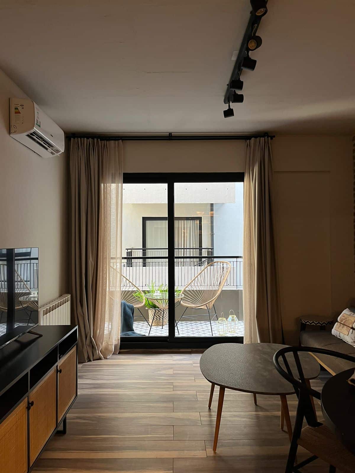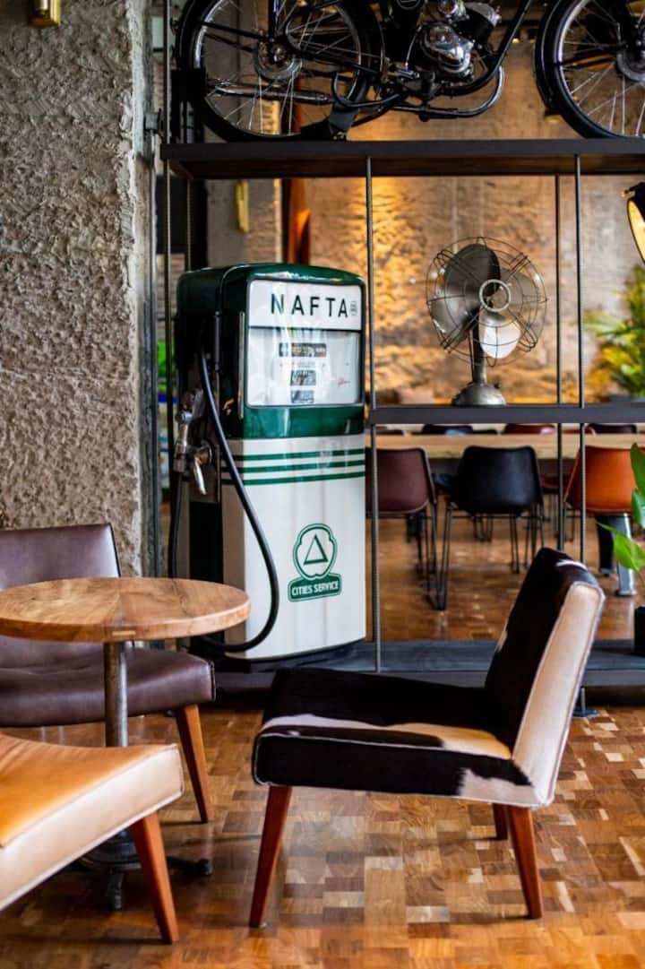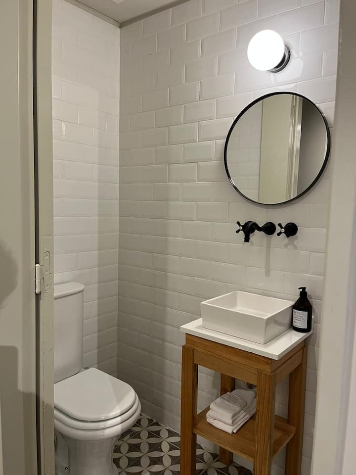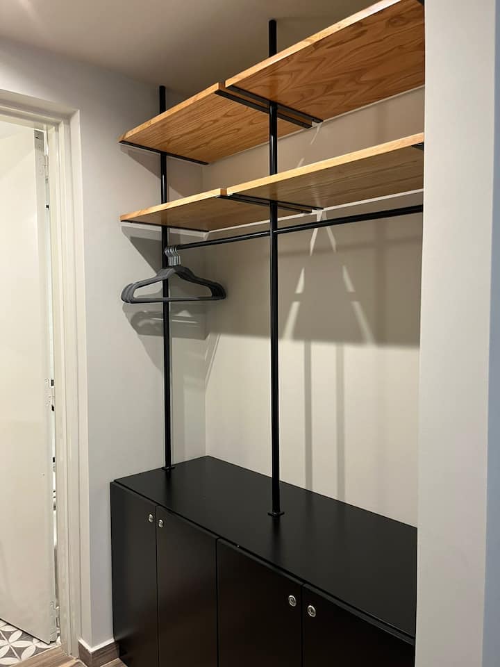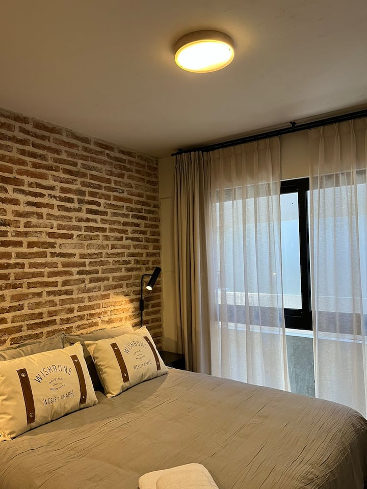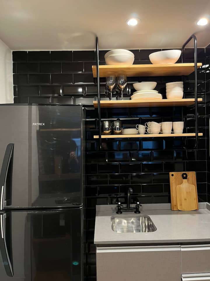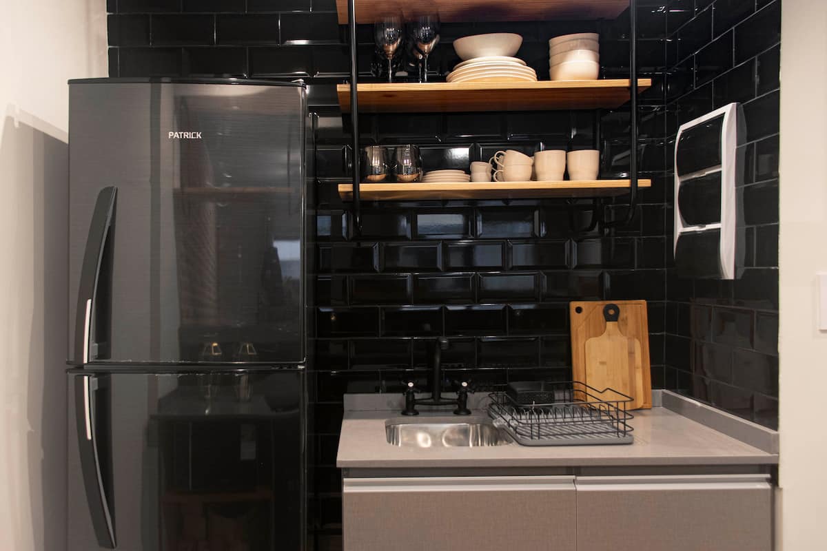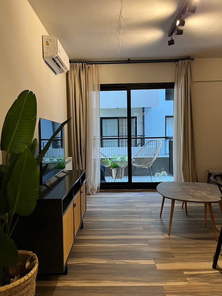 Apartamento em San Telmo com 1 dormitório, ar-condicionado nos dois ambientes e cortinas blackout. O aquecimento é individual por piso radiante. O banheiro é suíte e inclui bidê, chuveiro e banheira; há secador de cabelo e itens de higiene. A cozinha tem forno, fogão elétrico, geladeira com freezer, micro-ondas, torradeira, chaleira elétrica e cafeteira com filtro programável. Há Wi-Fi de alta velocidade, TV Smart 4K de 42" com TV a cabo e roupa de cama e toalhas com capas. O prédio oferece pisc
