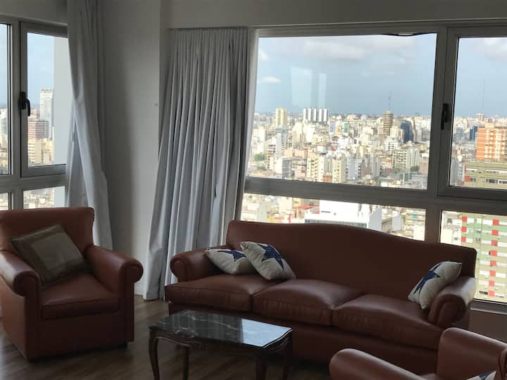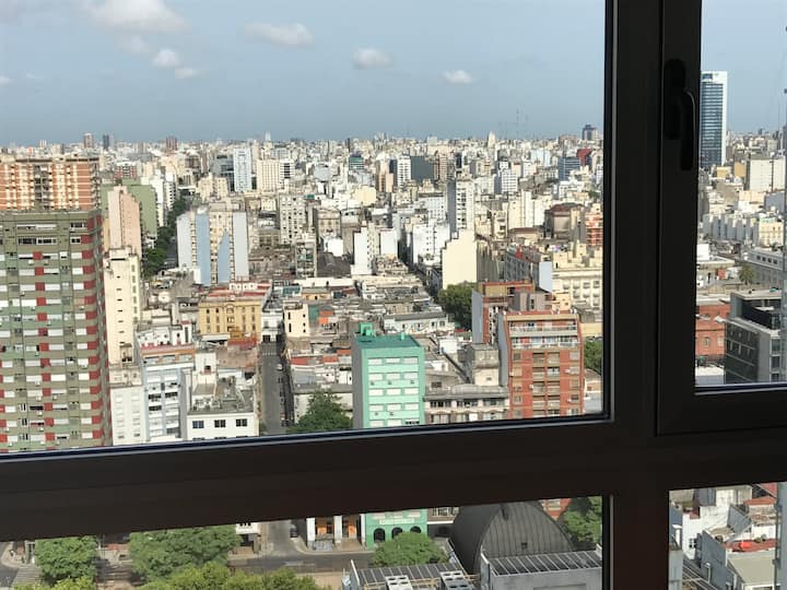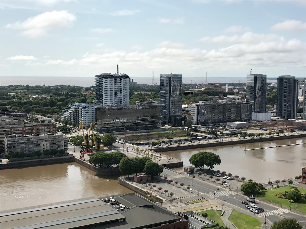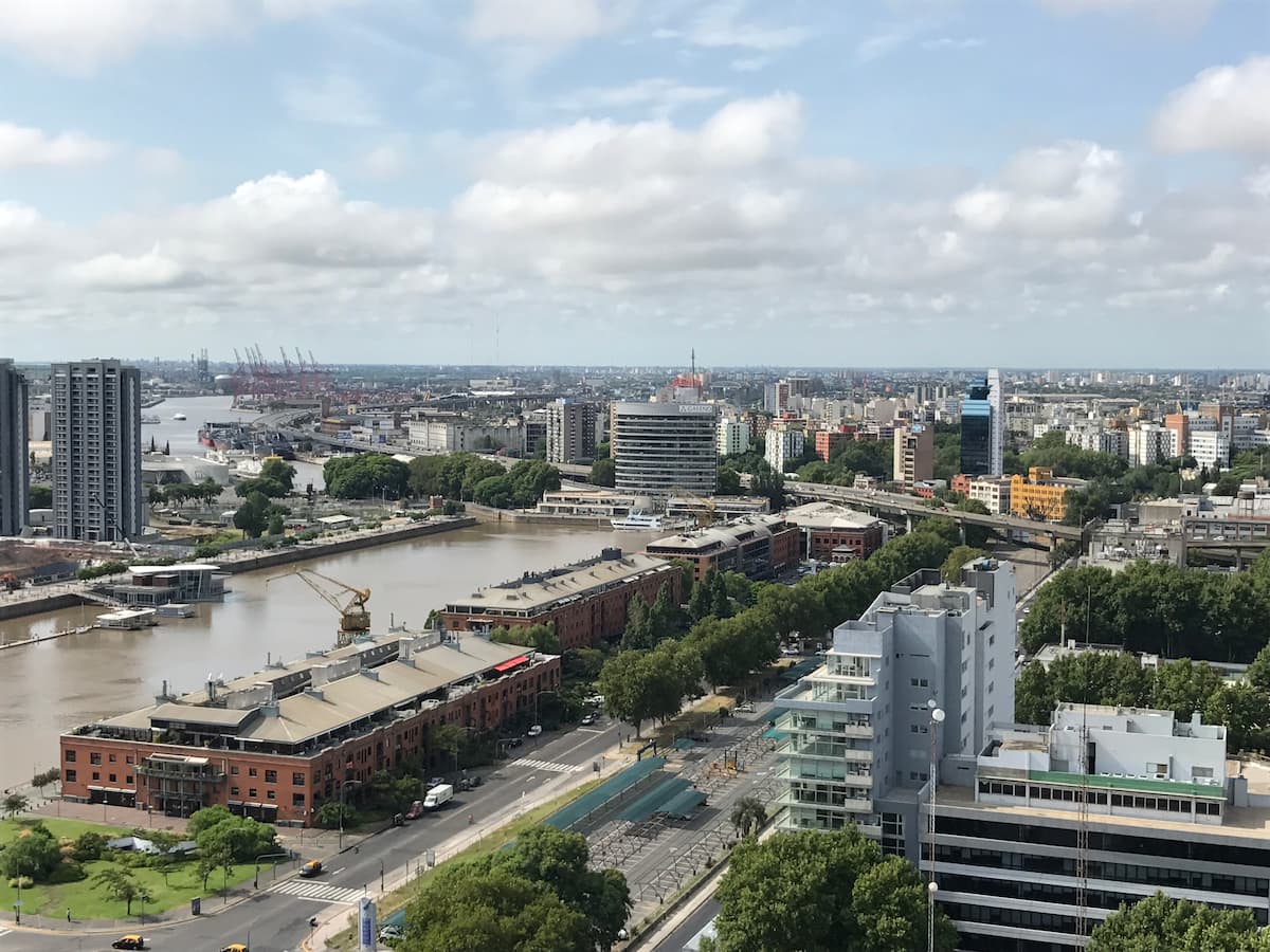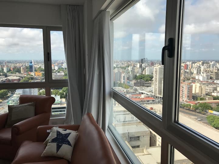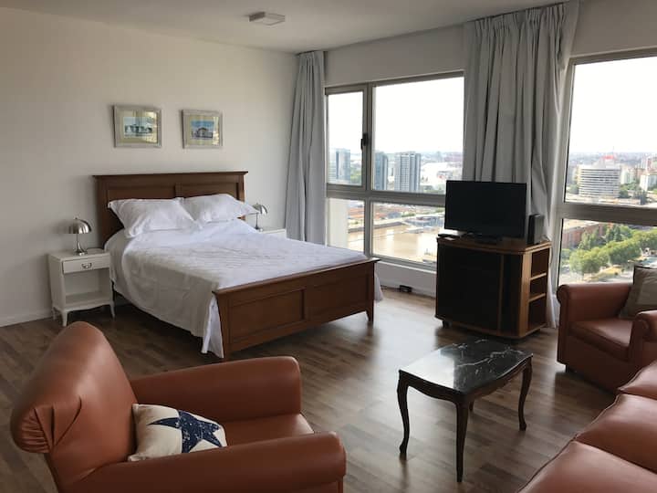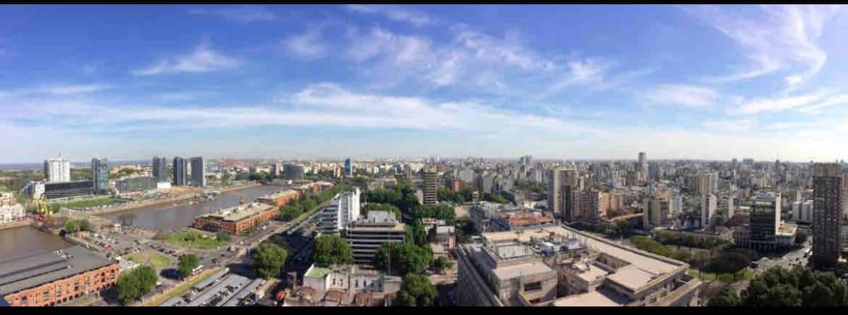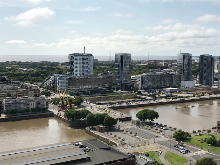 Apartamento em prédio alto no 22º andar, com vista ampla da cidade, do Rio de la Plata, de San Telmo e de Puerto Madero. Fica a cerca de 5 minutos do centro e próximo à área de restaurantes nos docks. O edifício tem vigilância 24 horas. Imóvel novo; estacionamento por conta dos hóspedes.