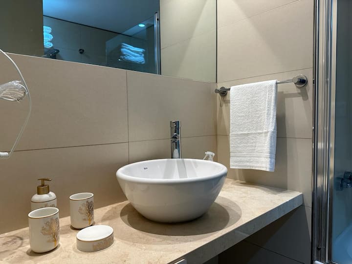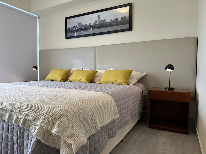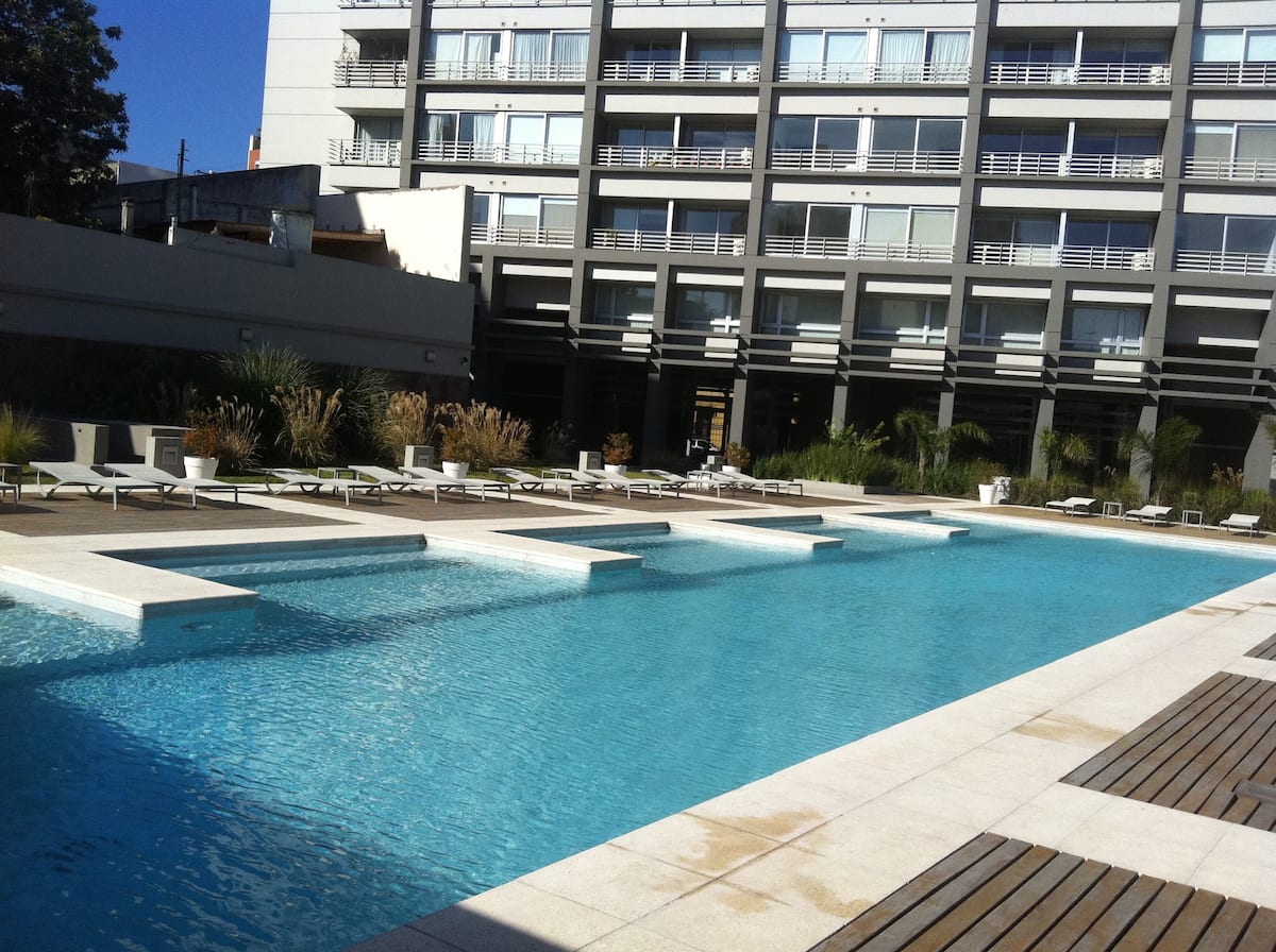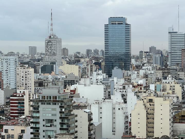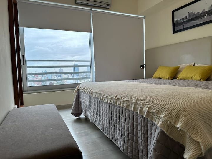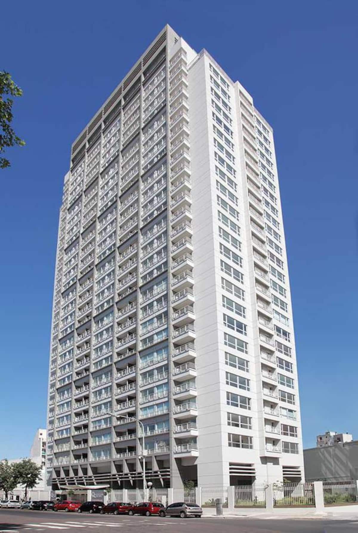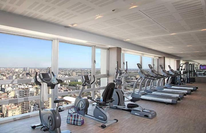 Apartamento de 2 ambientes em San Telmo, no Quartier San Telmo, no 27º andar, com vista panorâmica da cidade. Mobiliado e equipado, com cama king, TV inteligente, Wi-Fi, banheiro completo com banheira, forno micro-ondas, torradeira e chaleira elétrica. O condomínio oferece segurança 24 horas, academia completa, piscina aquecida (interna) no 27º andar, piscina externa no parque, solário, área de churrasco e setor de lavanderia. O estacionamento é por manobrista, mediante custo adicional, com vaga