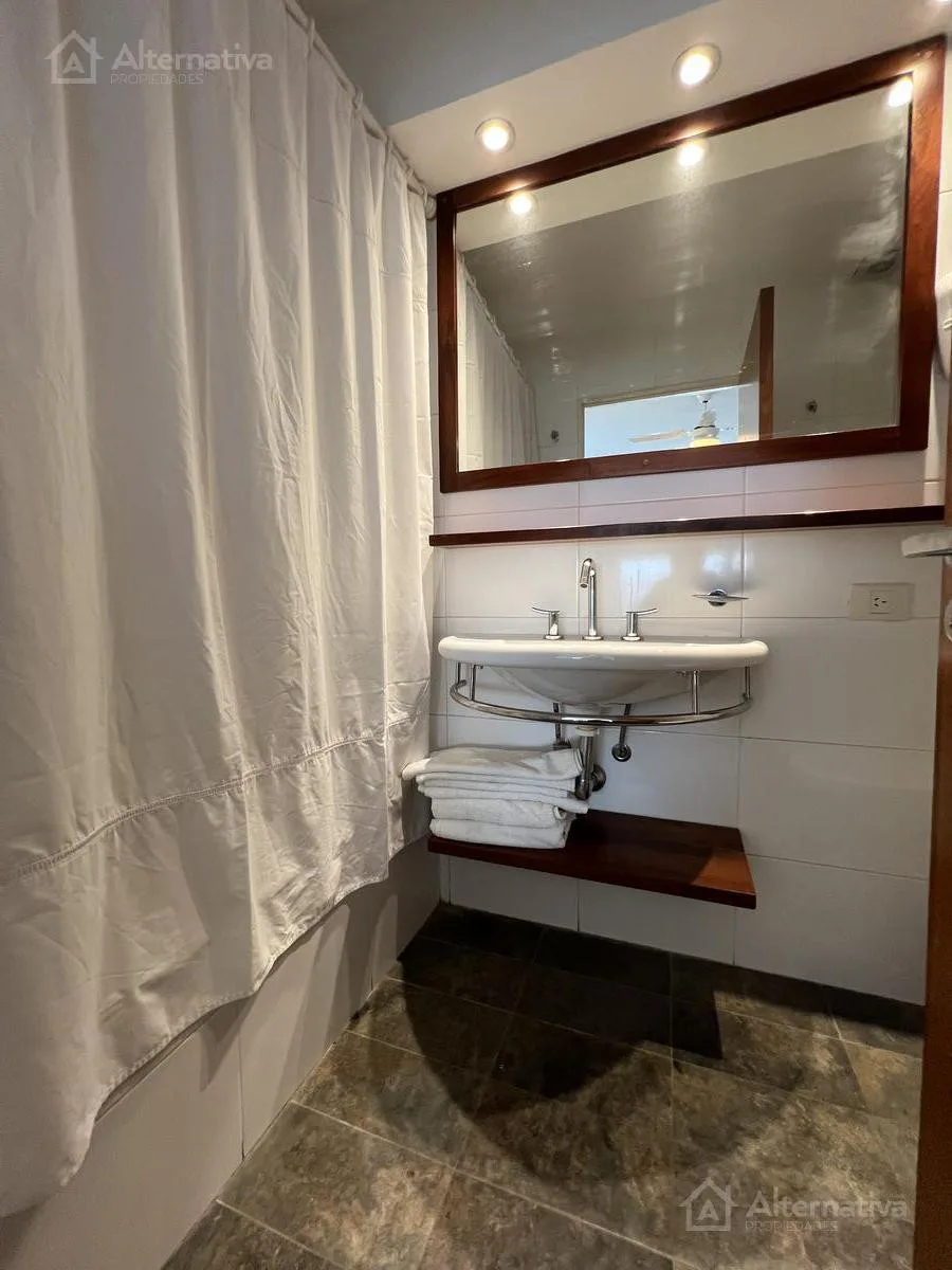 Apartamento duplex com 1 quarto, mobiliado, em San Telmo. No piso principal há mesa com 4 cadeiras, sofá de 3 lugares, rack com Smart TV, lavabo, ar-condicionado, Wi-Fi e acesso à varanda. A cozinha é integrada e vem equipada com cooktop elétrico de 2 bocas, geladeira com freezer, micro-ondas, chaleira elétrica e torradeira. No piso superior ficam as duas camas individuais, armário, ventilador e banheiro em suíte completo com banheira. O prédio tem SUM e área de churrasco. O aluguel inclui condo