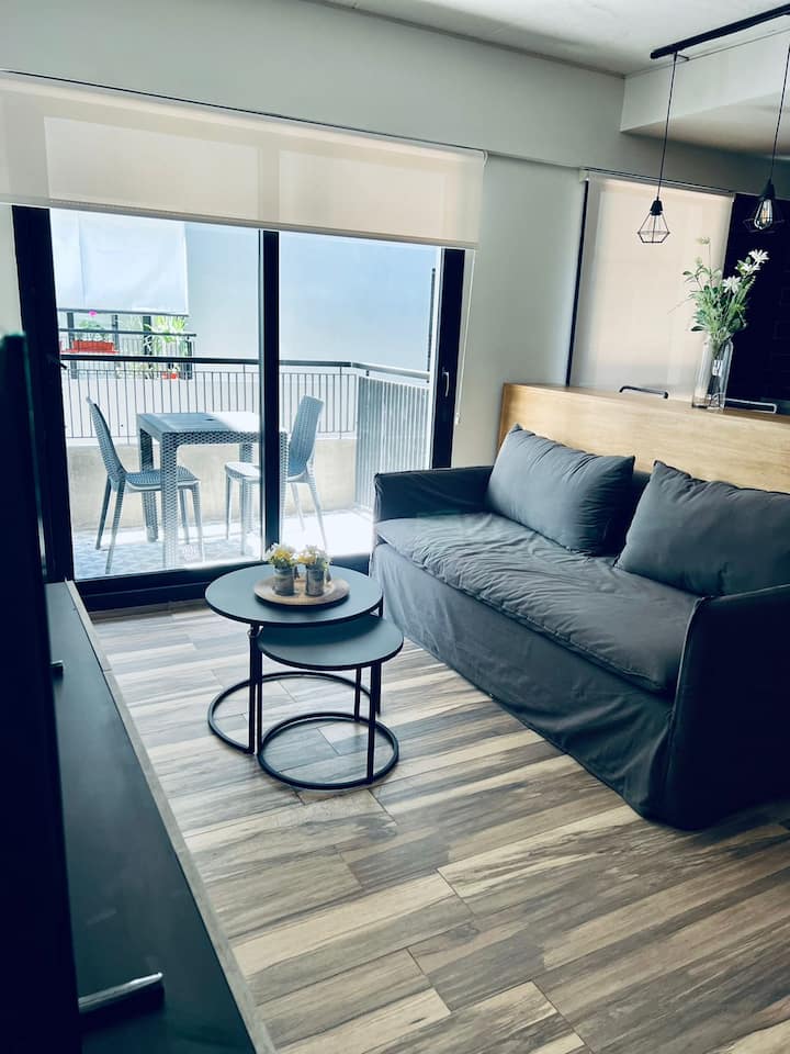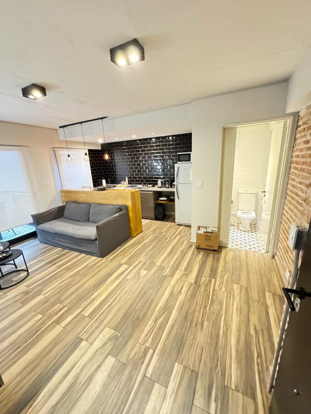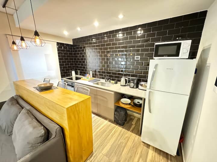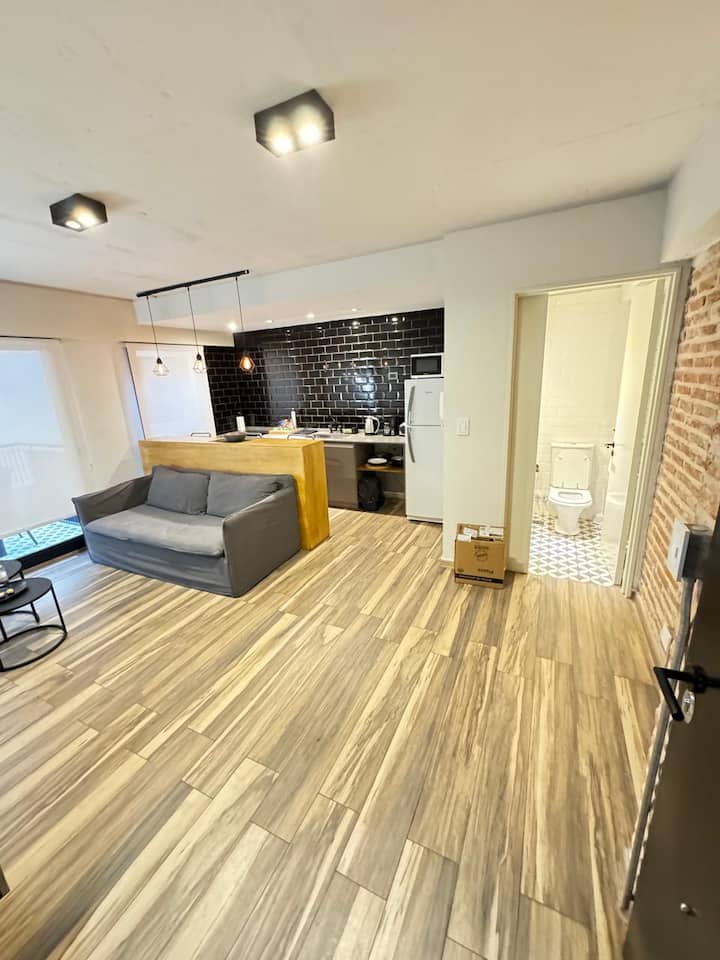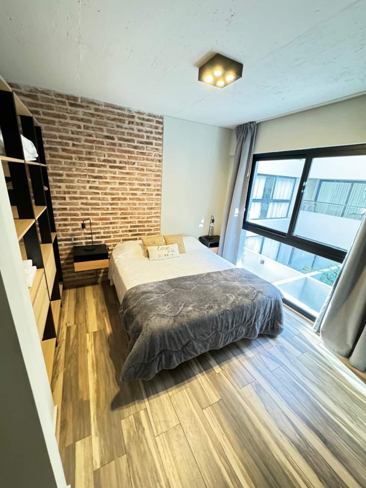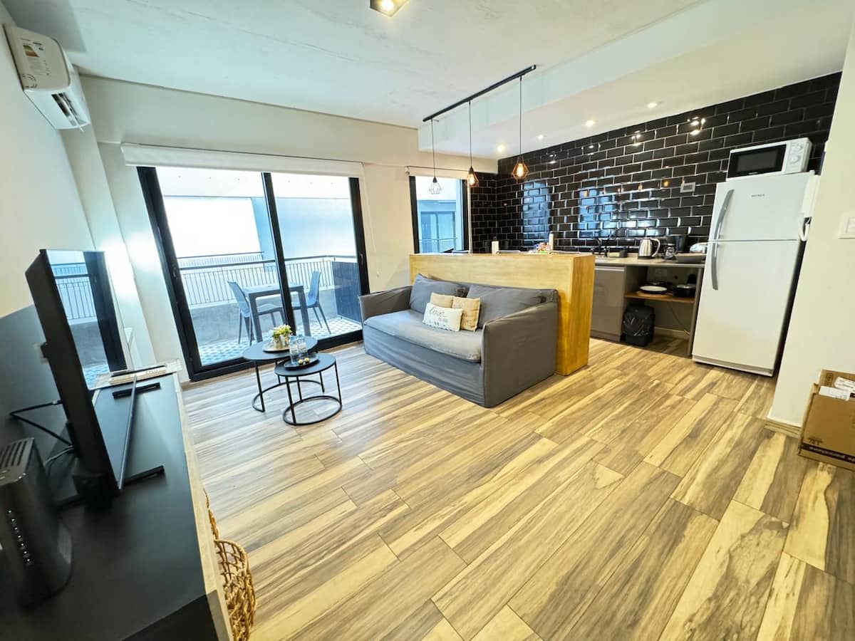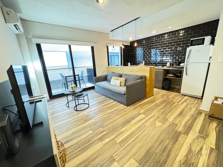 Apartamento novo de 1 quarto em San Telmo, com 50 m², incluindo quarto com cama de casal, banheiro completo, lavabo, cozinha integrada, sala com sofá-cama e varanda. O imóvel é mobiliado e está equipado com 2 Smart TVs, ar-condicionado, cozinha com micro-ondas, torradeira, forno, fogão e geladeira, além de WiFi. O prédio conta com piscina, academia, terraço com solário, área de lavanderia e concierge 24 horas.
