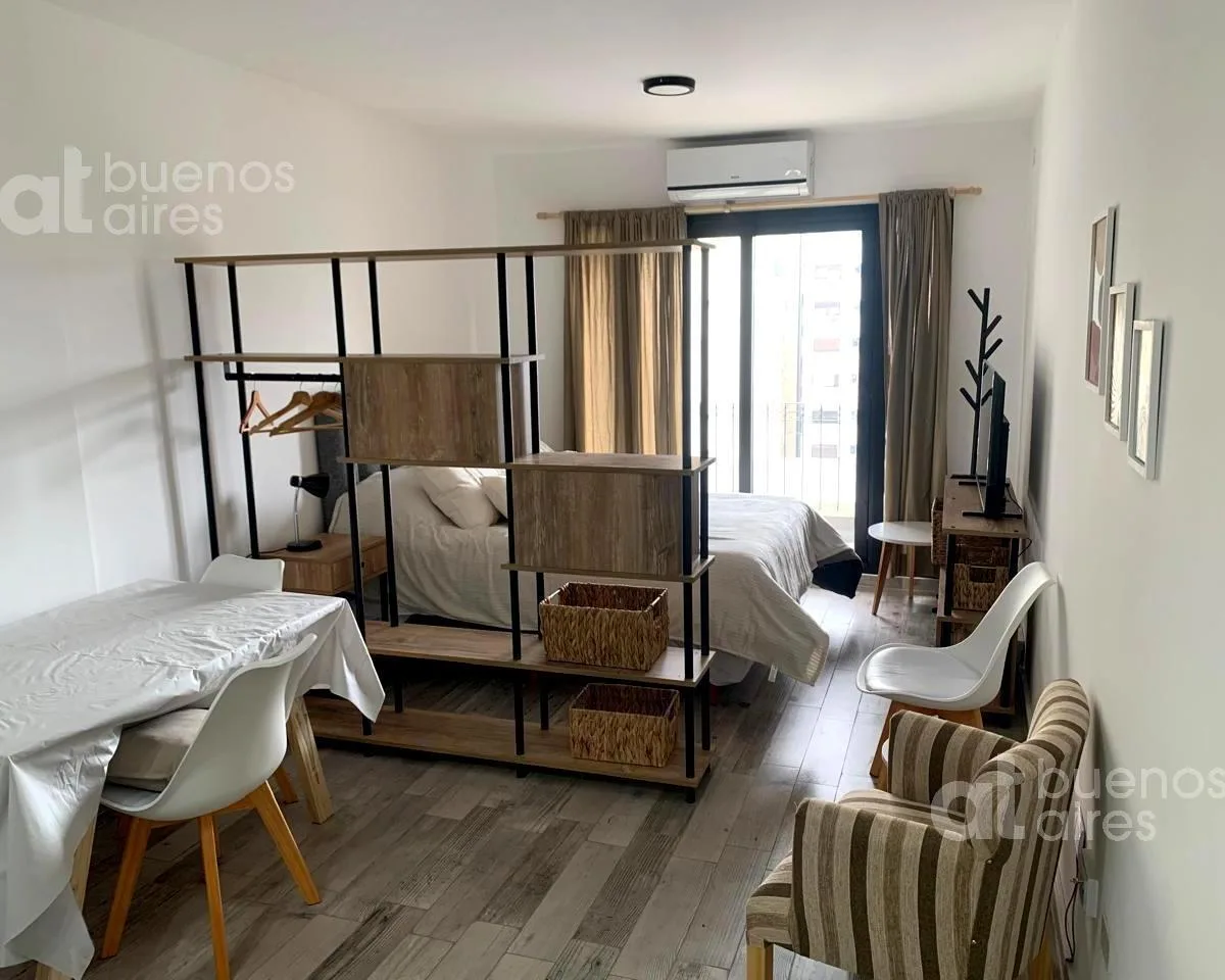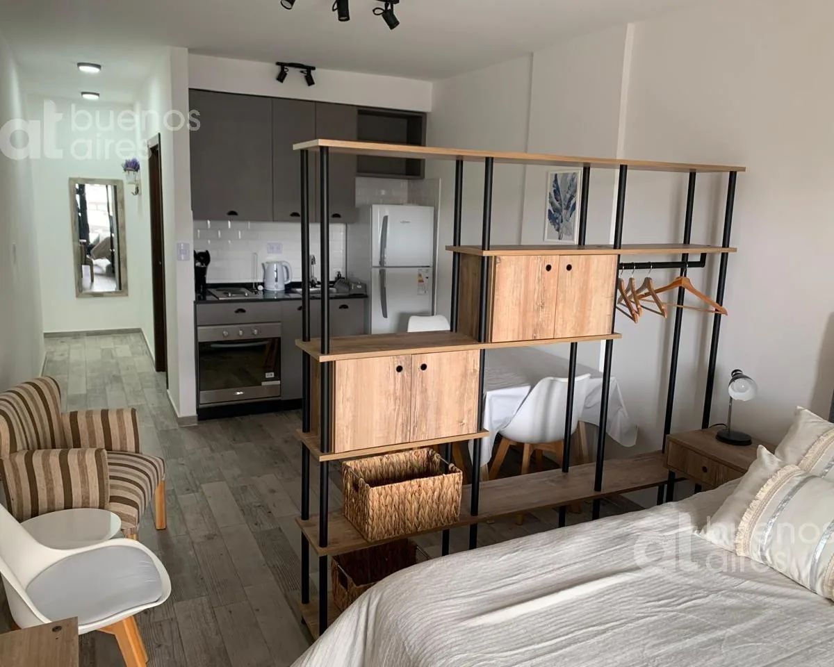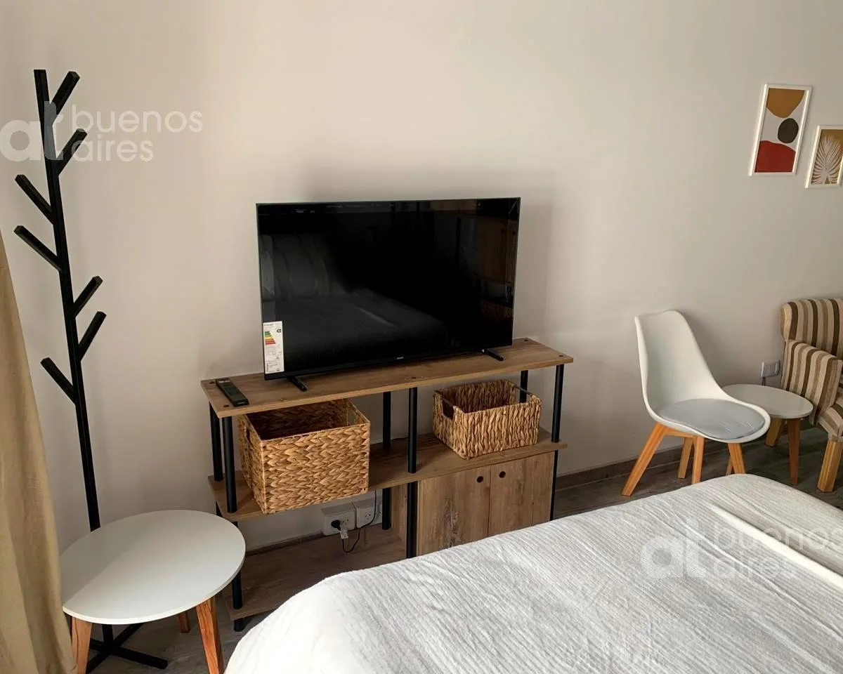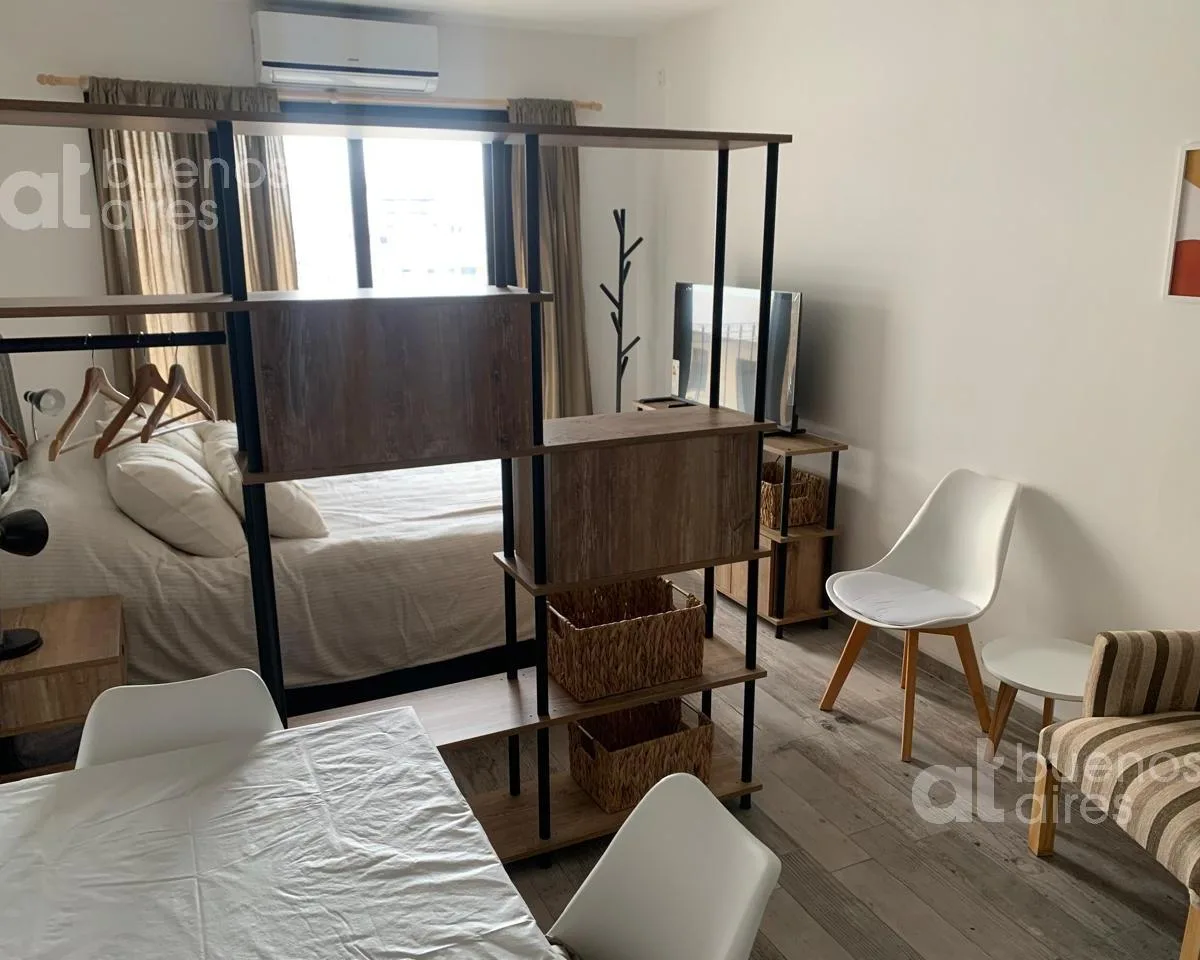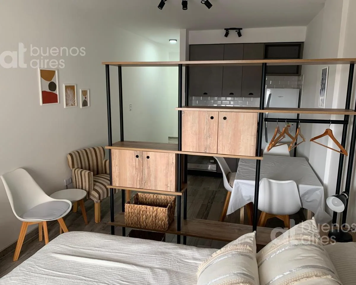 Kitnet (1 ambiente) novo (nunca habitado) no contrafundo, com varanda, em San Telmo, a uma quadra de Plaza Dorrego. Unidade mobiliada e equipada, com janelas com vidro duplo (DVH) e carpintarias e torneiras de qualidade; inclui ar-condicionado frio/calor. O edifício tem jacuzzi e solário; o valor divulgado é “tudo incluído” (exceto luz e internet). Para entrar: 1 mês de adiantamento, 1 mês de depósito e despesas administrativas.