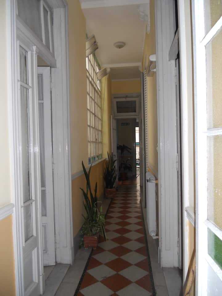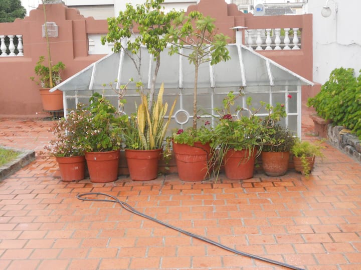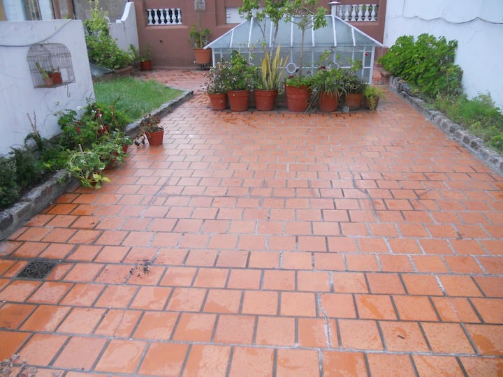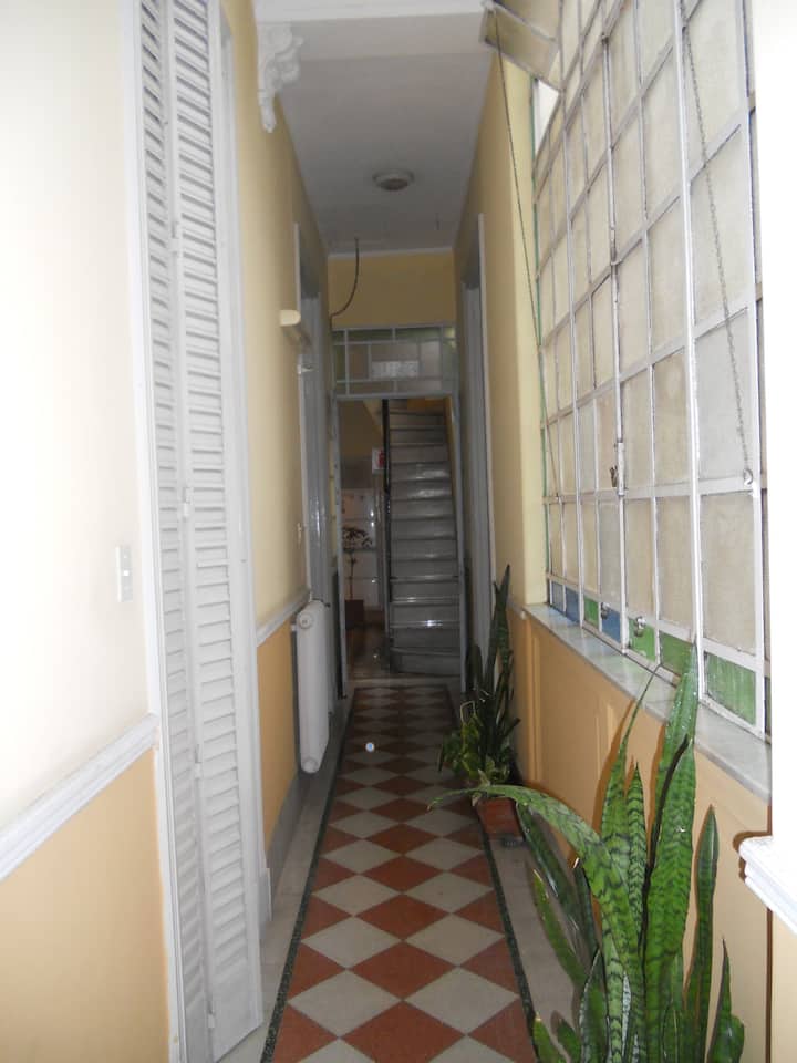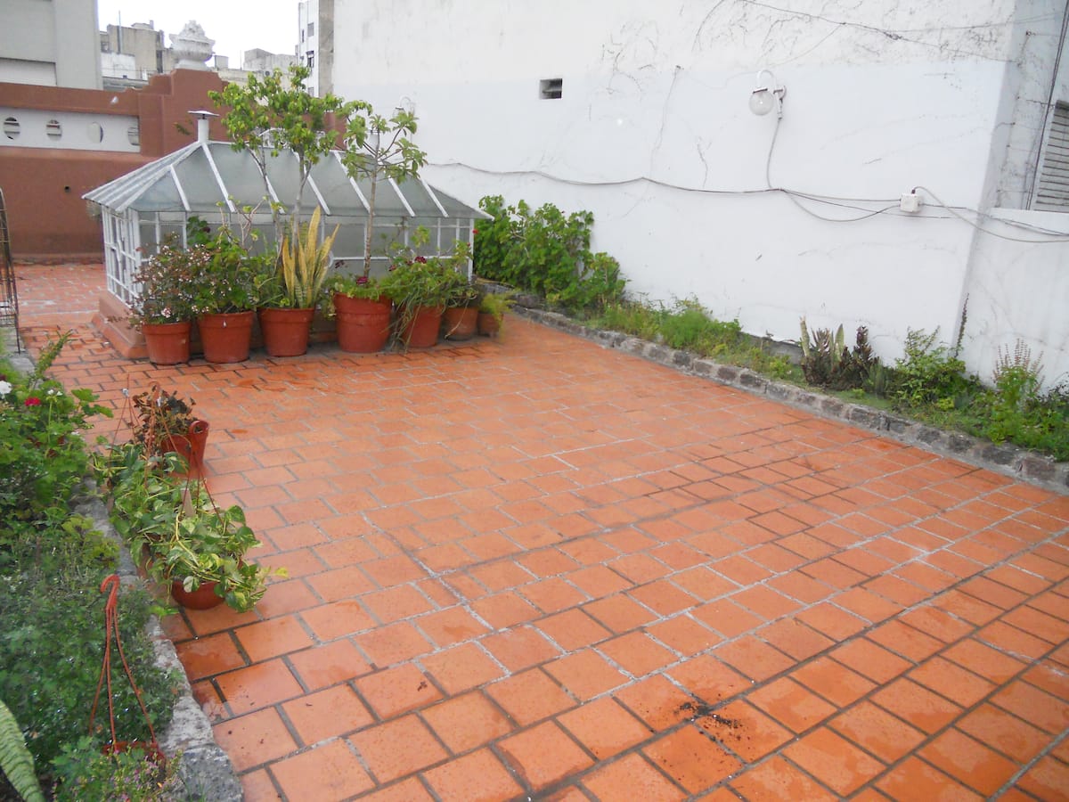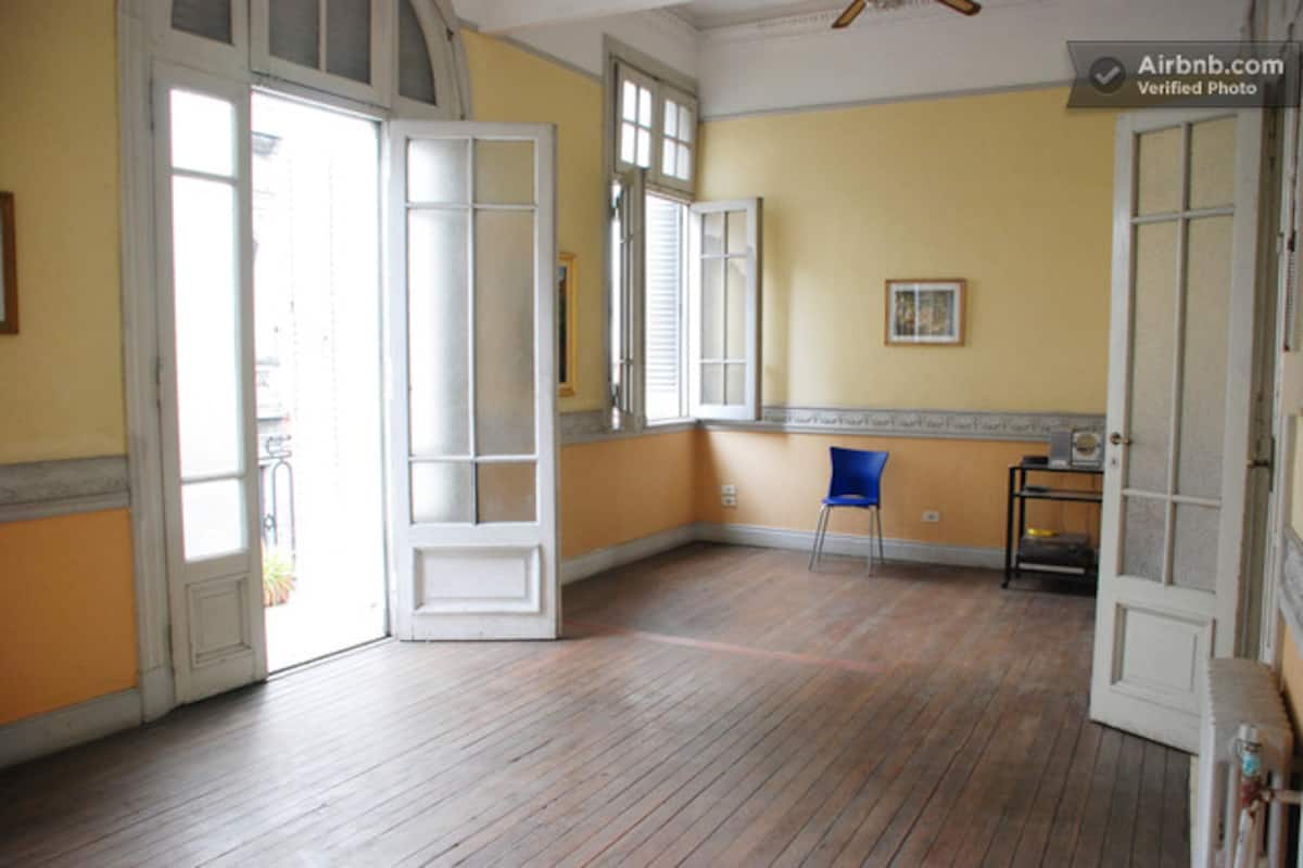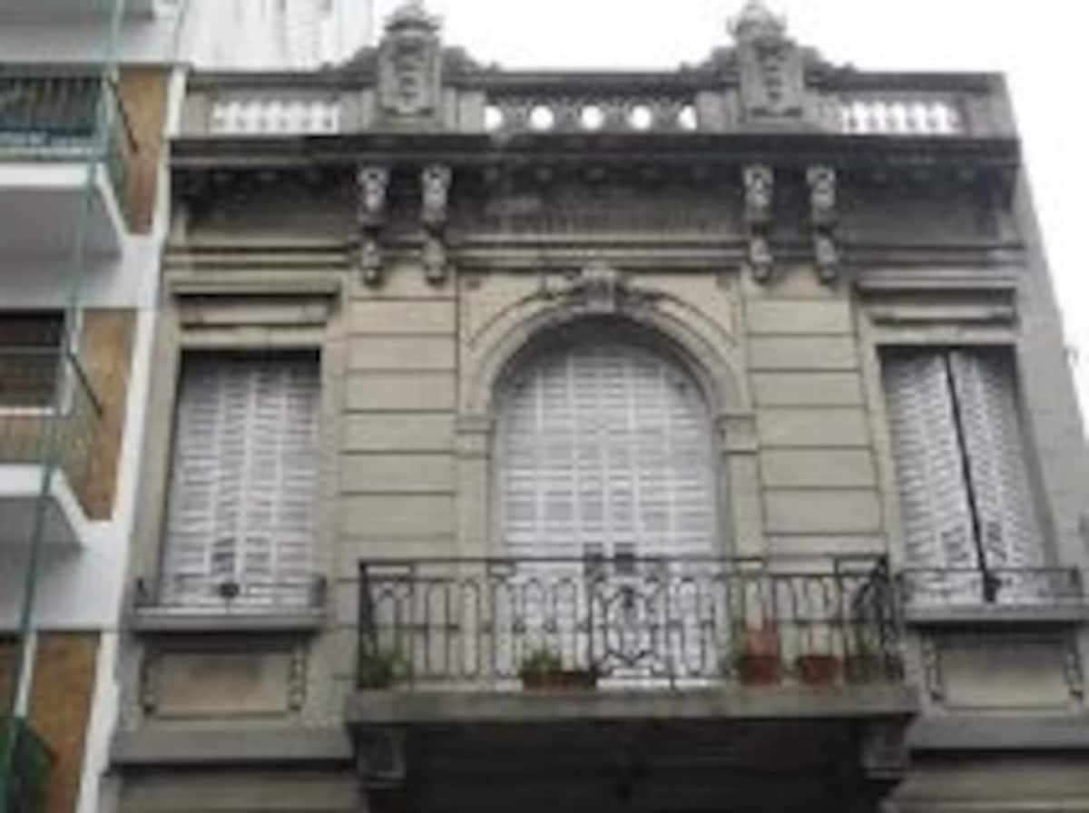 Casa em San Telmo, no Casco Histórico, com três níveis. Acomodações em uma casa de 1919 em estilo Art Nouveau, com detalhes originais, cozinha compartilhada, sala de jantar com TV, Wi-Fi e biblioteca, além de 7 quartos (4 duplos e 3 individuais) e 3 banheiros. No terceiro andar há um terraço de 140 m² com jardim e área de churrasco (parrilla), com forno para assar pizza ou pão, além de lavanderia com espaço para lavar e secar roupas. O imóvel tem salão de festas de 40 m² para hóspedes e varanda.