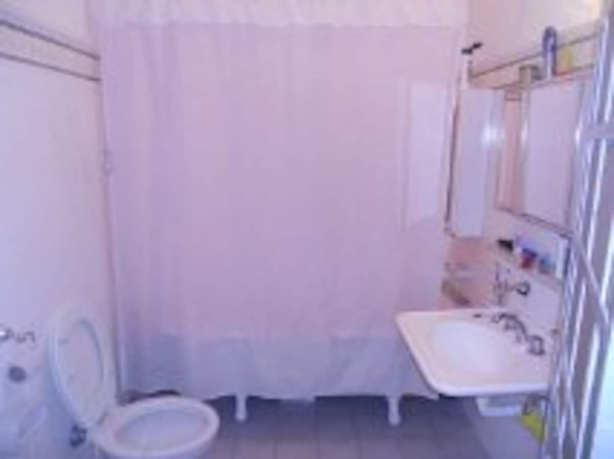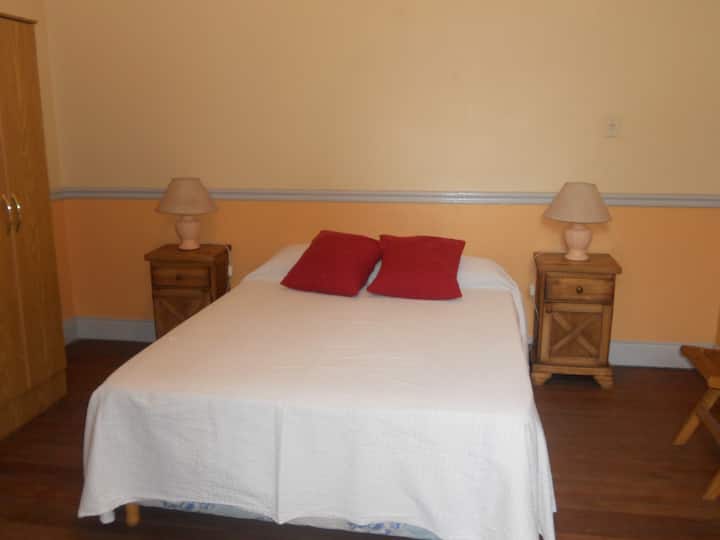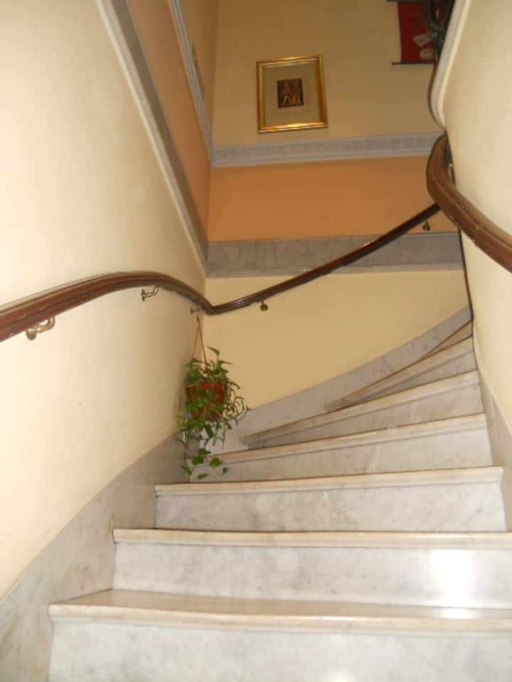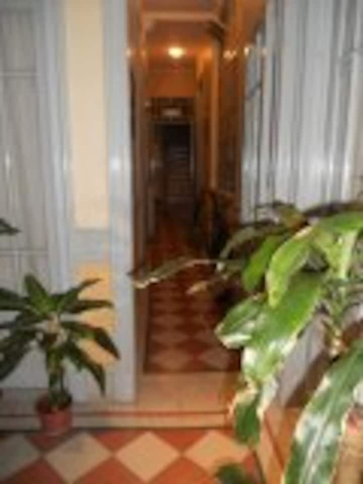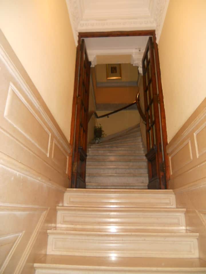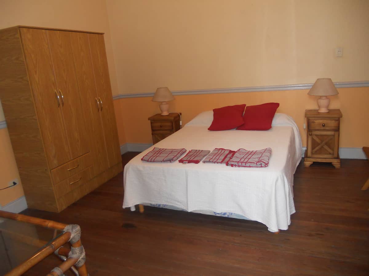 Casa em San Telmo, no Casco Histórico, com três níveis. Acomodações em uma casa de 1919 em estilo Art Nouveau, com detalhes originais, cozinha compartilhada, sala de jantar com TV, Wi-Fi e biblioteca, além de 7 quartos (4 duplos e 3 individuais) e 3 banheiros. No terceiro andar há um terraço de 140 m² com jardim e área de churrasco (parrilla), com forno para assar pizza ou pão, além de lavanderia com espaço para lavar e secar roupas. O imóvel tem salão de festas de 40 m² para hóspedes e varanda.