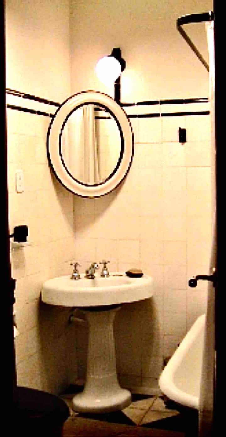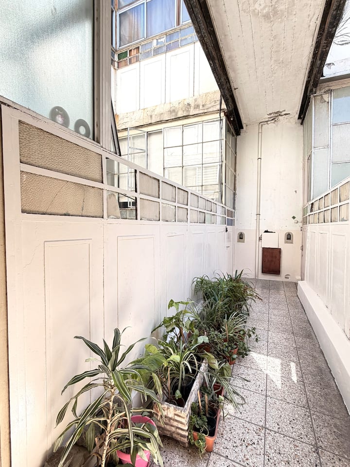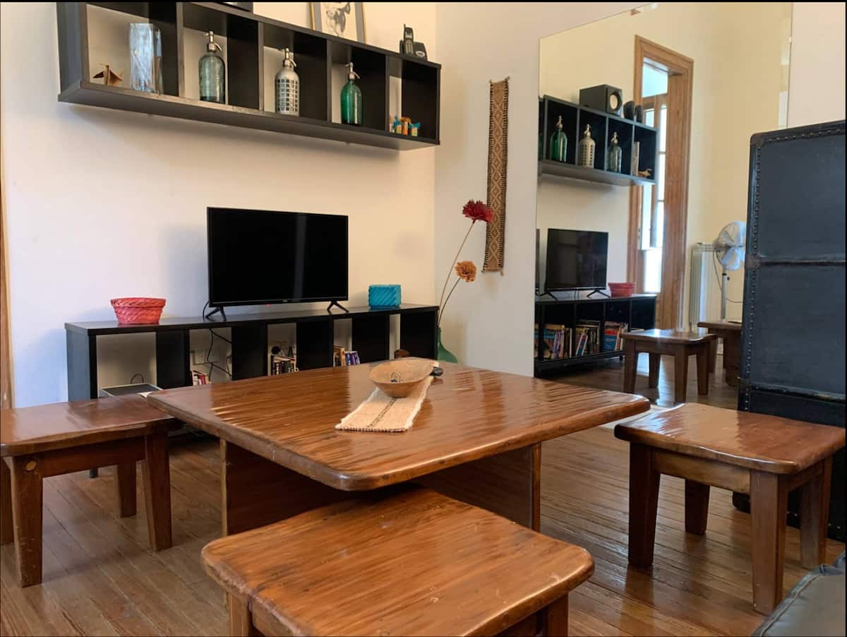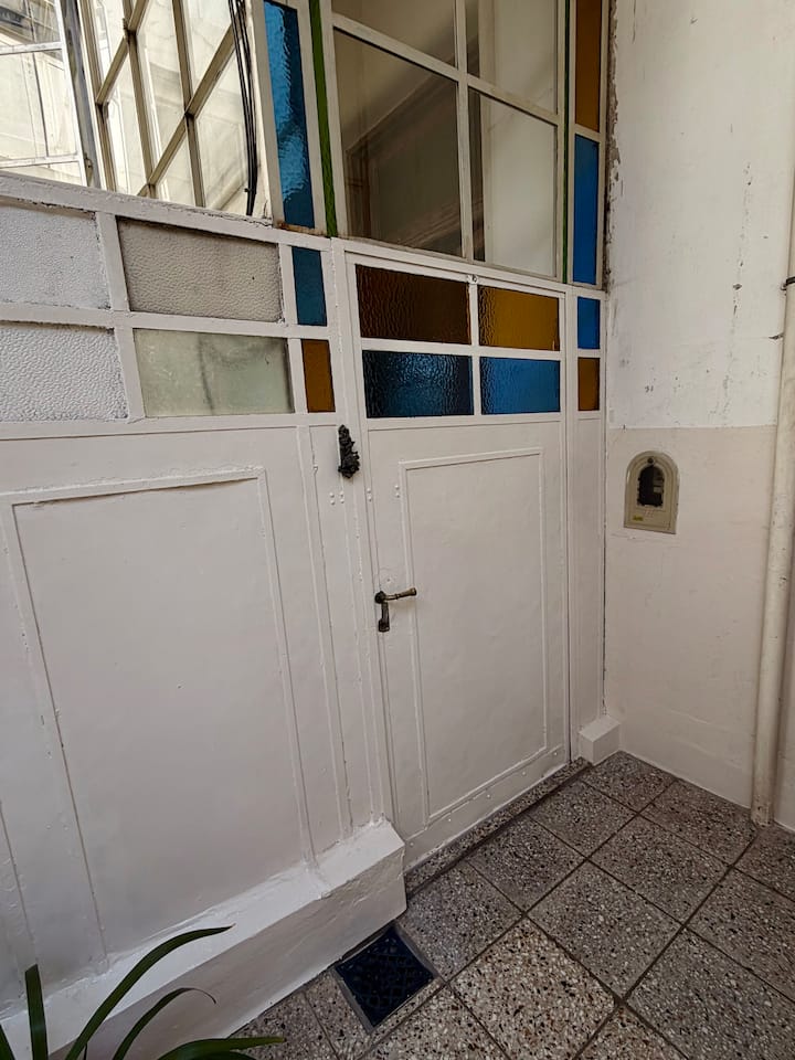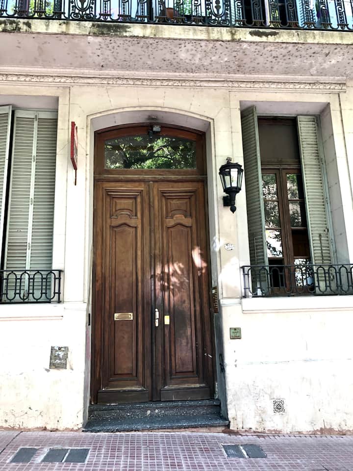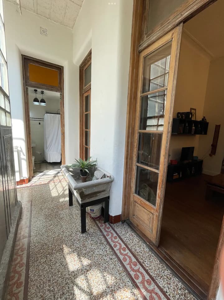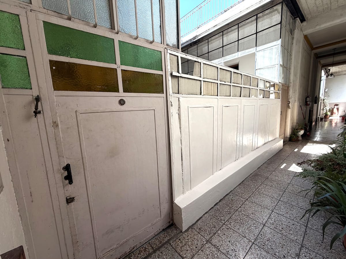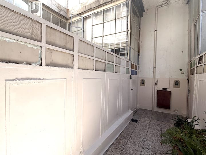 Apartamento de 1 quarto com 53 m² no 1º andar, em prédio residencial do fim do século XIX com elevador, em San Telmo. Unidade em PH com acesso a um pátio interno e portas de correr em madeira com estilo francês ligando quarto, sala, banheiro e cozinha ao pátio. Cozinha com forno elétrico pequeno e 2 fogões elétricos; aquecimento elétrico. A partir do início de setembro há obras no edifício com substituição de tubulações de gás; a unidade funciona totalmente com energia elétrica. Inclui cozinha e