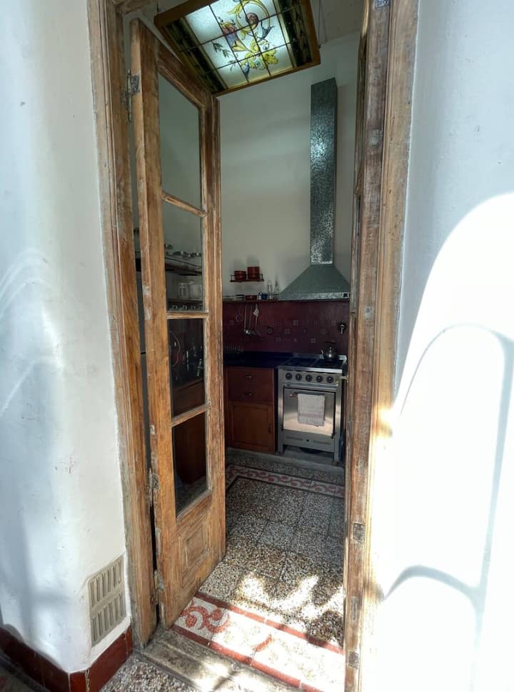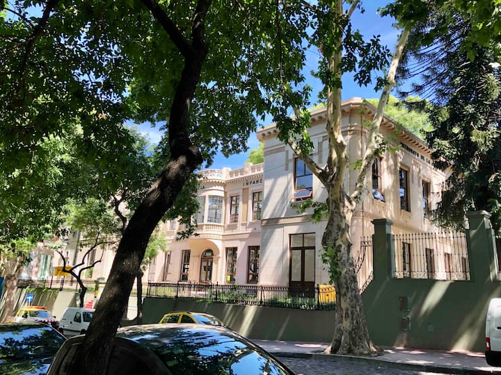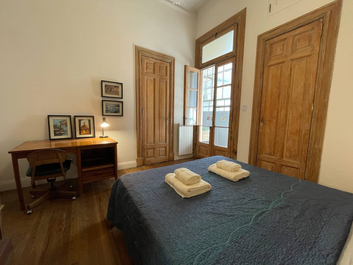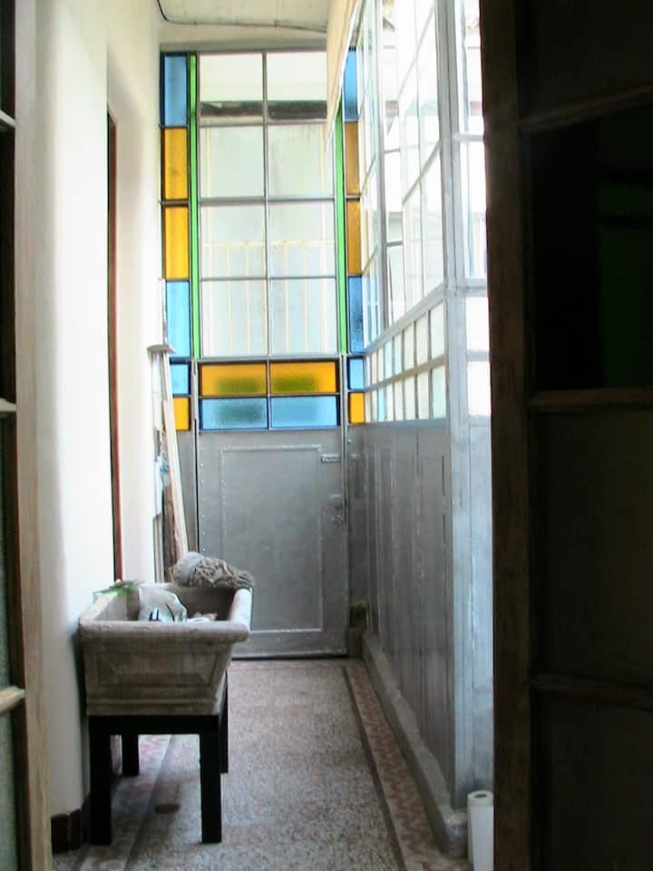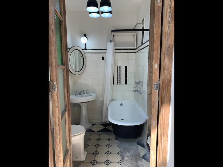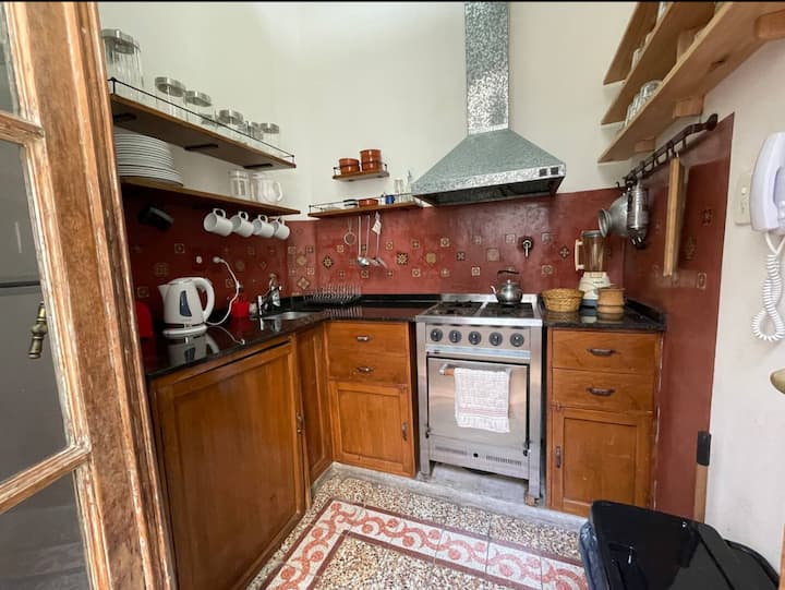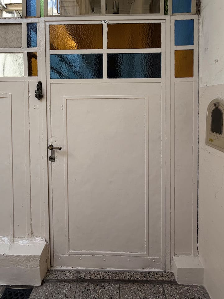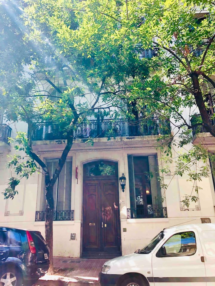 Apartamento de 1 quarto com 53 m² no 1º andar, em prédio residencial do fim do século XIX com elevador, em San Telmo. Unidade em PH com acesso a um pátio interno e portas de correr em madeira com estilo francês ligando quarto, sala, banheiro e cozinha ao pátio. Cozinha com forno elétrico pequeno e 2 fogões elétricos; aquecimento elétrico. A partir do início de setembro há obras no edifício com substituição de tubulações de gás; a unidade funciona totalmente com energia elétrica. Inclui cozinha e