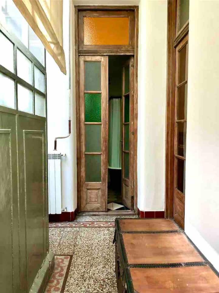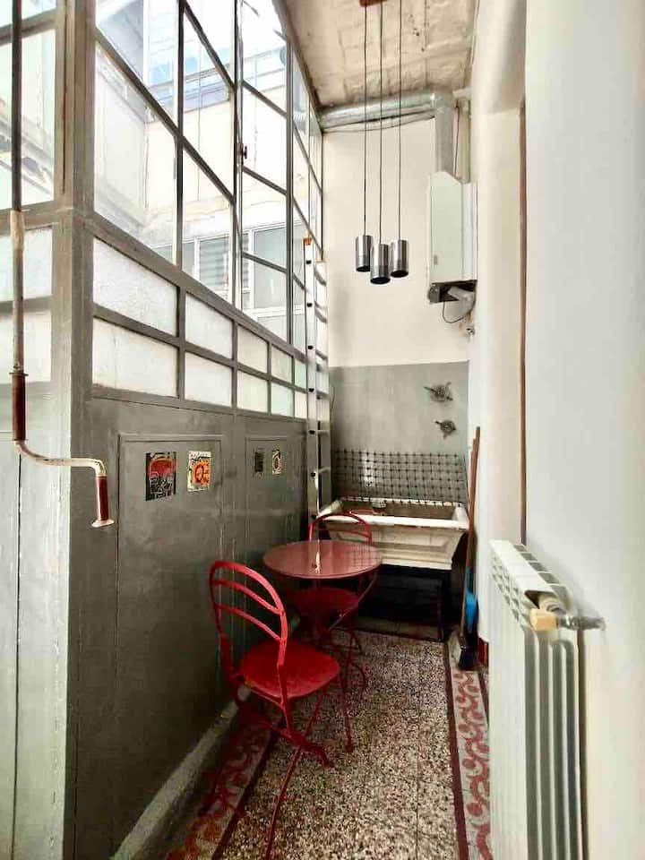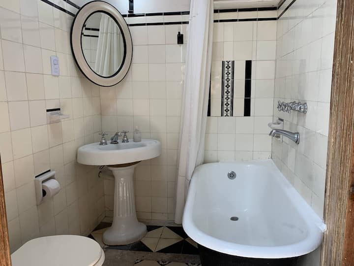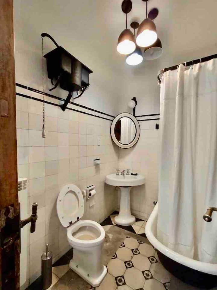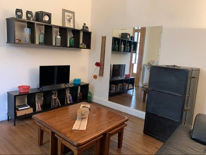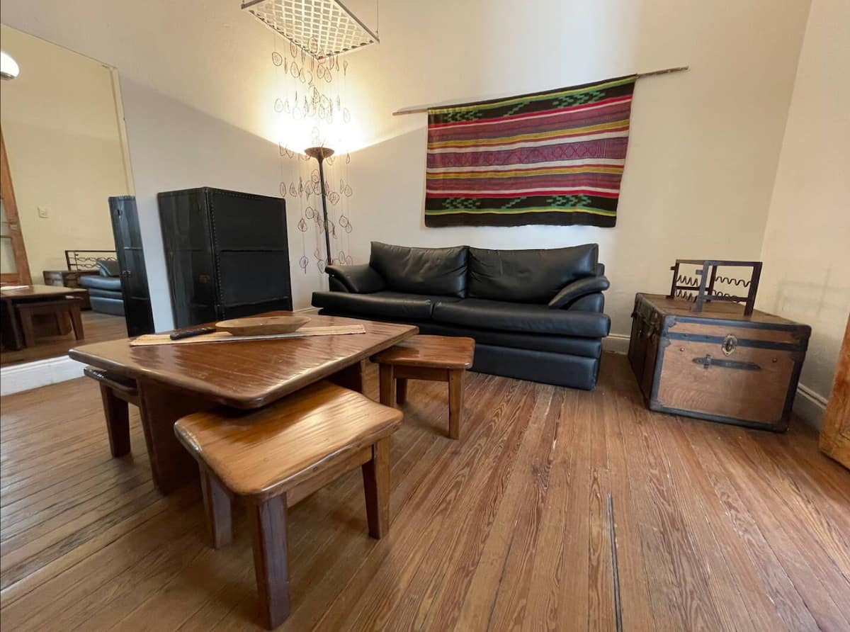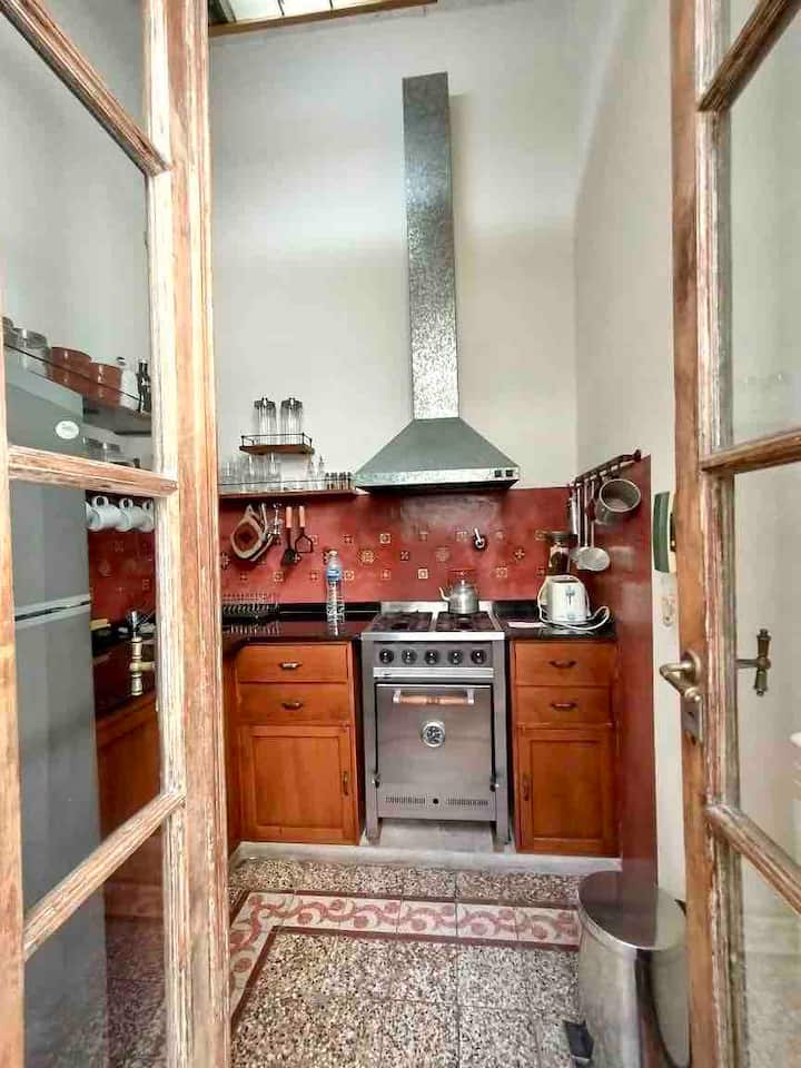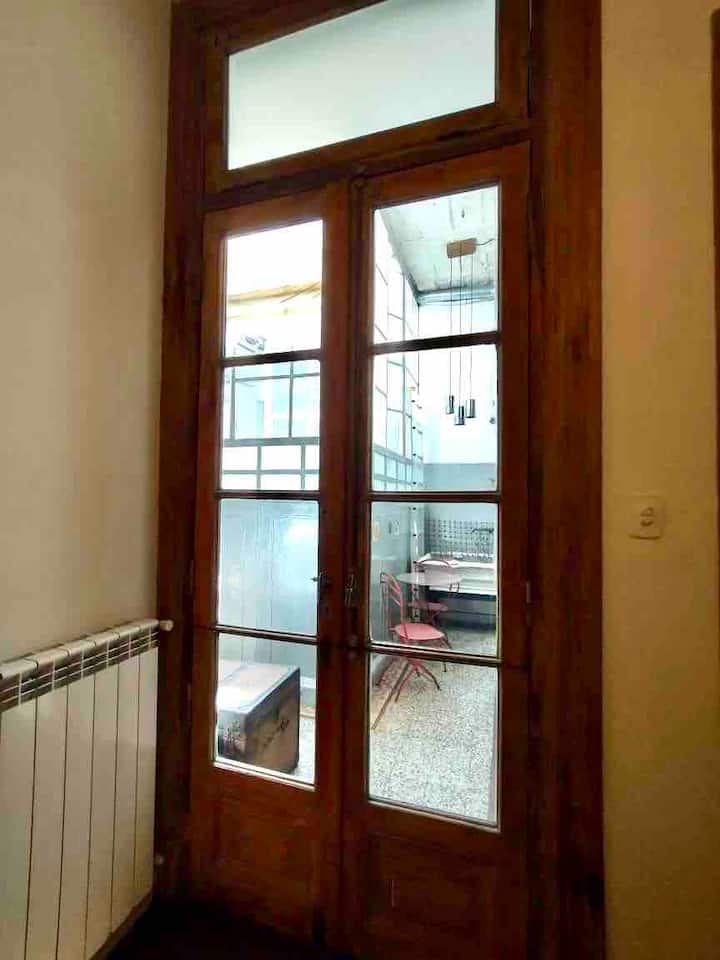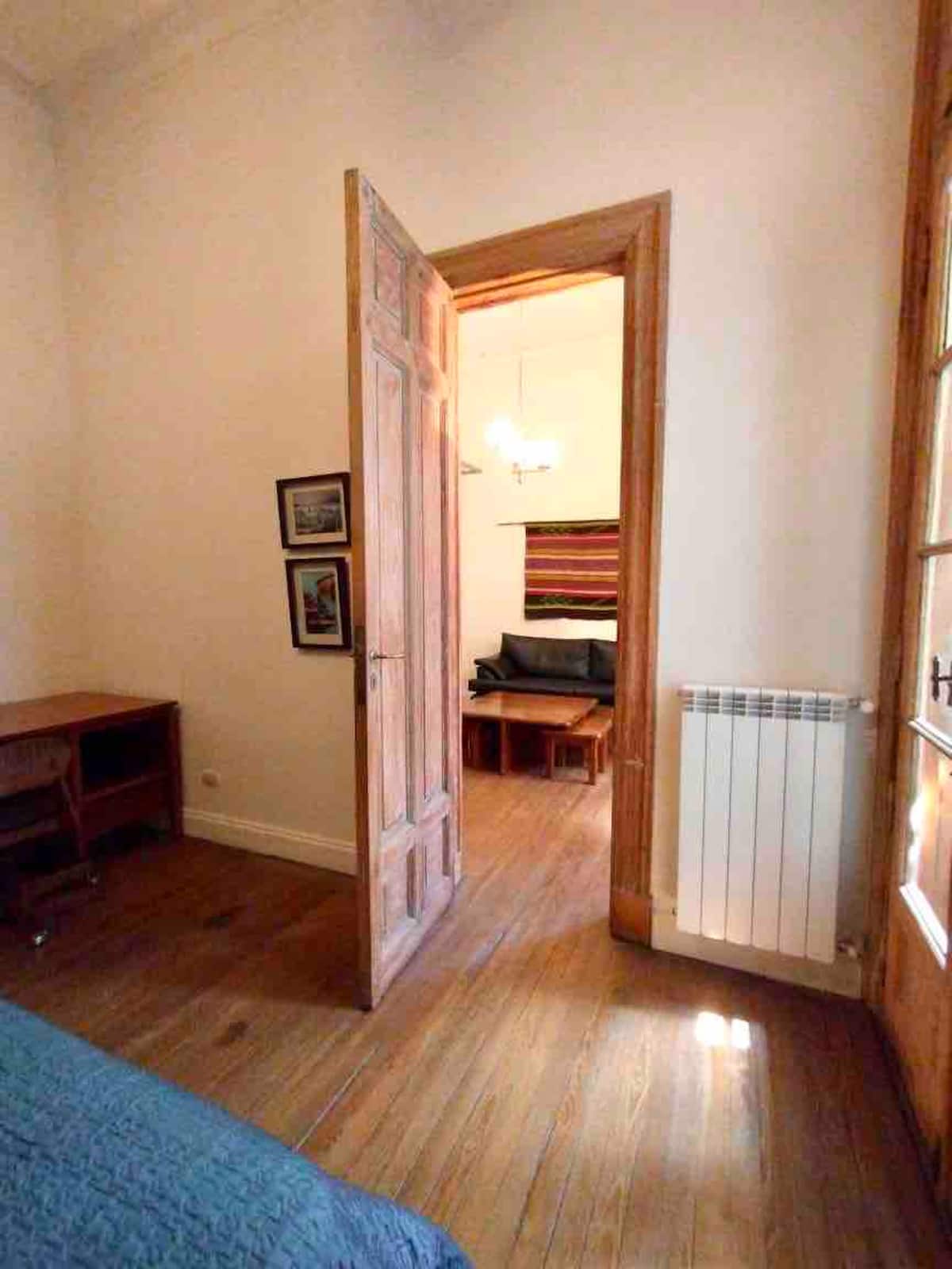 Apartamento de 1 quarto com 53 m² no 1º andar, em prédio residencial do fim do século XIX com elevador, em San Telmo. Unidade em PH com acesso a um pátio interno e portas de correr em madeira com estilo francês ligando quarto, sala, banheiro e cozinha ao pátio. Cozinha com forno elétrico pequeno e 2 fogões elétricos; aquecimento elétrico. A partir do início de setembro há obras no edifício com substituição de tubulações de gás; a unidade funciona totalmente com energia elétrica. Inclui cozinha e