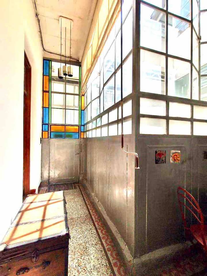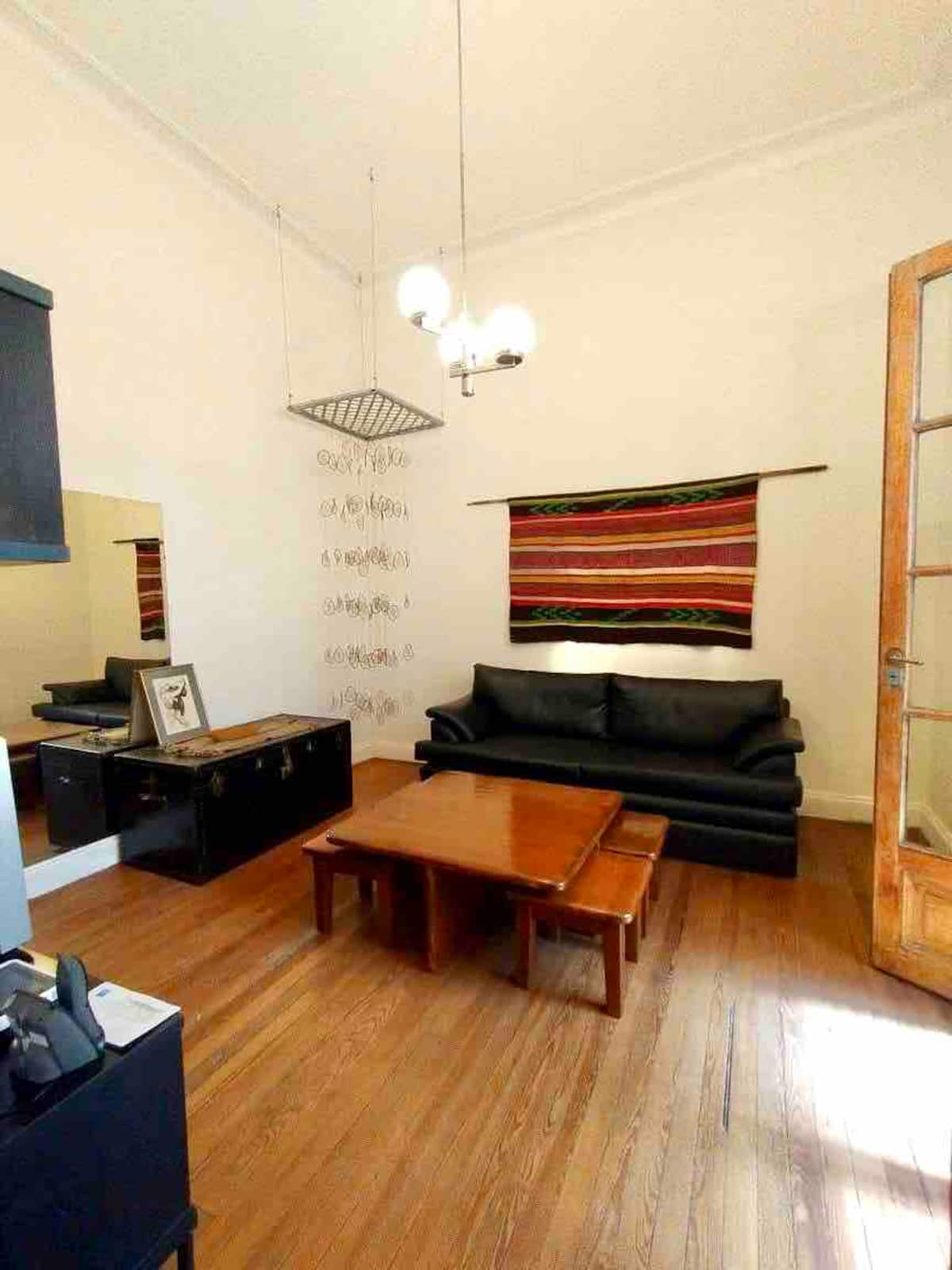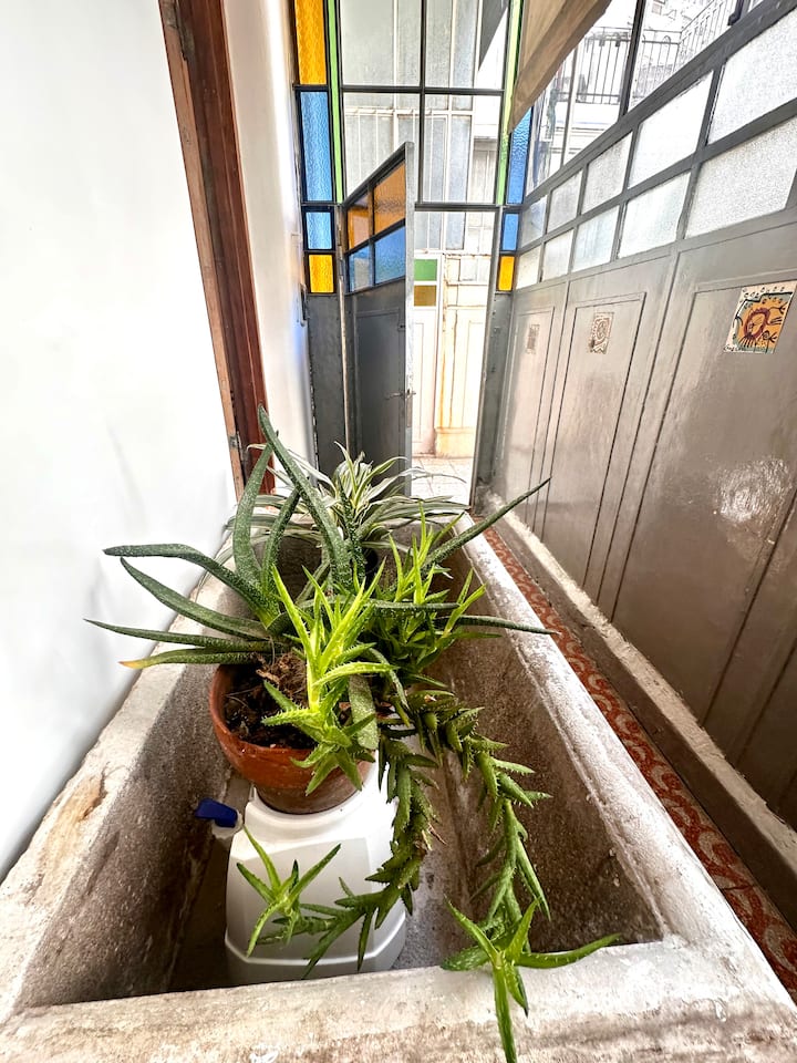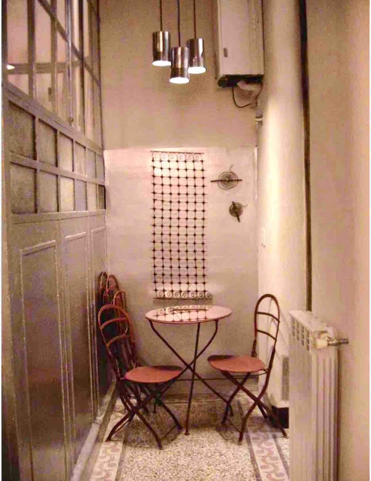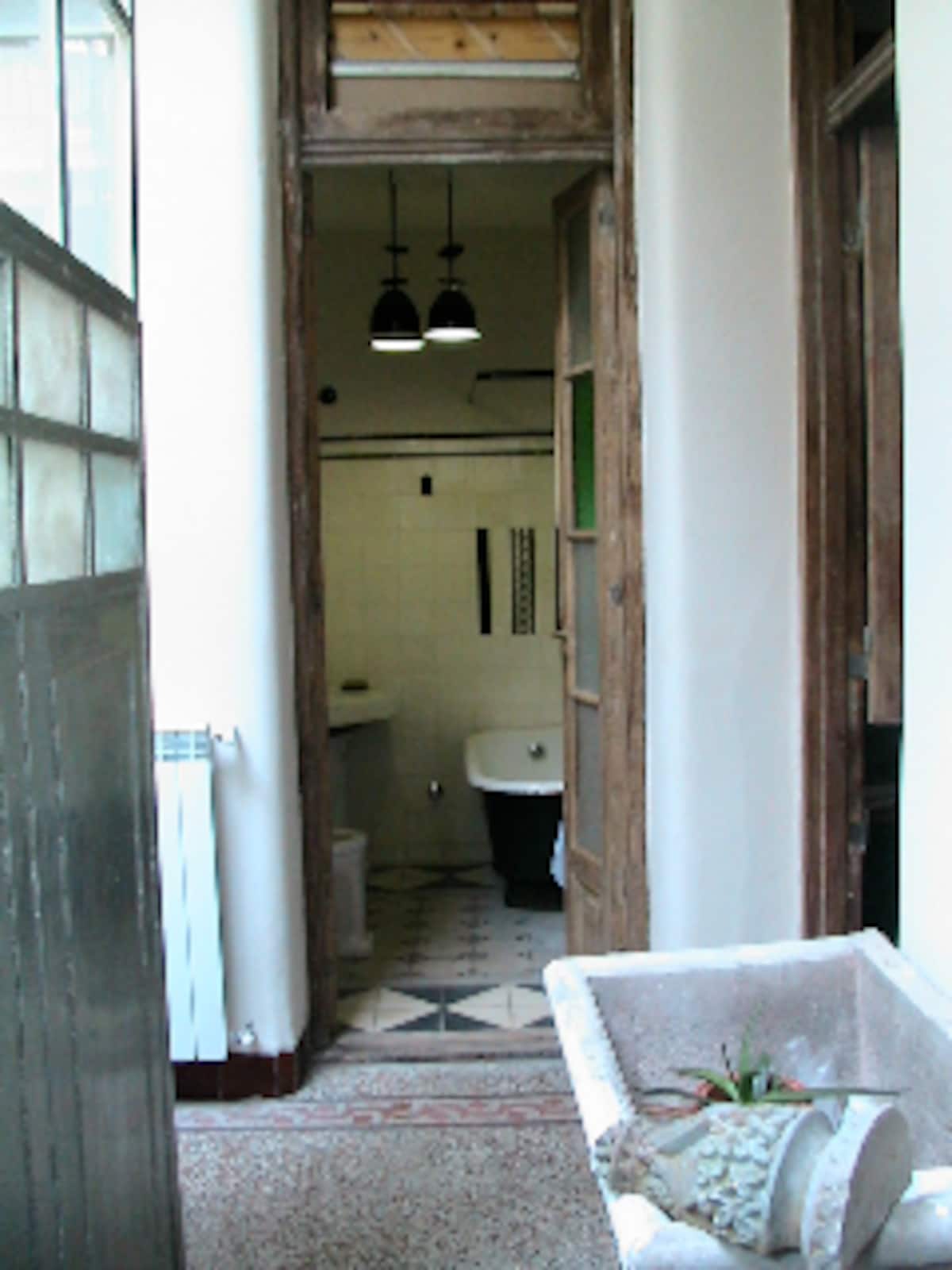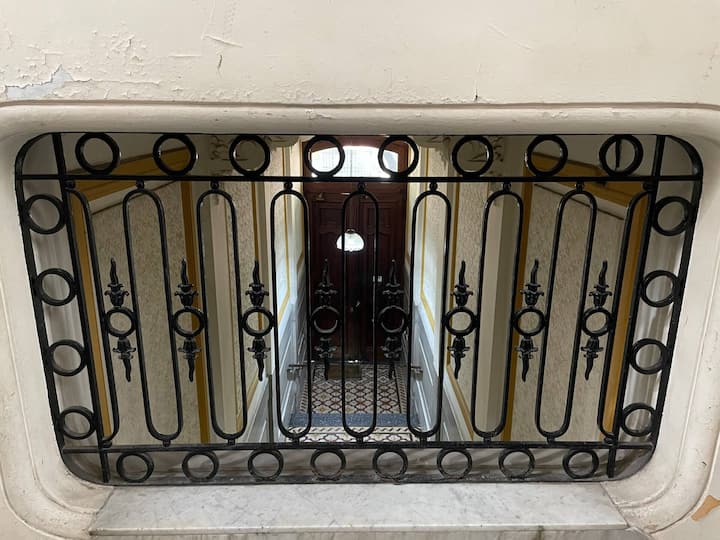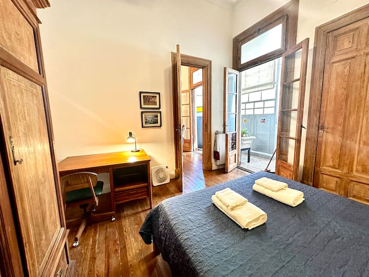 Apartamento de 1 quarto com 53 m² no 1º andar, em prédio residencial do fim do século XIX com elevador, em San Telmo. Unidade em PH com acesso a um pátio interno e portas de correr em madeira com estilo francês ligando quarto, sala, banheiro e cozinha ao pátio. Cozinha com forno elétrico pequeno e 2 fogões elétricos; aquecimento elétrico. A partir do início de setembro há obras no edifício com substituição de tubulações de gás; a unidade funciona totalmente com energia elétrica. Inclui cozinha e