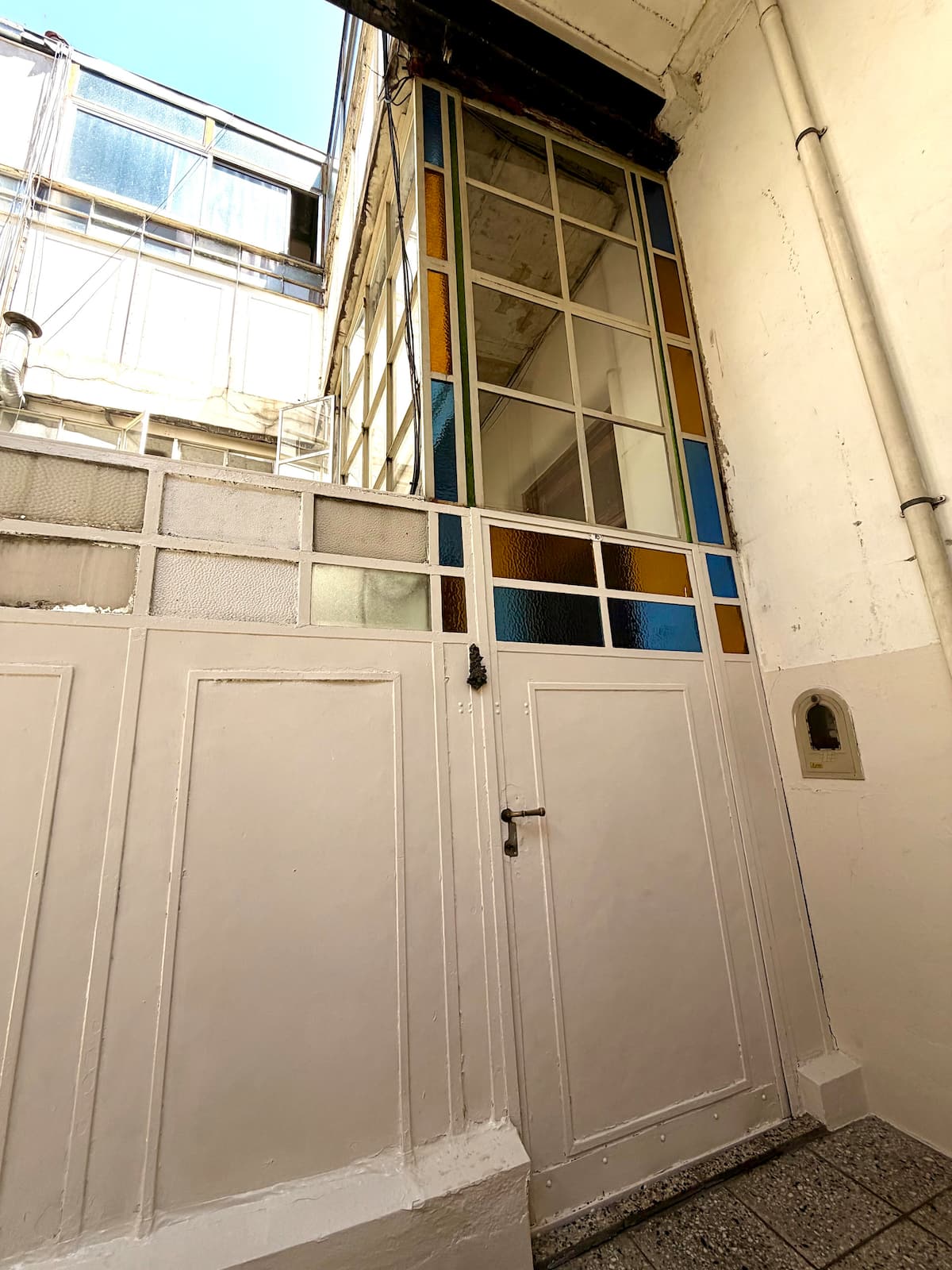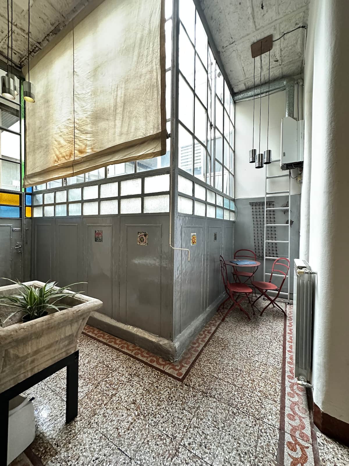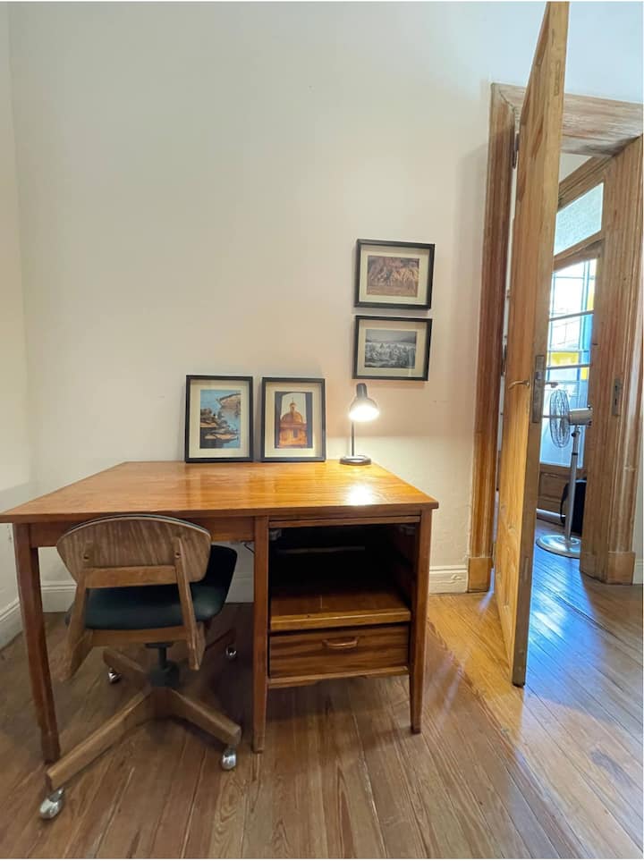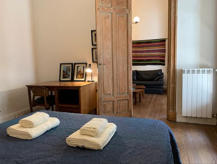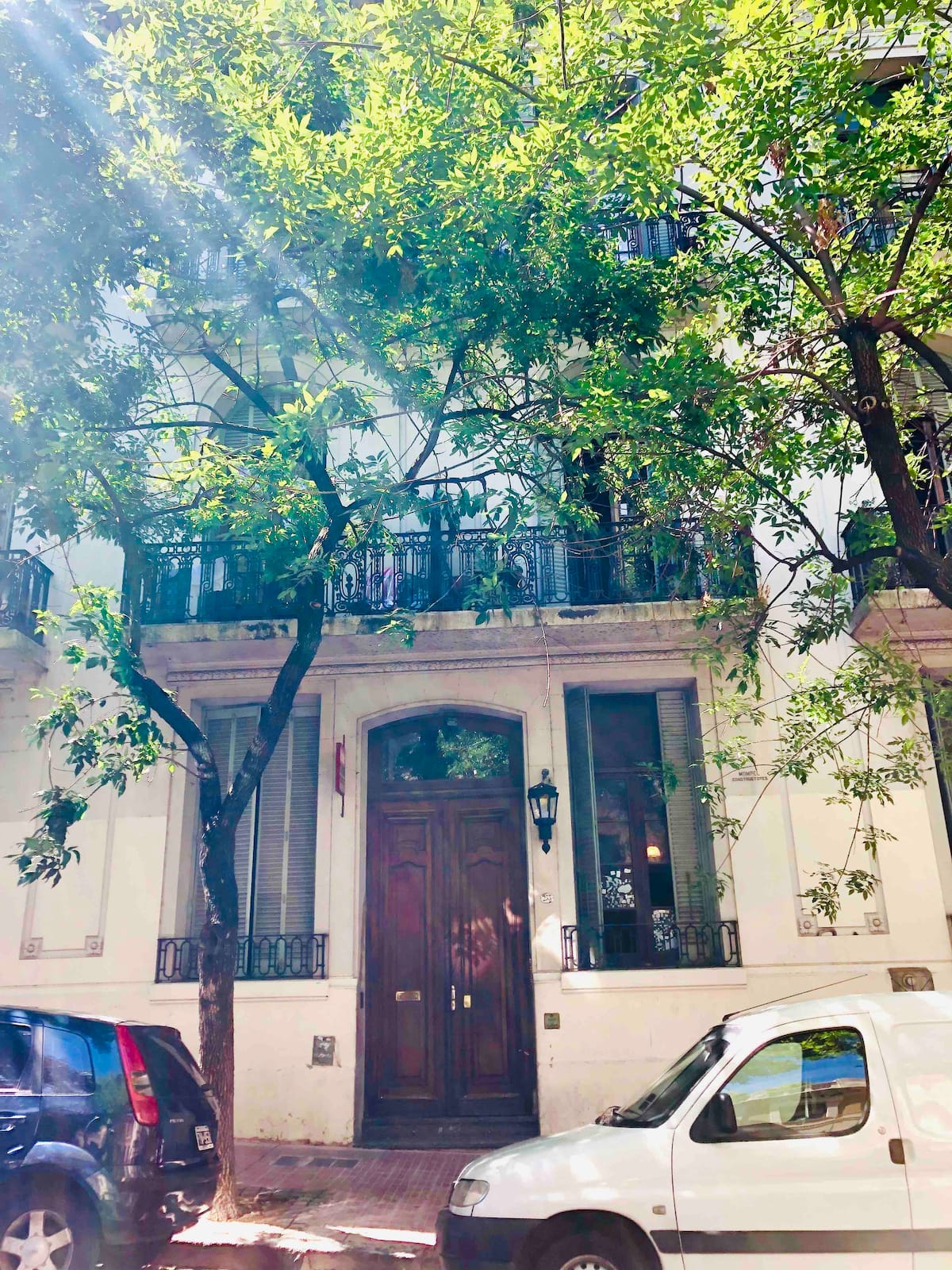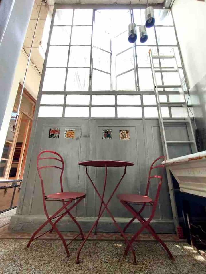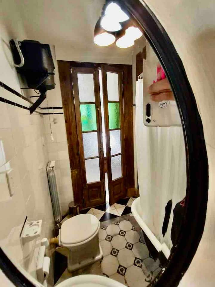 Apartamento de 1 quarto com 53 m² no 1º andar, em prédio residencial do fim do século XIX com elevador, em San Telmo. Unidade em PH com acesso a um pátio interno e portas de correr em madeira com estilo francês ligando quarto, sala, banheiro e cozinha ao pátio. Cozinha com forno elétrico pequeno e 2 fogões elétricos; aquecimento elétrico. A partir do início de setembro há obras no edifício com substituição de tubulações de gás; a unidade funciona totalmente com energia elétrica. Inclui cozinha e