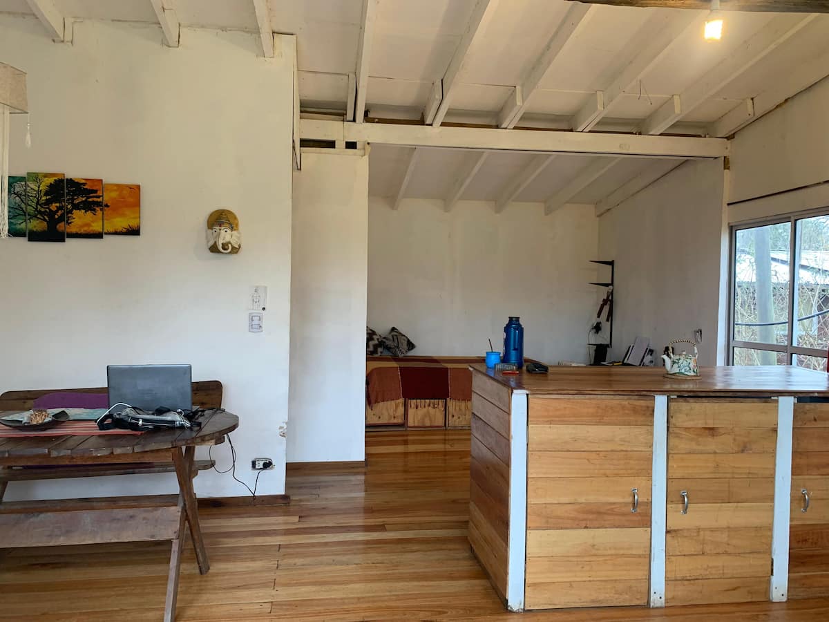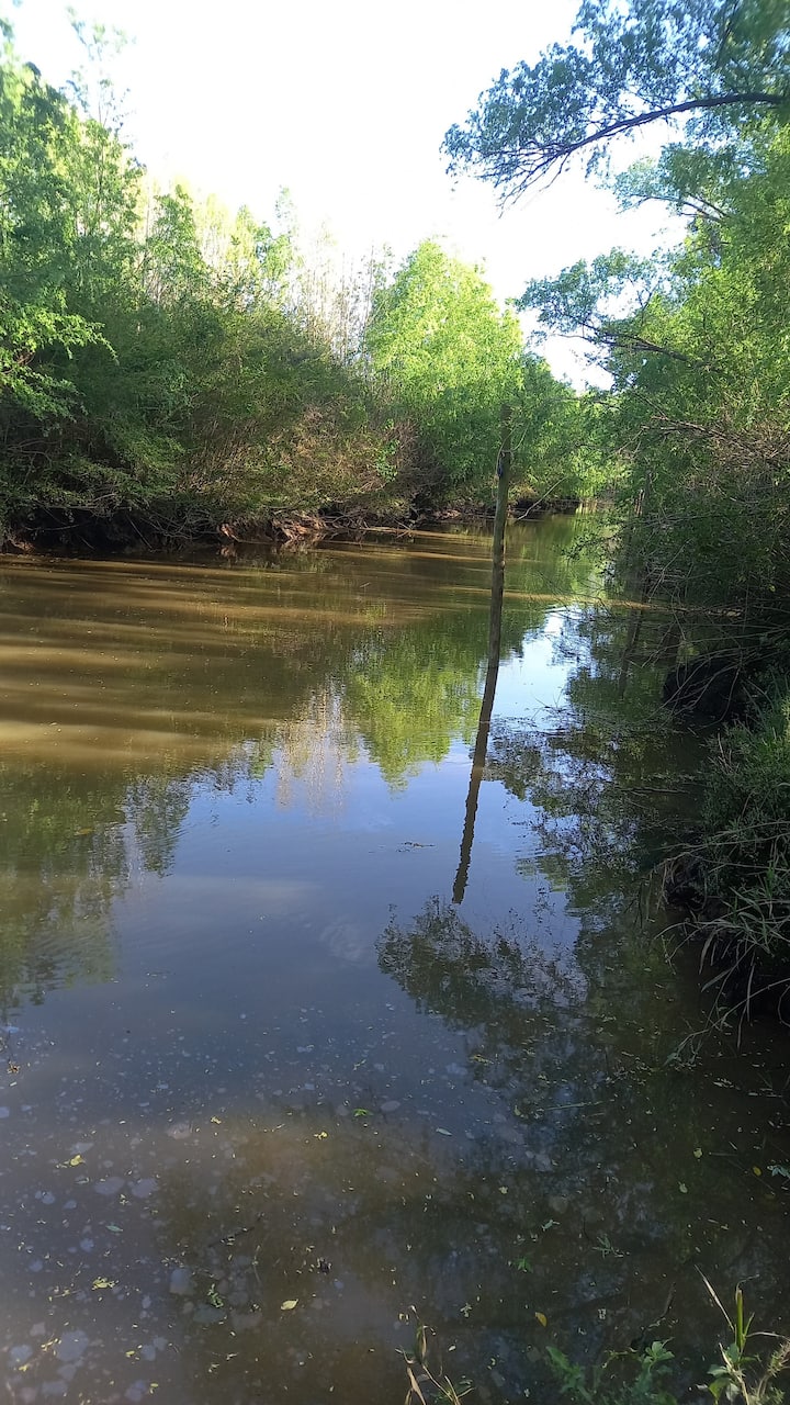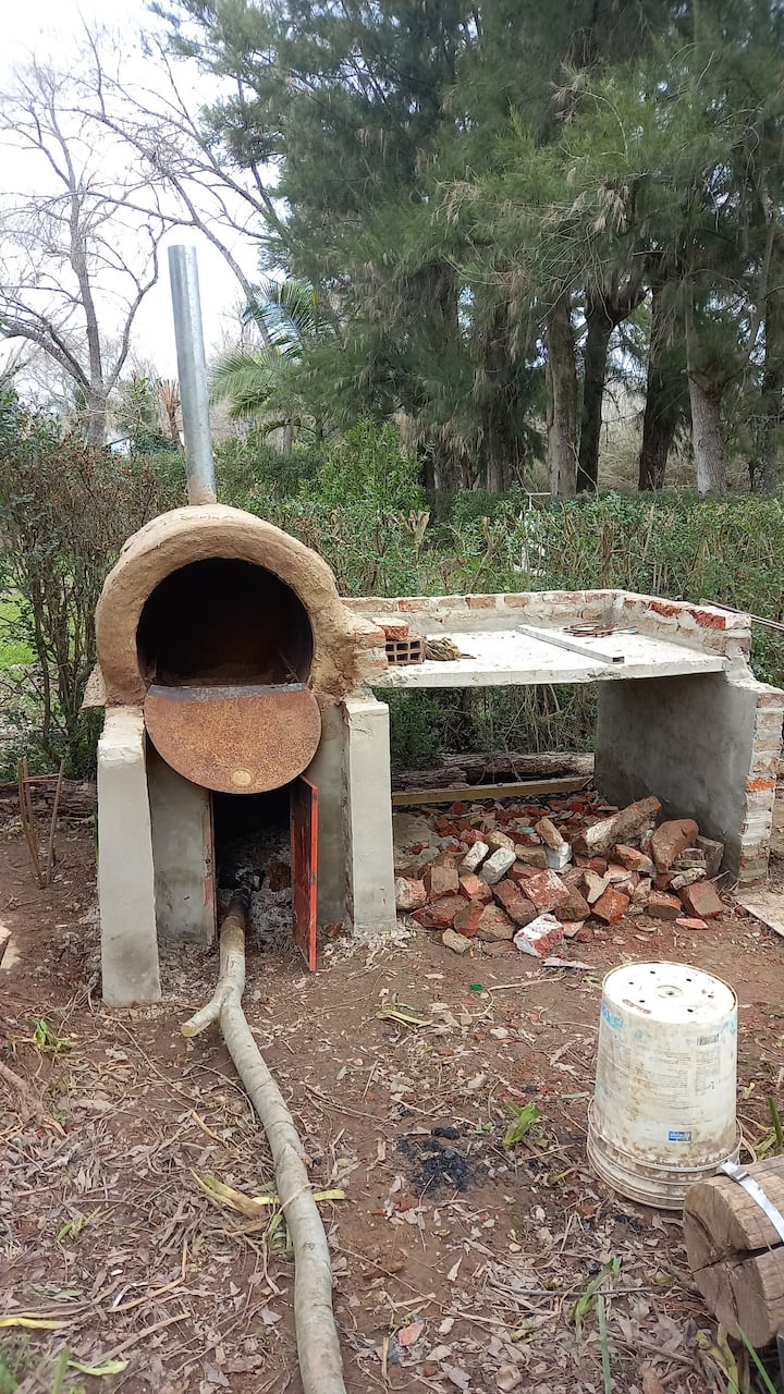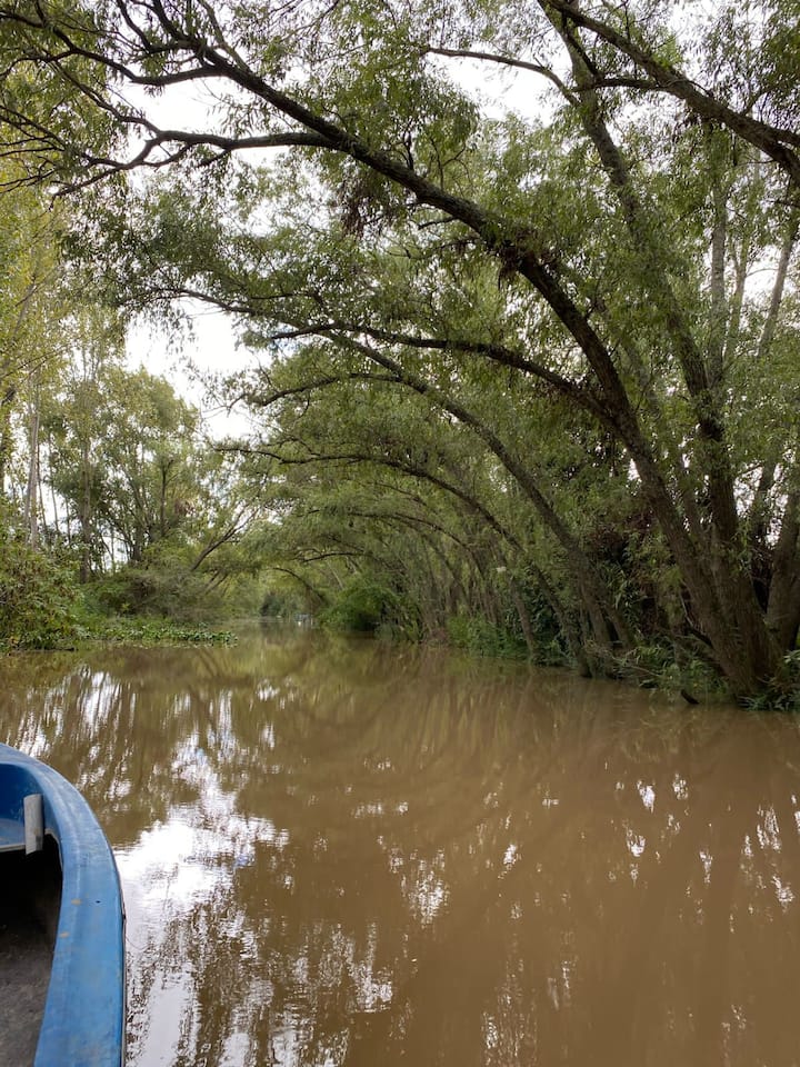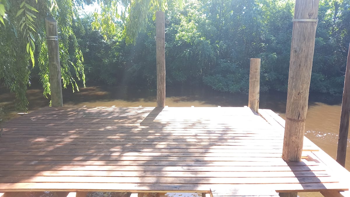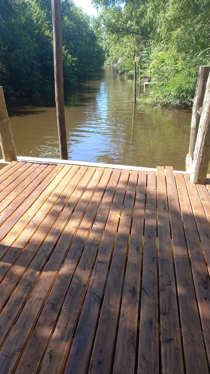 Apartamento no delta do Tigre, em uma ilha, com acesso por barco coletivo. Espaço descrito como muito silencioso. Há área de churrasco com churrasqueira e fogueira, além de vista para a lagoa.