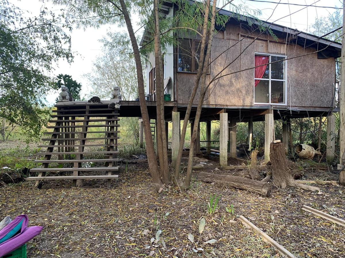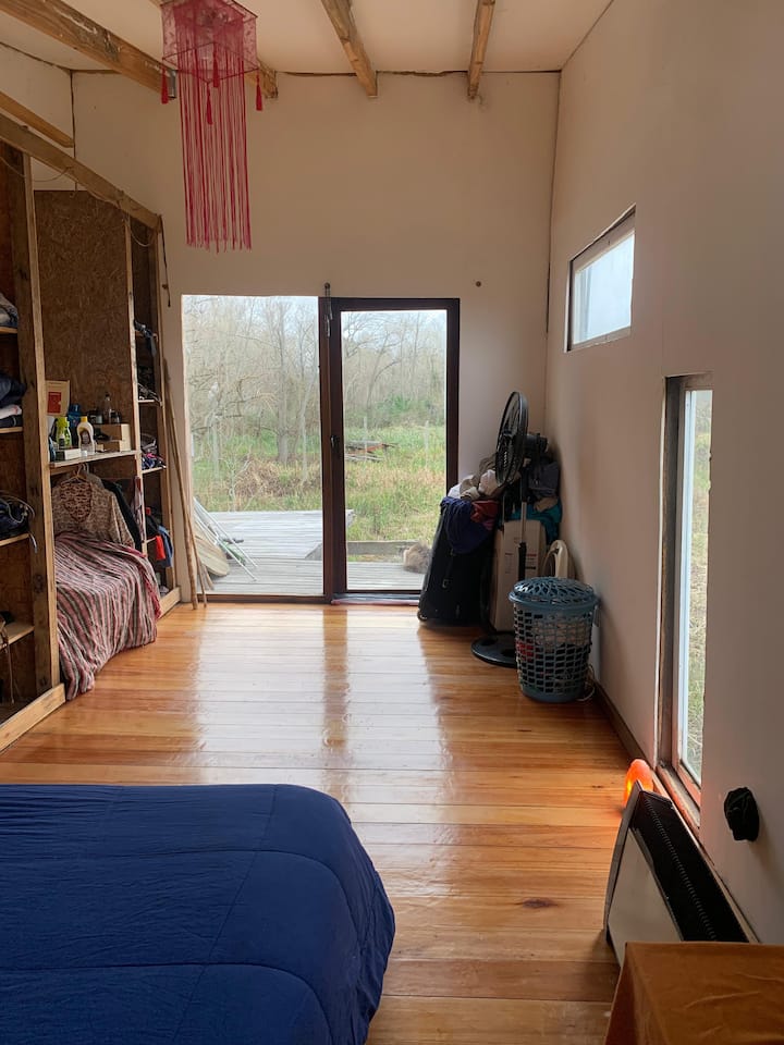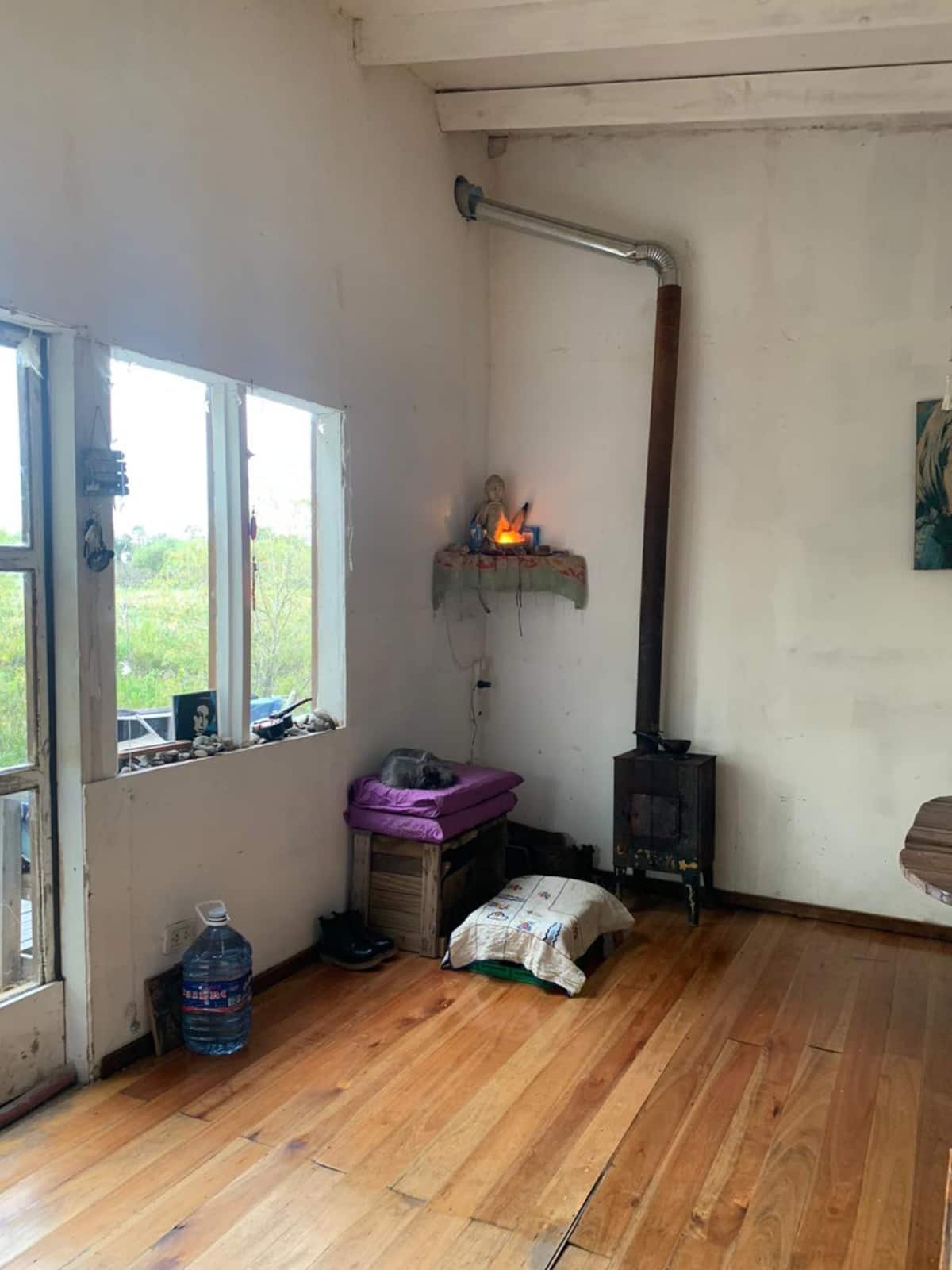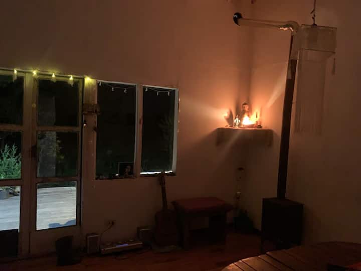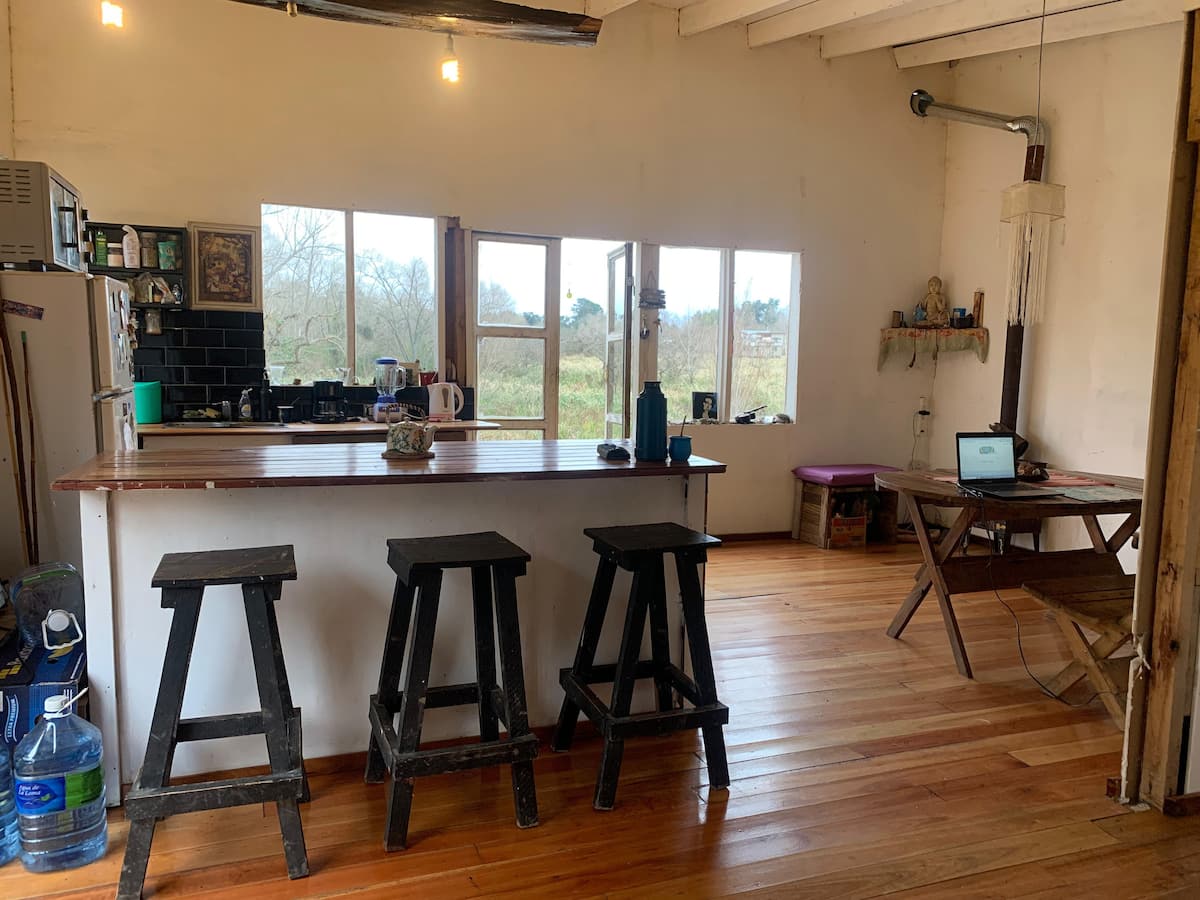 Apartamento no delta do Tigre, em uma ilha, com acesso por barco coletivo. Espaço descrito como muito silencioso. Há área de churrasco com churrasqueira e fogueira, além de vista para a lagoa.