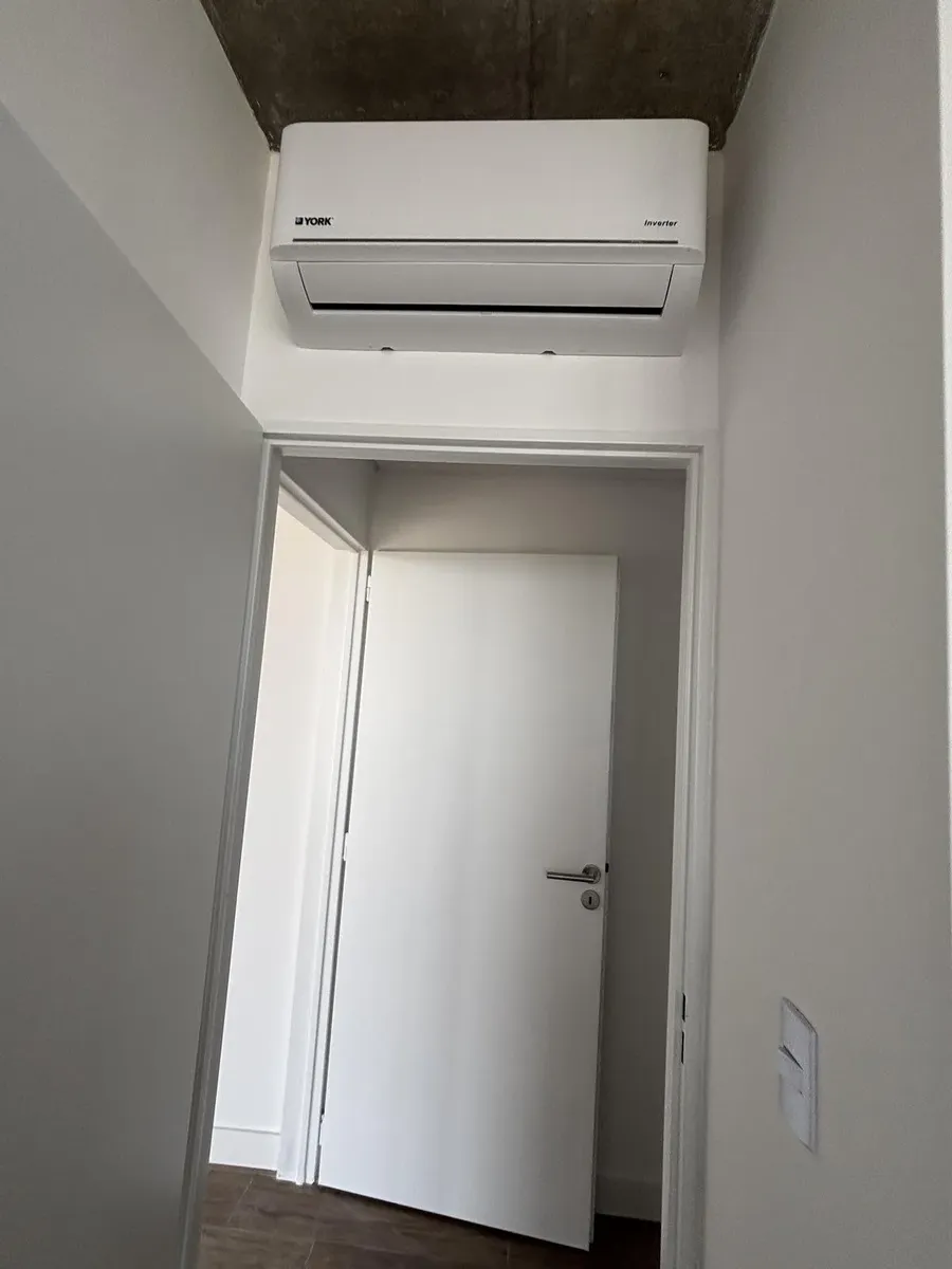 Apartamento novo (nunca habitado) de 1 dormitório no primeiro andar. Tem sala de estar e jantar com porta-janela para varanda contínua e janela lateral; cozinha americana com armários planejados, silestone, forno elétrico e cooktop vitrocerâmico. O dormitório conta com porta-janela para a varanda e armário com depósito; no corredor há roupeiro com espaço para máquina de lavar e termócupla elétrica. O banheiro tem banheira e janela. Janelas em PVC com vidro duplo e porcelanato tipo madeira; ar-co