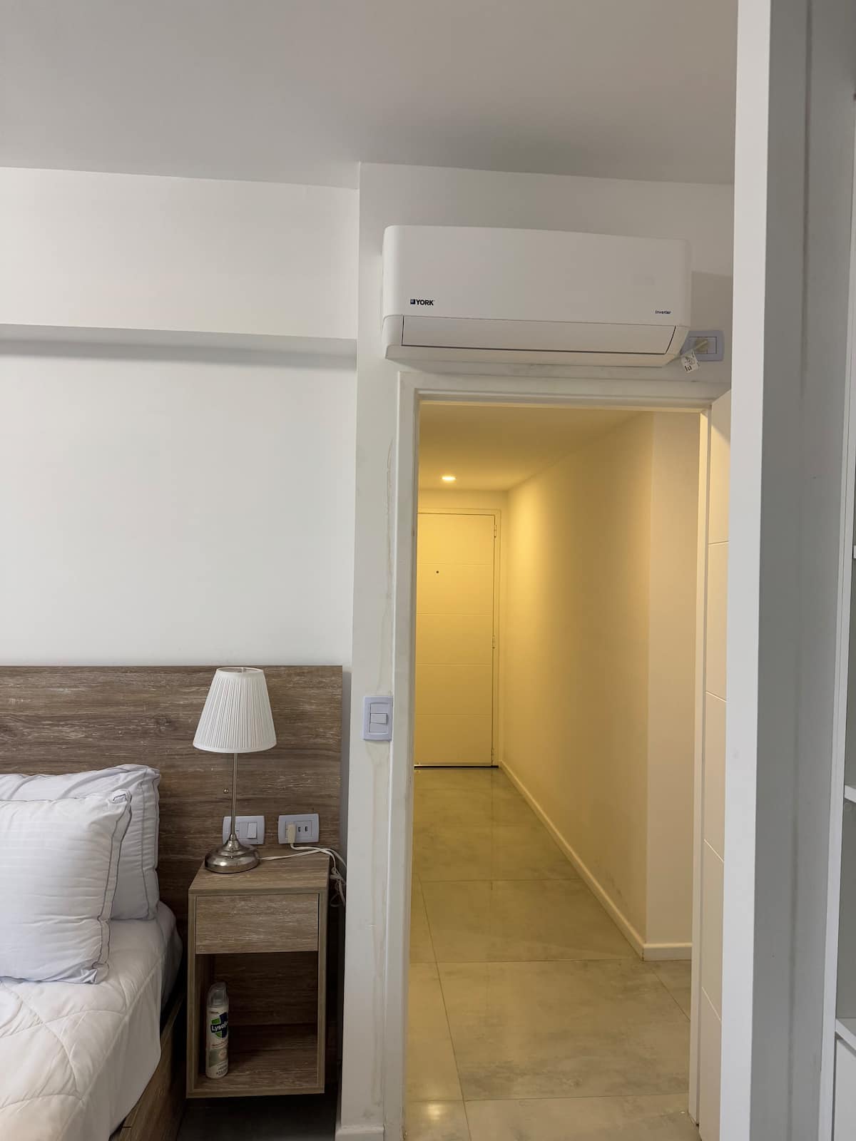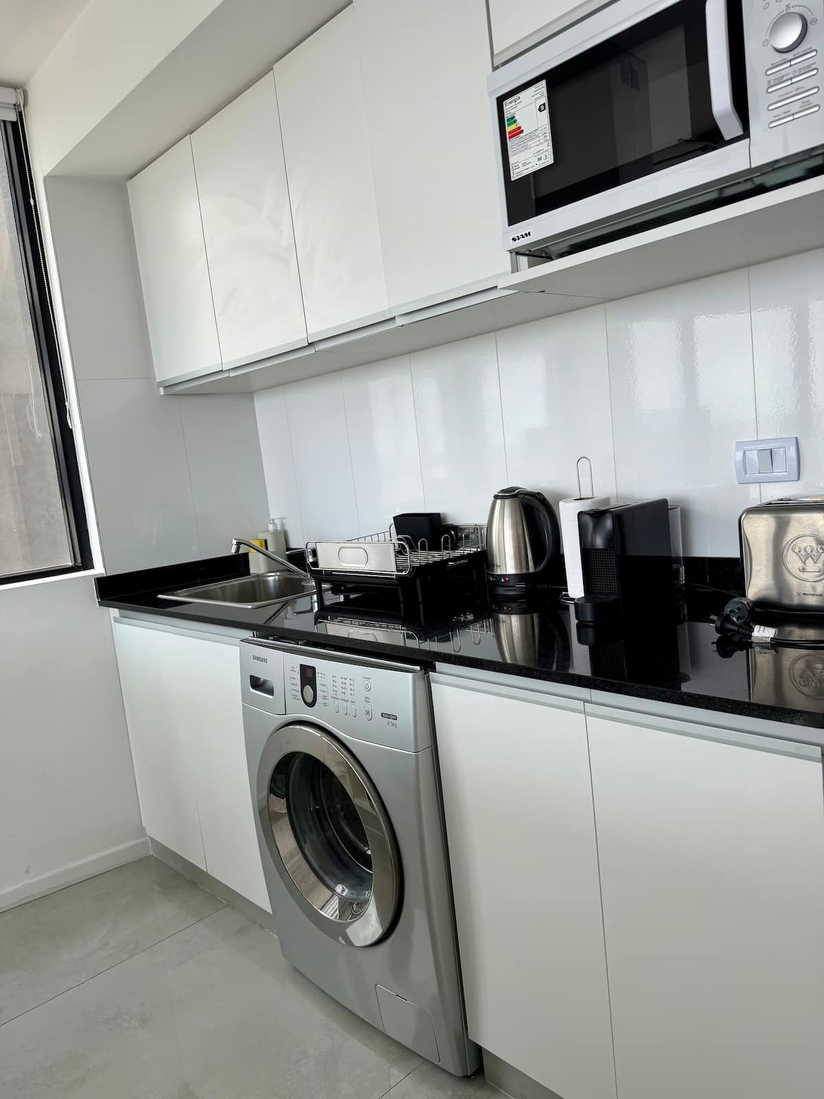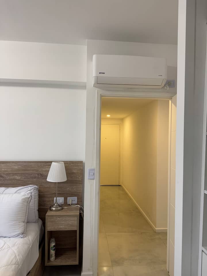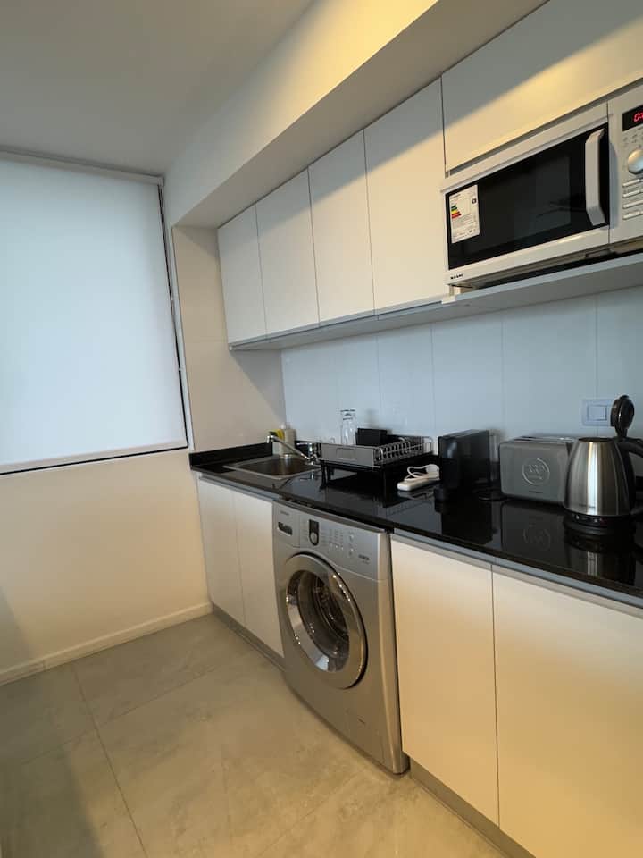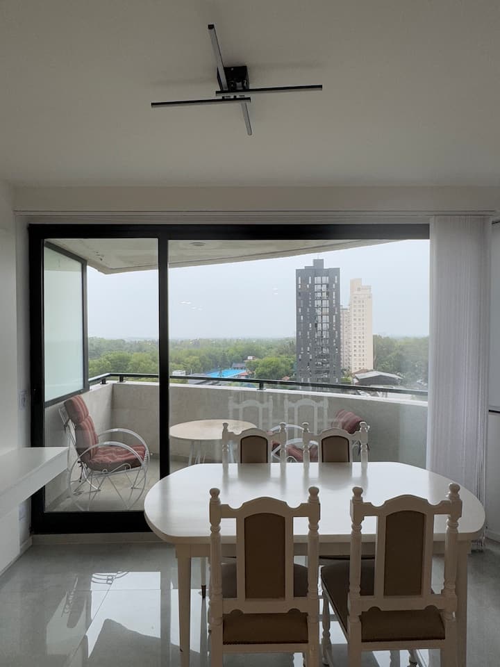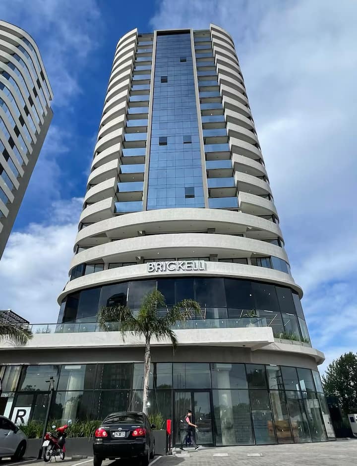 Apartamento de dois ambientes no edifício Brickell em Tigre, com varanda. Mobiliado integralmente e com cozinha equipada com micro-ondas, forno, máquina de lavar, chaleira elétrica e torradeira, além de utensílios e louças. Inclui ar de ventilação em áreas com ventiladores de teto; há sala de estar com TV e sala de jantar com mesa e cadeiras. O prédio tem piscina, academia, área de churrasco, segurança 24 horas e terraço para churrasco.