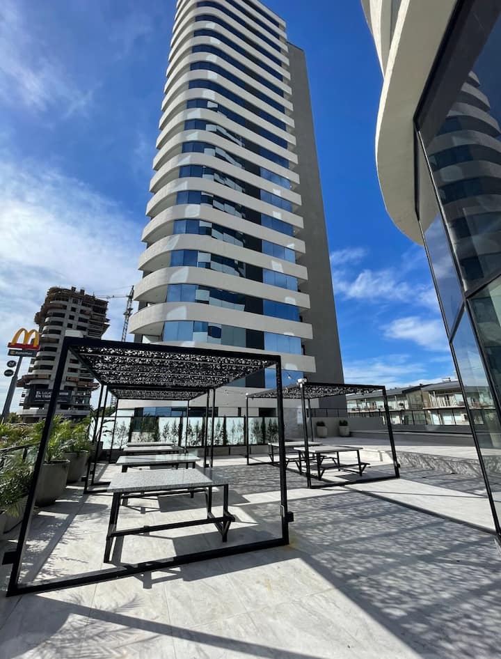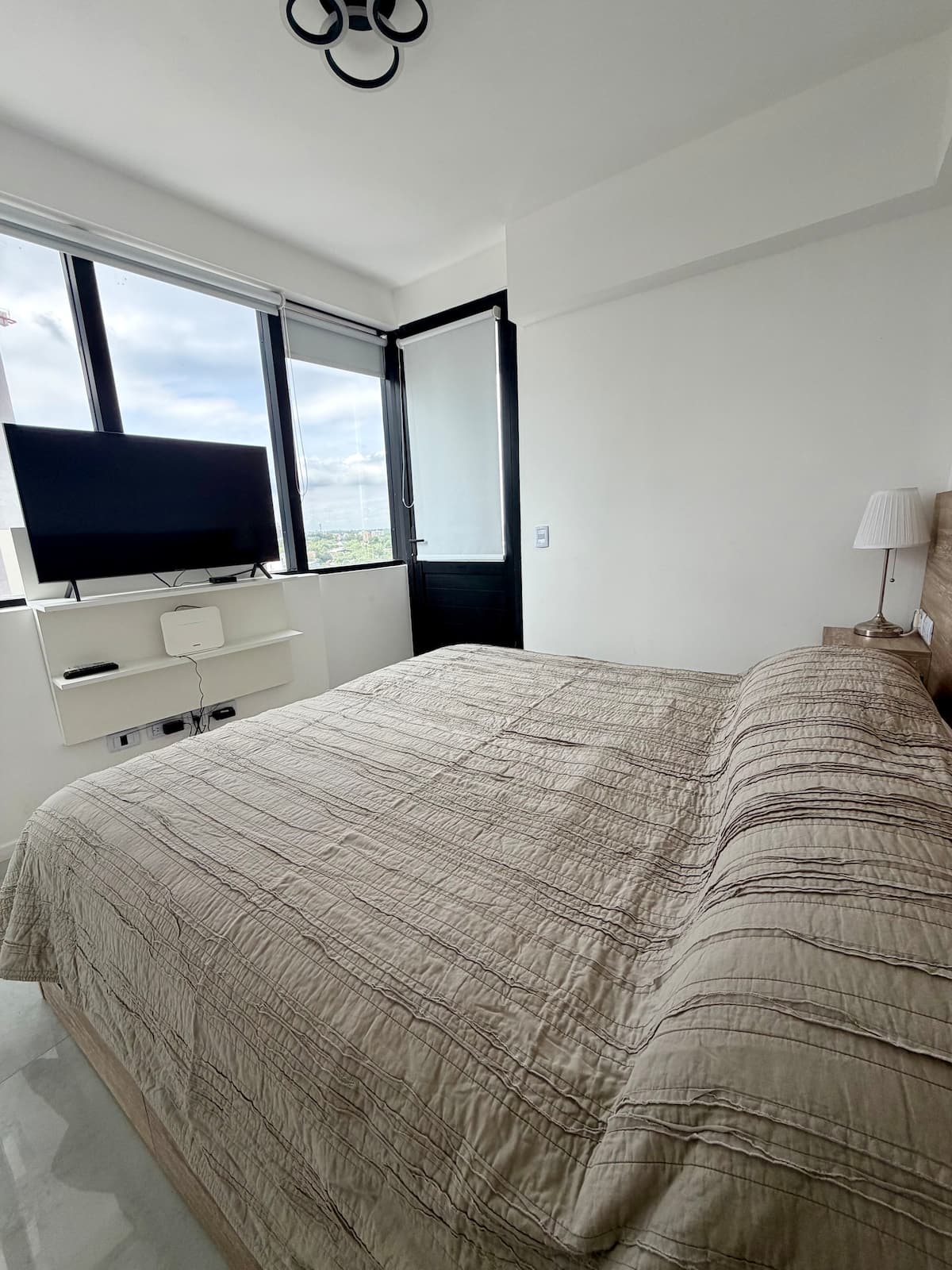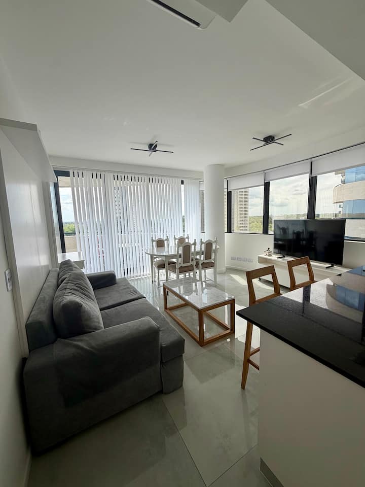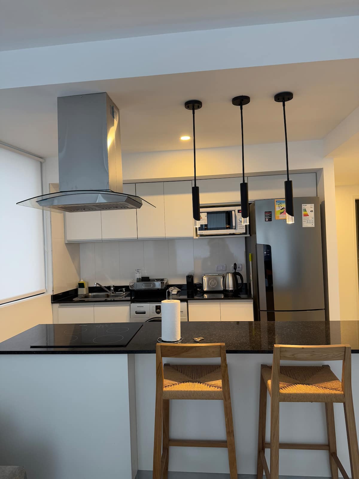 Apartamento de dois ambientes no edifício Brickell em Tigre, com varanda. Mobiliado integralmente e com cozinha equipada com micro-ondas, forno, máquina de lavar, chaleira elétrica e torradeira, além de utensílios e louças. Inclui ar de ventilação em áreas com ventiladores de teto; há sala de estar com TV e sala de jantar com mesa e cadeiras. O prédio tem piscina, academia, área de churrasco, segurança 24 horas e terraço para churrasco.