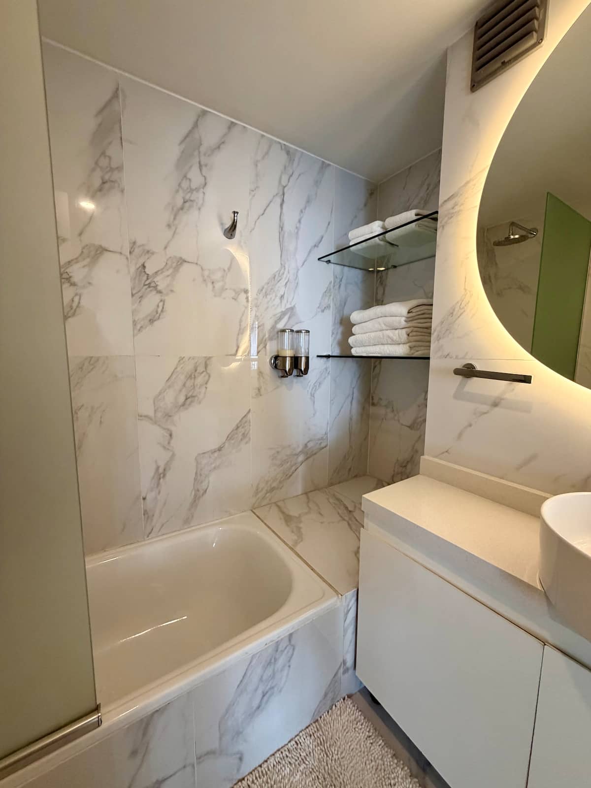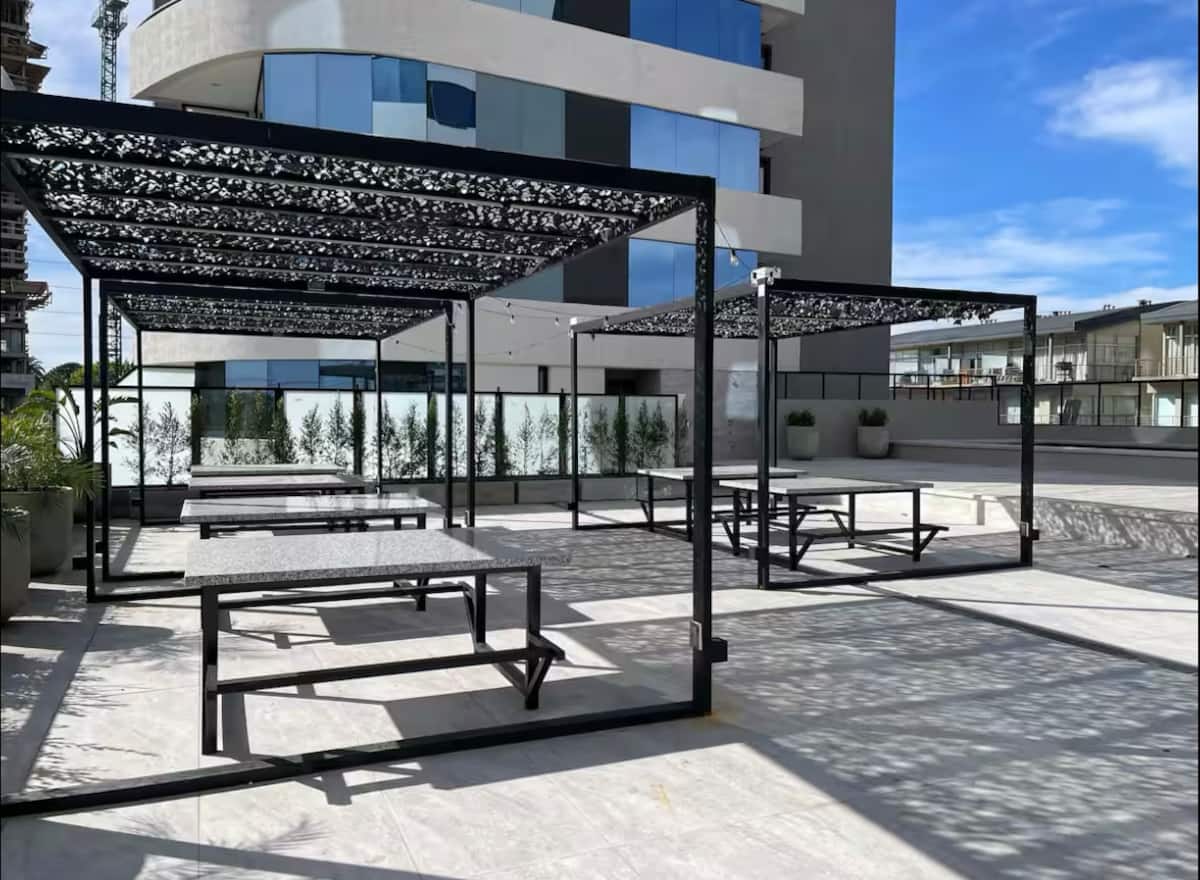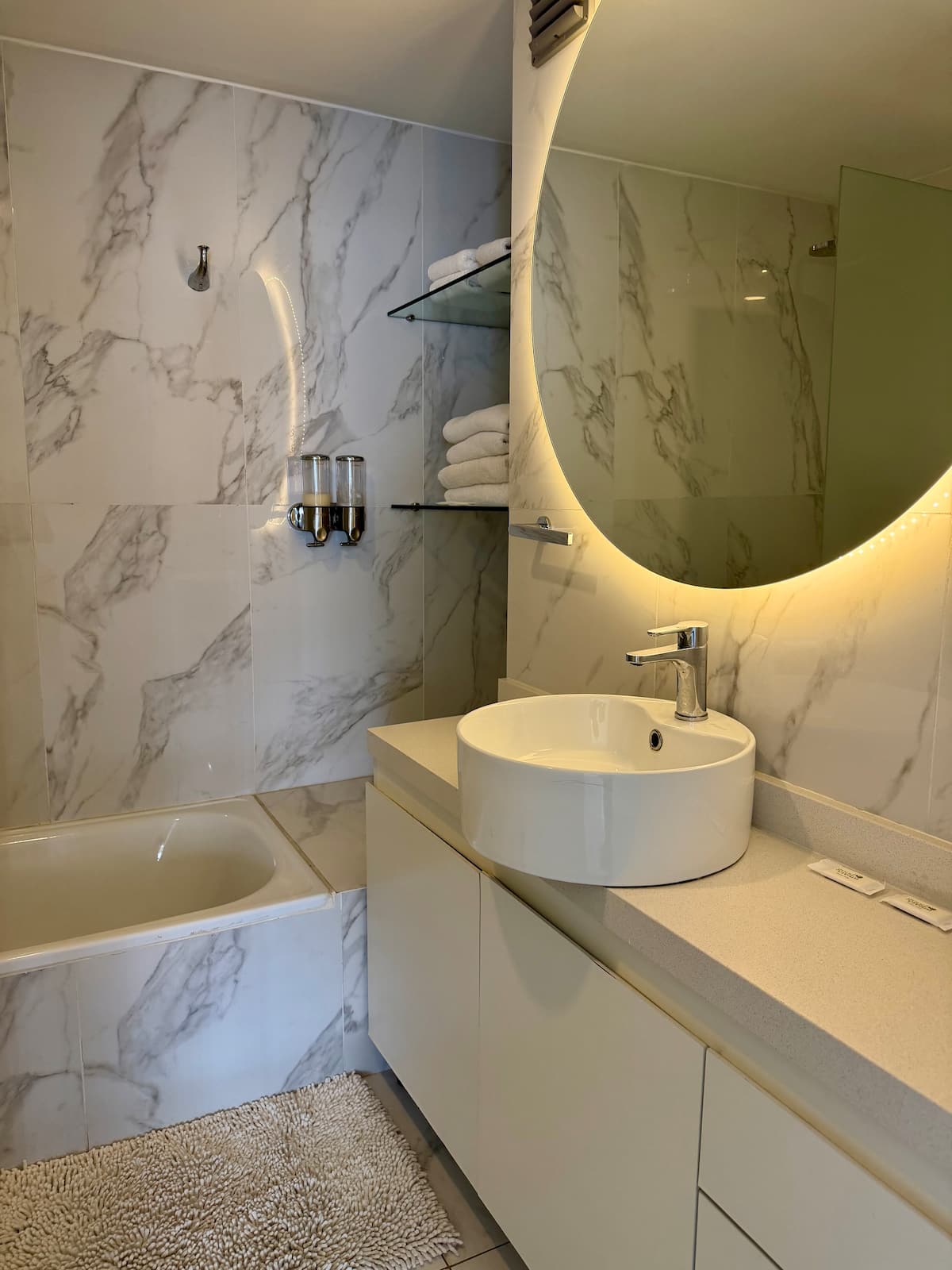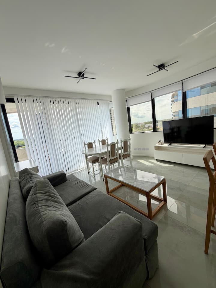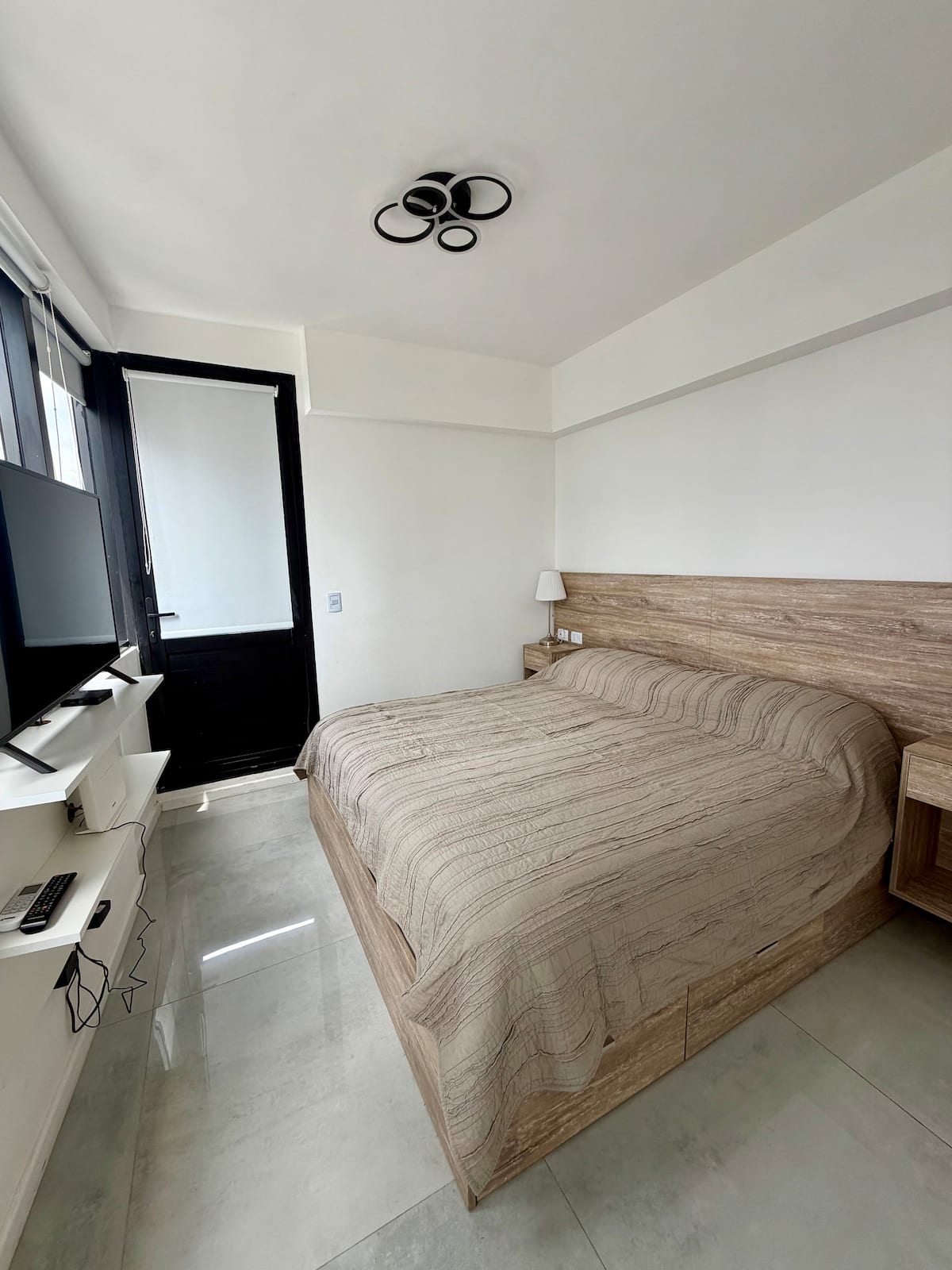 Apartamento de dois ambientes no edifício Brickell em Tigre, com varanda. Mobiliado integralmente e com cozinha equipada com micro-ondas, forno, máquina de lavar, chaleira elétrica e torradeira, além de utensílios e louças. Inclui ar de ventilação em áreas com ventiladores de teto; há sala de estar com TV e sala de jantar com mesa e cadeiras. O prédio tem piscina, academia, área de churrasco, segurança 24 horas e terraço para churrasco.