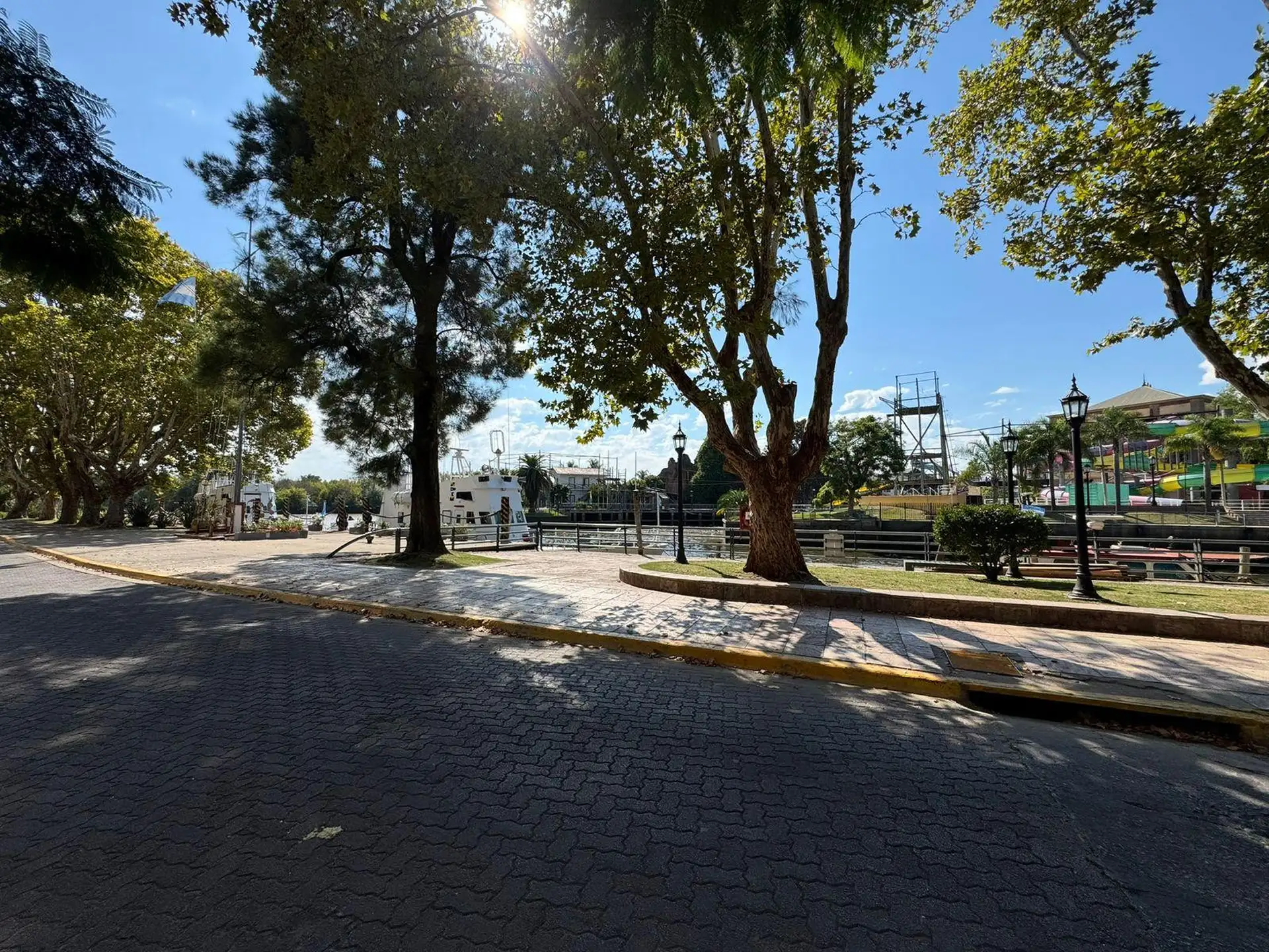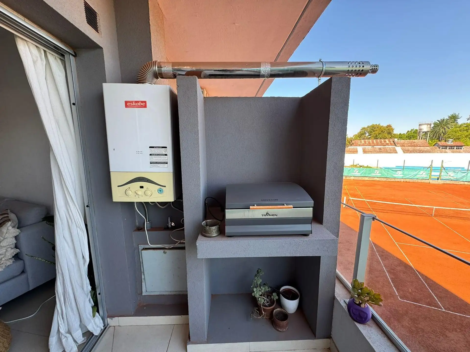 Apartamento de 2 ambientes com 1 dormitório, 1 banheiro completo e cozinha americana, em Tigre. Possui varanda corrida com área de churrasco (parrilla), ar-condicionado individual e calefação por piso radiante (losa radiante). Inclui vaga de garagem (fixa). O condomínio é de $160.000. A oferta depende da emissão do COTI pelo proprietário (Res. AFIP 2371). Metros e valores de condomínio e ABL são aproximados e podem mudar.