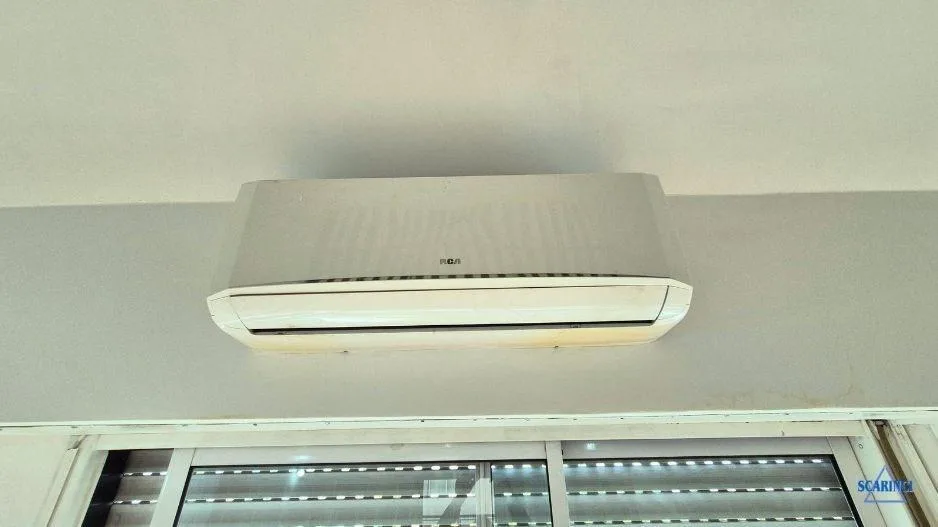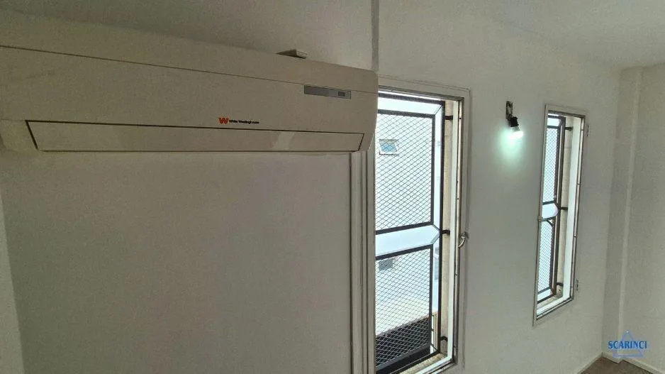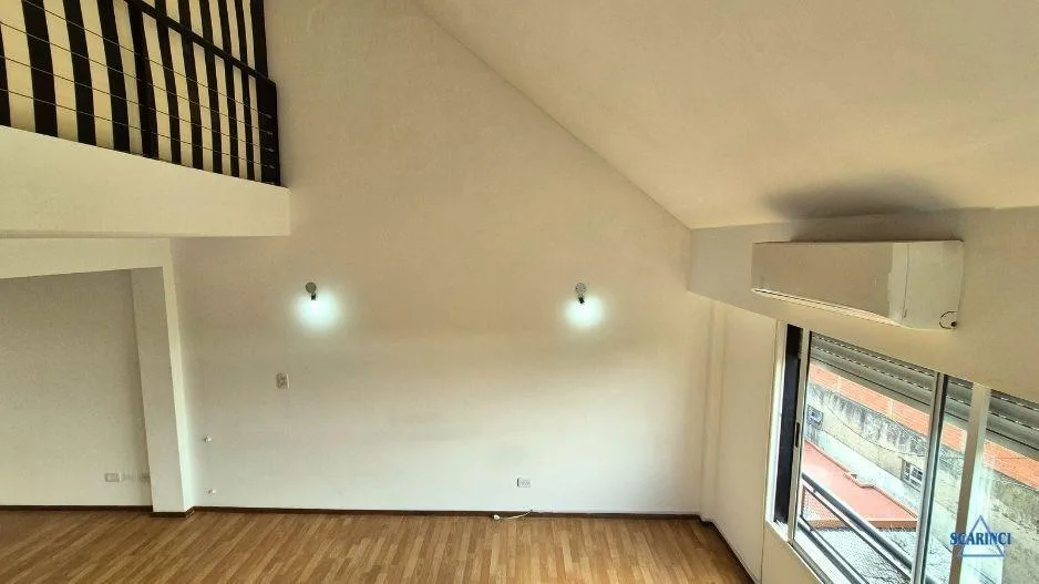 Apartamento duplex de 2 ambientes com 1 quarto, 59 m² totais, no 5º andar, de fundos (contrafrente). Com área social e área privada em dois níveis, a unidade tem cerca de 20 anos e está em bom estado de conservação. O living-comedor no primeiro nível tem ventilação cruzada e janelas nos dois extremos, com piso flutuante e ar-condicionado split frio/quente, além de lavabo. A cozinha integrada é equipada com móveis sob e sobre a bancada, caldeira independente para água quente e conexão para máquin