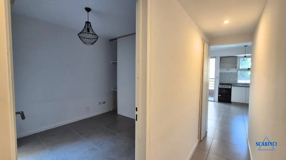 Apartamento de 2 ambientes com 44 m² totais, 39 m² cobertos, no 1º andar, voltado para o Sul e de fundos (contrafrente). Possui sala de estar e jantar com piso de cerâmica, com saída para varanda corrida, cozinha integrada equipada com fogão a gás e armários sob e sobre a bancada, além de dormitório com piso de cerâmica, armário com interior e varanda. Inclui banheiro completo com banheira e janela, aquecedor elétrico (termotanque) e conexão para lavadora (lavarropas) no armário; conta com ar-co