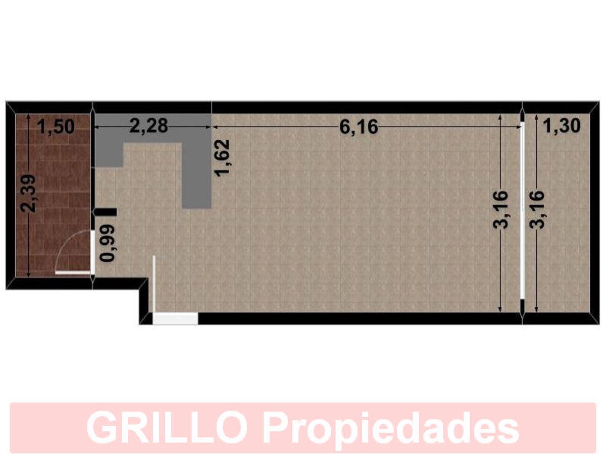 Kitnet de 34 m² no 1º andar, de frente para a rua Ramón Falcón, com varanda de 4 m². Área coberta de 30 m², living com cozinha semi integrada, fogão a gás, armários inferiores e aéreos e instalação preparada para ar-condicionado. Banheiro completo com banheira. Prédio com 10 andares, 4 unidades por andar, acesso por escada e/ou elevador. O condomínio inclui Aysa (água) e MetroGas para a água quente, já que ambos são centrais; o edifício tem SUM com área de churrasco.