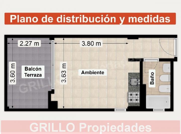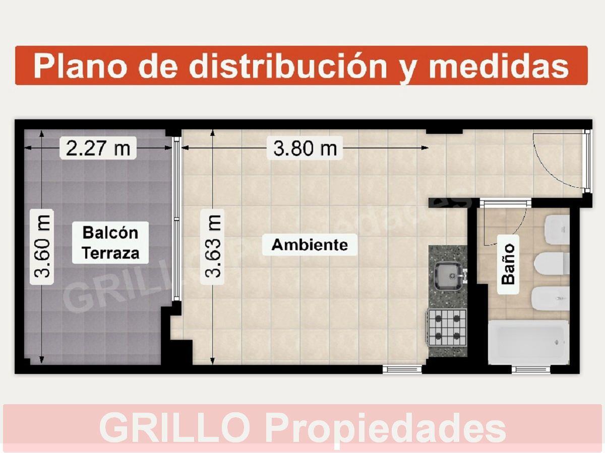 Apartamento tipo kitnet de 31 m², no 9º andar, com frente para a rua. Living com espaço de jantar e cozinha integrada, além de varanda/terraço aterrazado de 7 m² e banheiro completo com banheira. Cozinha a gás marca Volcán, metais e louças Ferrum e torneiras FV. Fechamento da varanda com alumínio e persiana; instalação elétrica e hidráulica preparada para ar-condicionado, com tomada e descarga; aquecimento de água por termotanque central. Condomínio inclui Aysa (água) e MetroGas (gás) para a águ