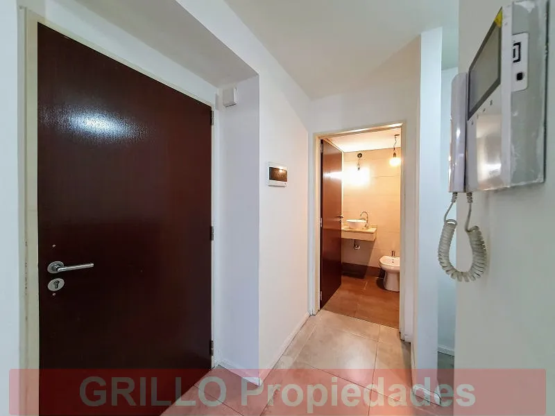 Kitnet com 34 m² totais, 30 m² cobertos e 4 m² de varanda, no 1º andar, de frente para a rua Ramón Falcón. Ambiente com sala de estar e cozinha semi-integrada, fogão a gás, armários inferiores e aéreos, instalação preparada para ar-condicionado e banheiro completo com banheira. O prédio tem 10 andares, com 4 unidades por andar, e acesso por escada e/ou elevador. Há portaria com visor e salão de usos múltiplos (SUM) com área de churrasco. As despesas de condomínio incluem AySA (água) e MetroGas (