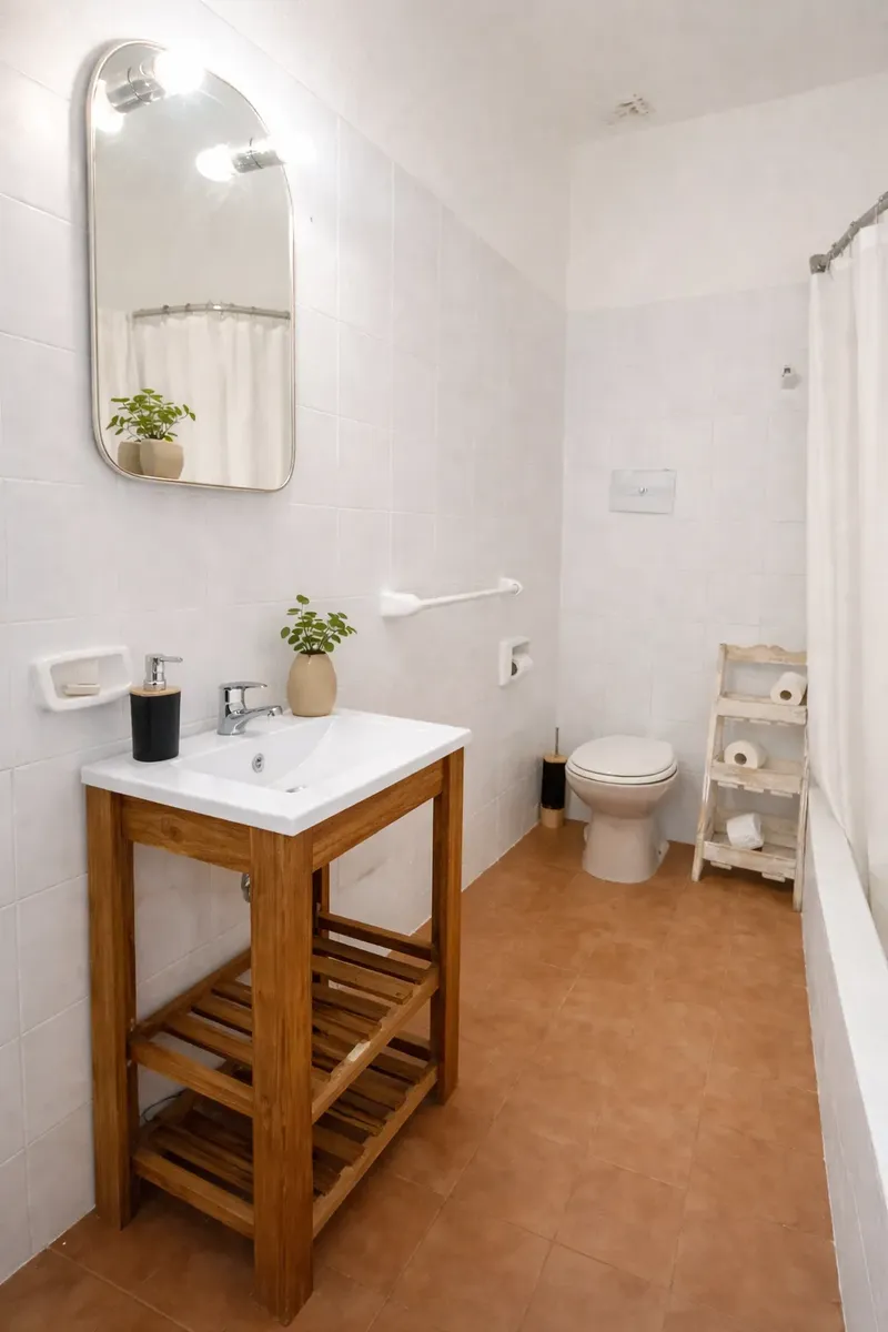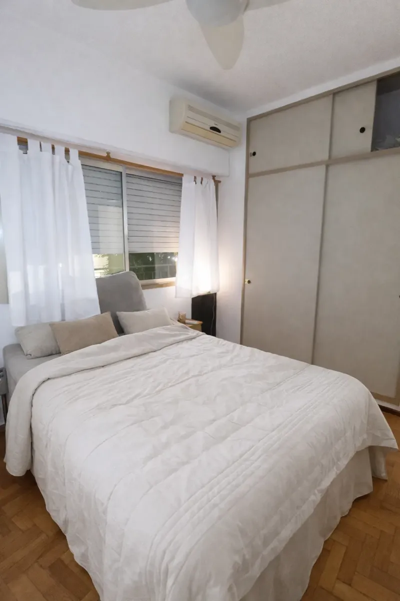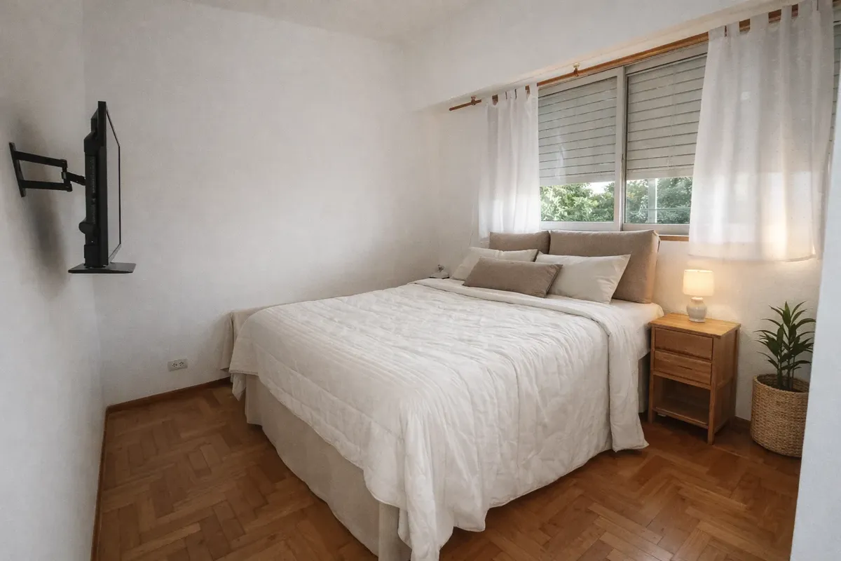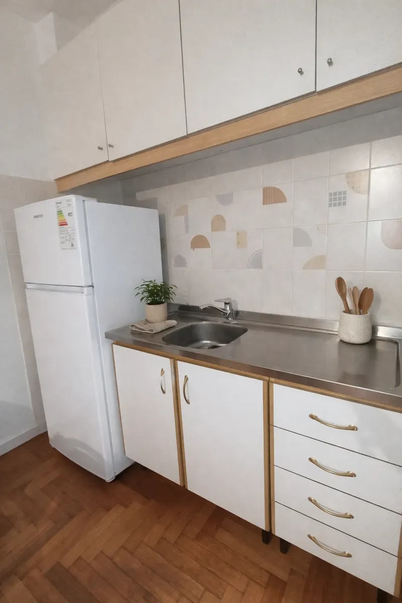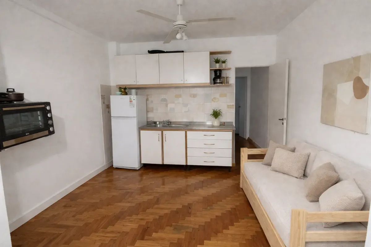 Apartamento mobiliado de 2 ambientes em Versalles, com quarto separado de frente para a rua e ar-condicionado. Fica no 1º andar por escada (PH), com banheiro completo e cozinha integrada equipada com forno e fogão elétrico duplo anafe BGH (novo) e geladeira (nova). Inclui sala com área de jantar e sofá-cama com carro, para até 2 pessoas; há também roupas de cama. O preço do mês inclui internet, luz e água; não inclui toalhas.