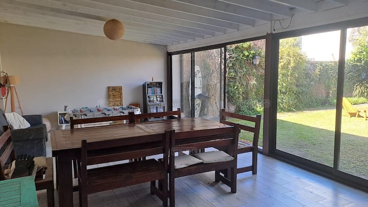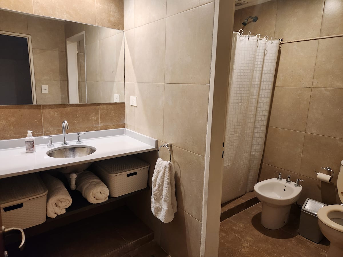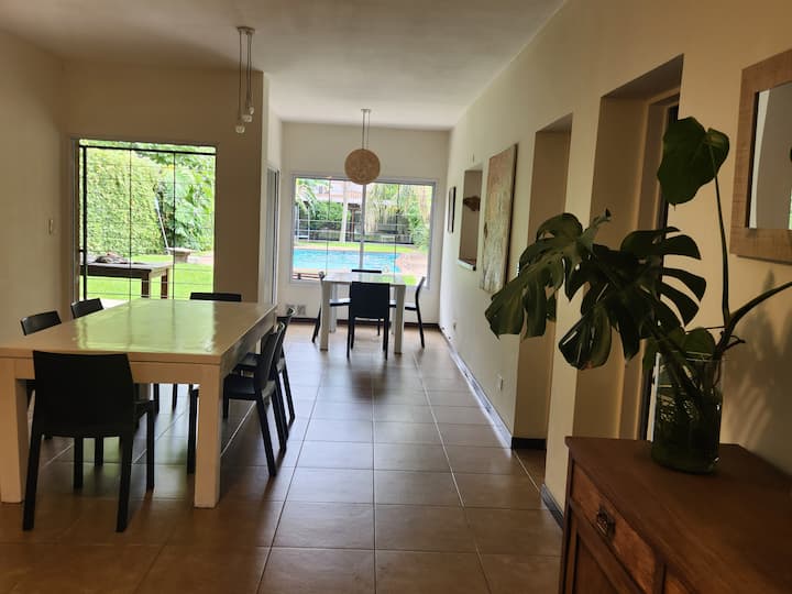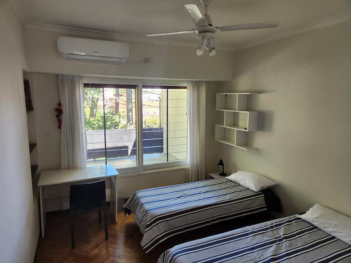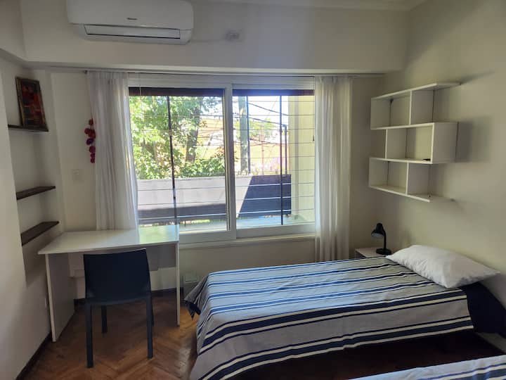 Quarto duplo em apartamento em Victoria, em bairro residencial. A unidade fica em casa com cozinha equipada, sala de estar e sala de jantar de uso comum, além de piscina grande, jardim e área de churrasco. Há transporte nas proximidades, com coletivos a 2 quadras e estação Mitre a 4.