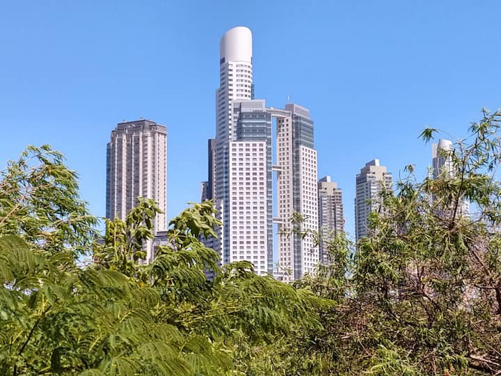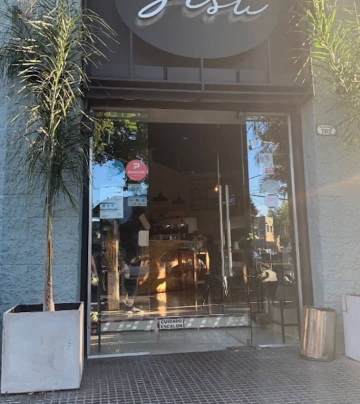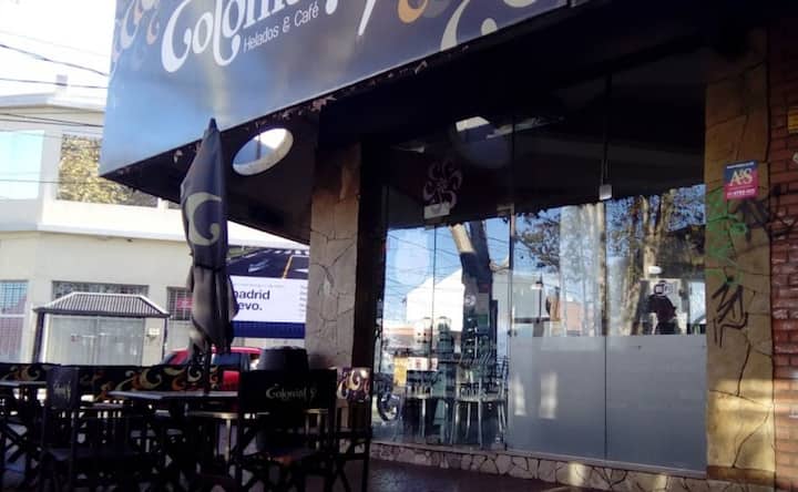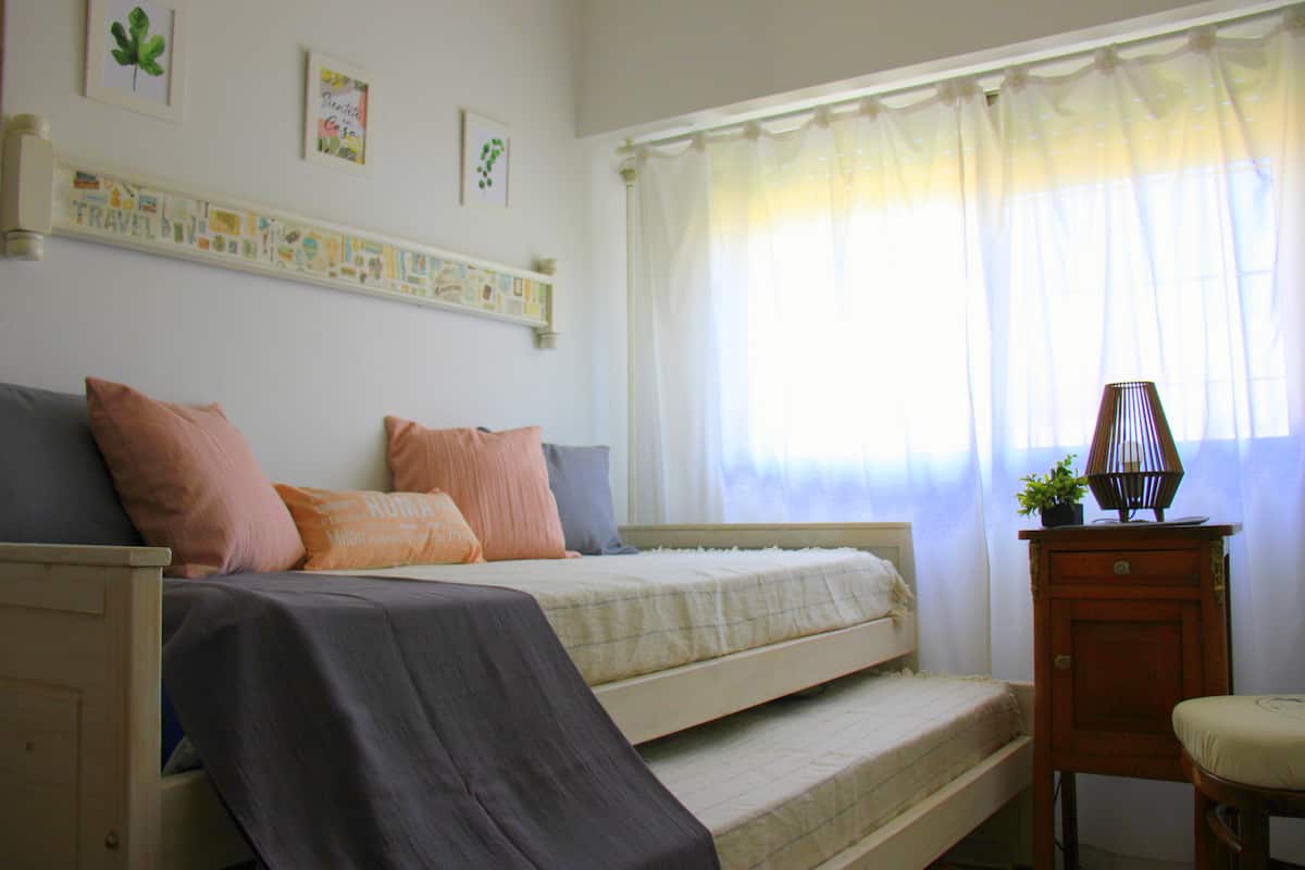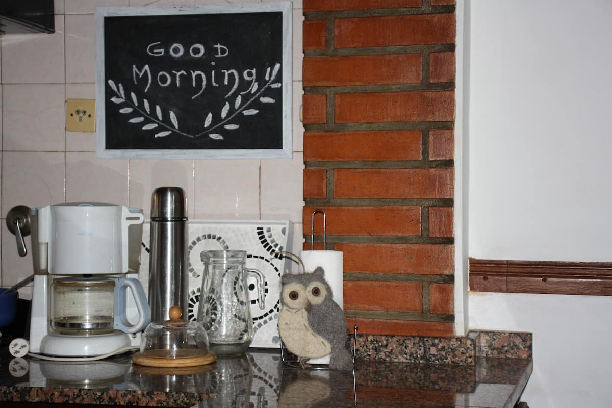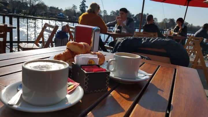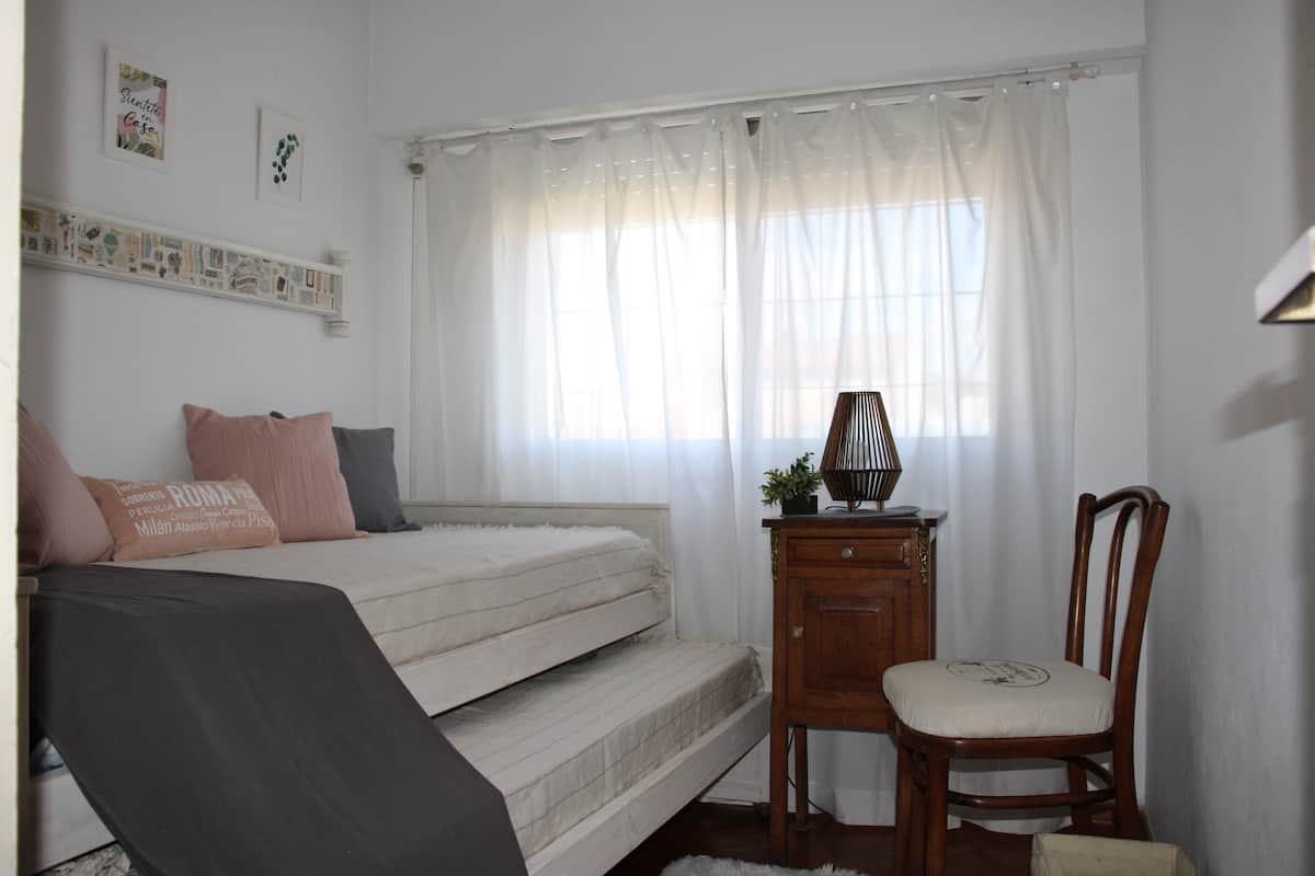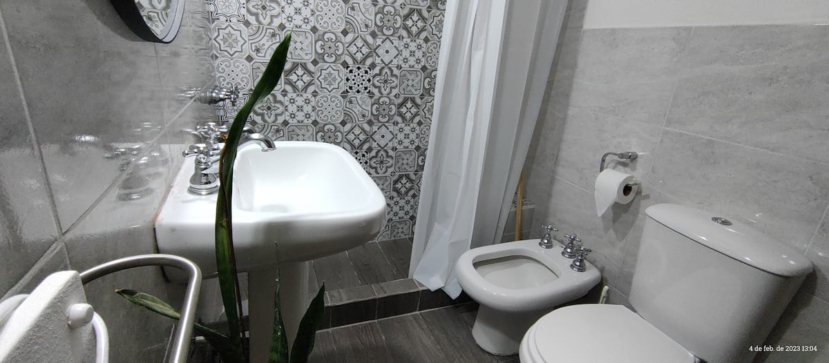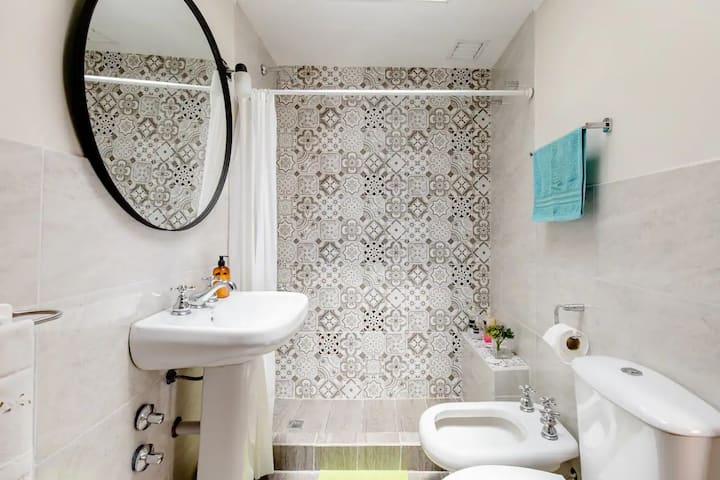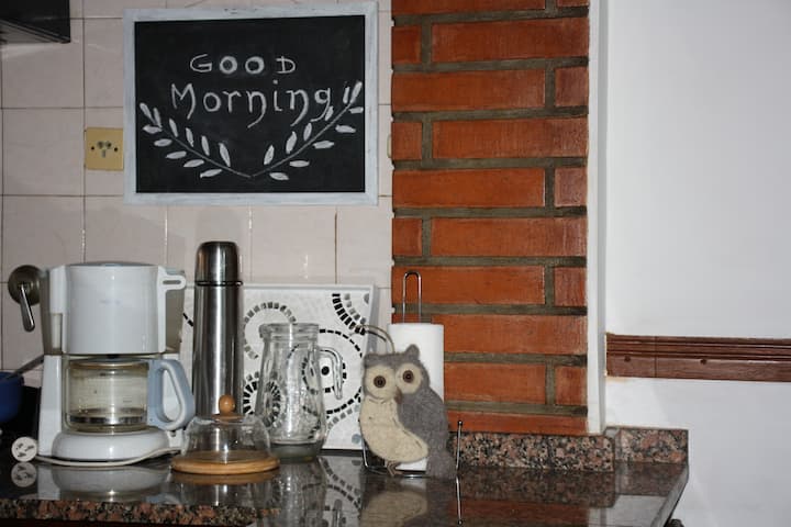 Duplex em Villa Adelina com 2 ambientes. Há um quarto com cama king size e outro com duas camas. Banheiro compartilhado com outros hóspedes, além de sala de estar, jardim e vaga de garagem.