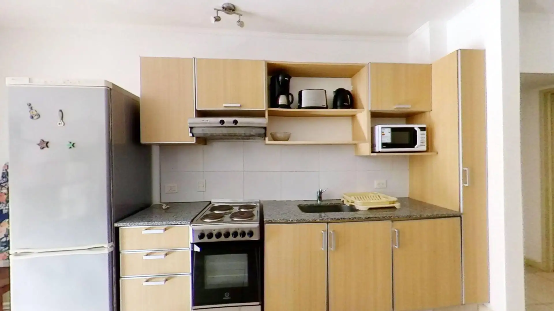 Kitnet com 42 m² cobertos e 3,10 x 1,40 m de varanda, de fundos (contrafrente), em andar alto. Unidade integrada com dormitório de 3,20 x 3,10, com placar e sommier de 2 praças, cortina black-out e janela ampla com acesso à varanda. Cozinha integrada com forno elétrico de 4 bocas, micro-ondas, purificador de ar, chaleira elétrica, torradeira e geladeira com freezer; banheiro completo com banheira. O valor inclui serviço de TV a cabo e Wi-Fi, além de roupa de cama; condomínio e consumo de luz fic