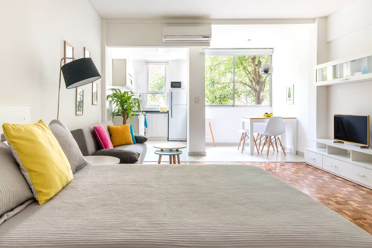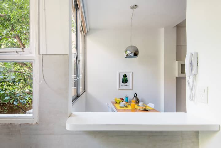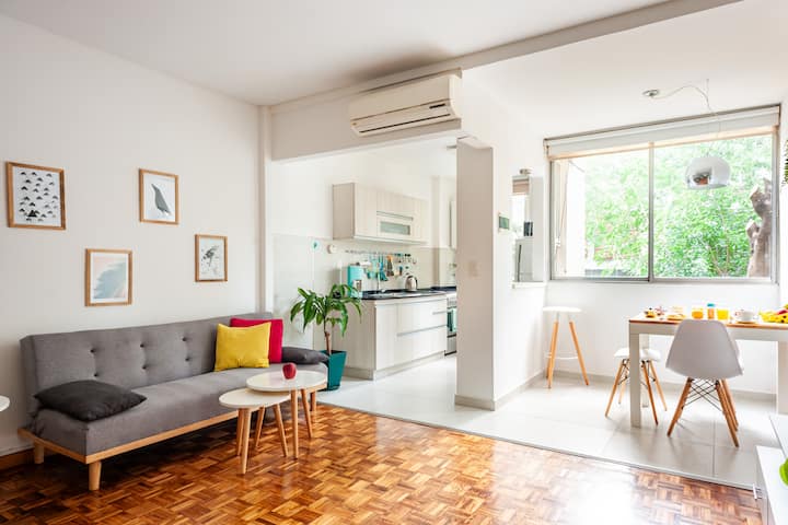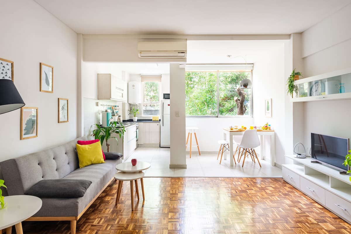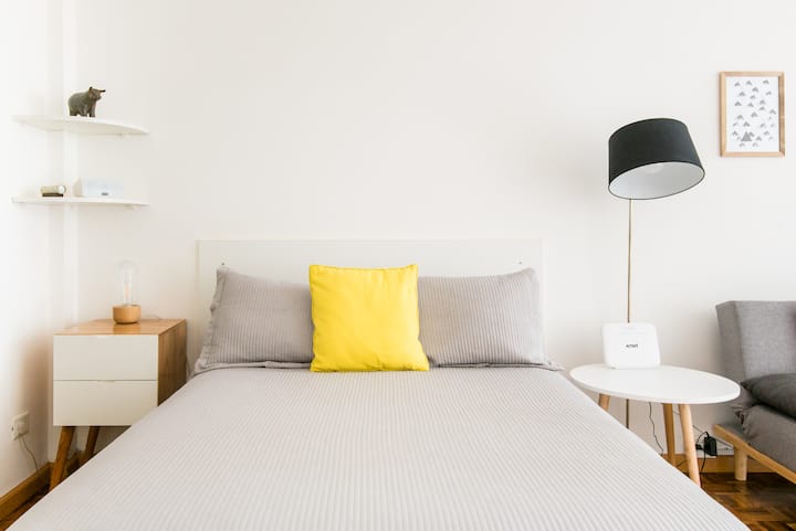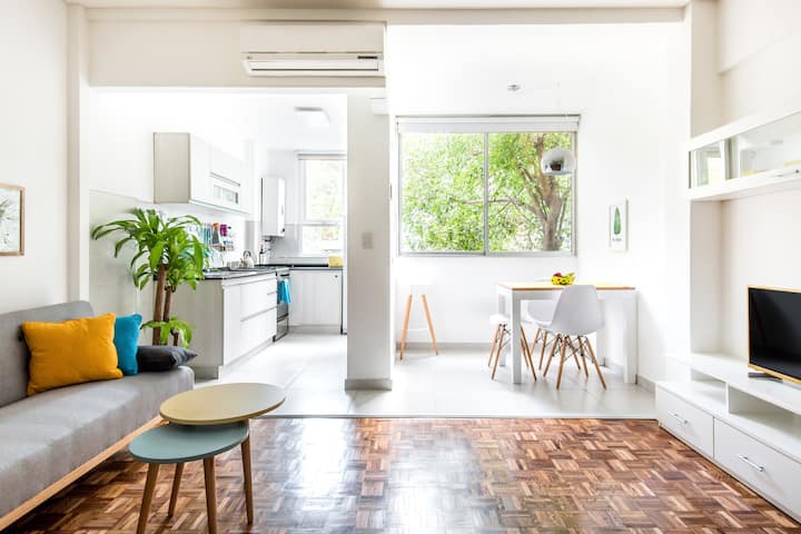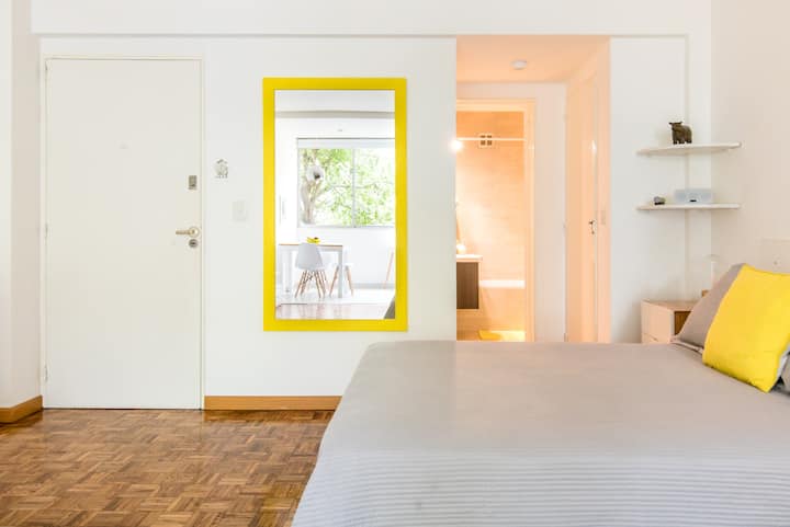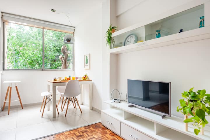 Apartamento reformado recentemente, com 1 quarto. Wi-Fi, TV inteligente de 32" com Netflix, ar-condicionado (frio e quente), micro-ondas e forno a gás. Cozinha totalmente equipada com geladeira com congelador, além de aquecimento, ventilador de pedestal, torradeira e piso em madeira. Banheiro completo, cama de casal, sofá-cama (solteiro) e área de café com bar.