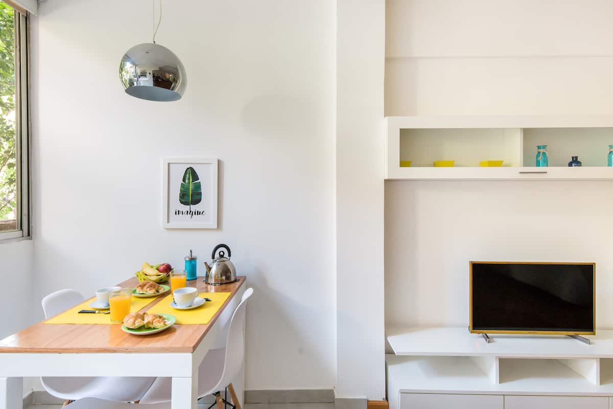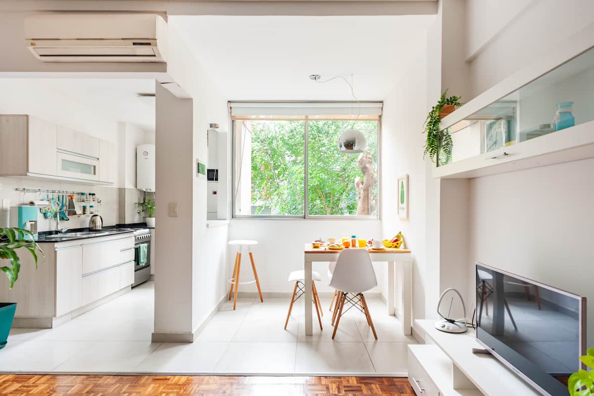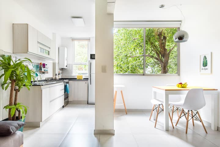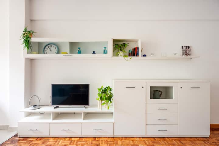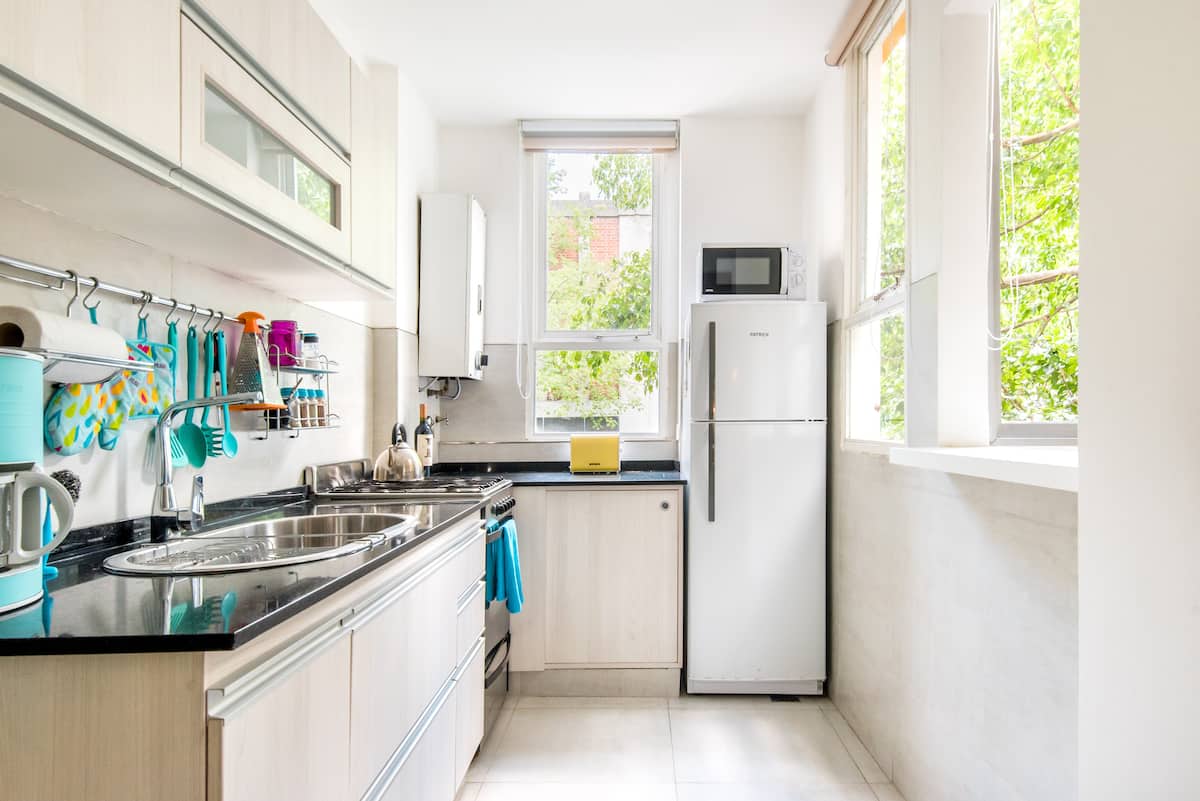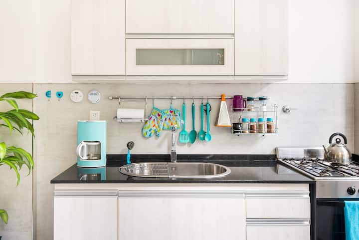 Apartamento reformado recentemente, com 1 quarto. Wi-Fi, TV inteligente de 32" com Netflix, ar-condicionado (frio e quente), micro-ondas e forno a gás. Cozinha totalmente equipada com geladeira com congelador, além de aquecimento, ventilador de pedestal, torradeira e piso em madeira. Banheiro completo, cama de casal, sofá-cama (solteiro) e área de café com bar.