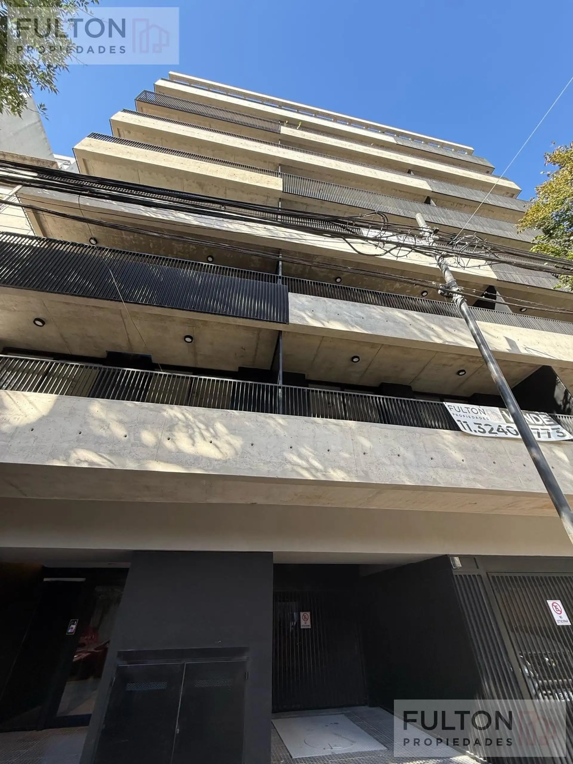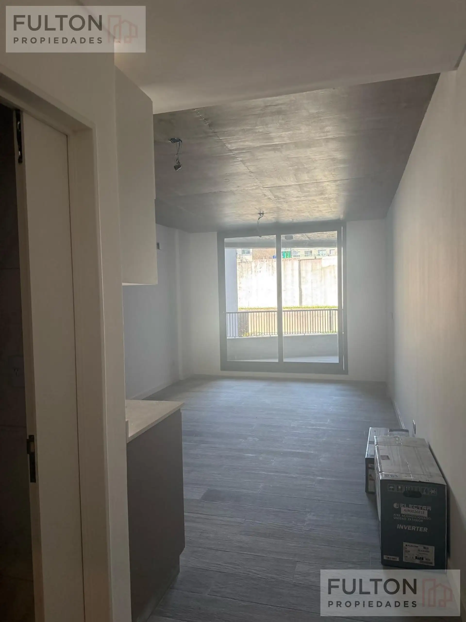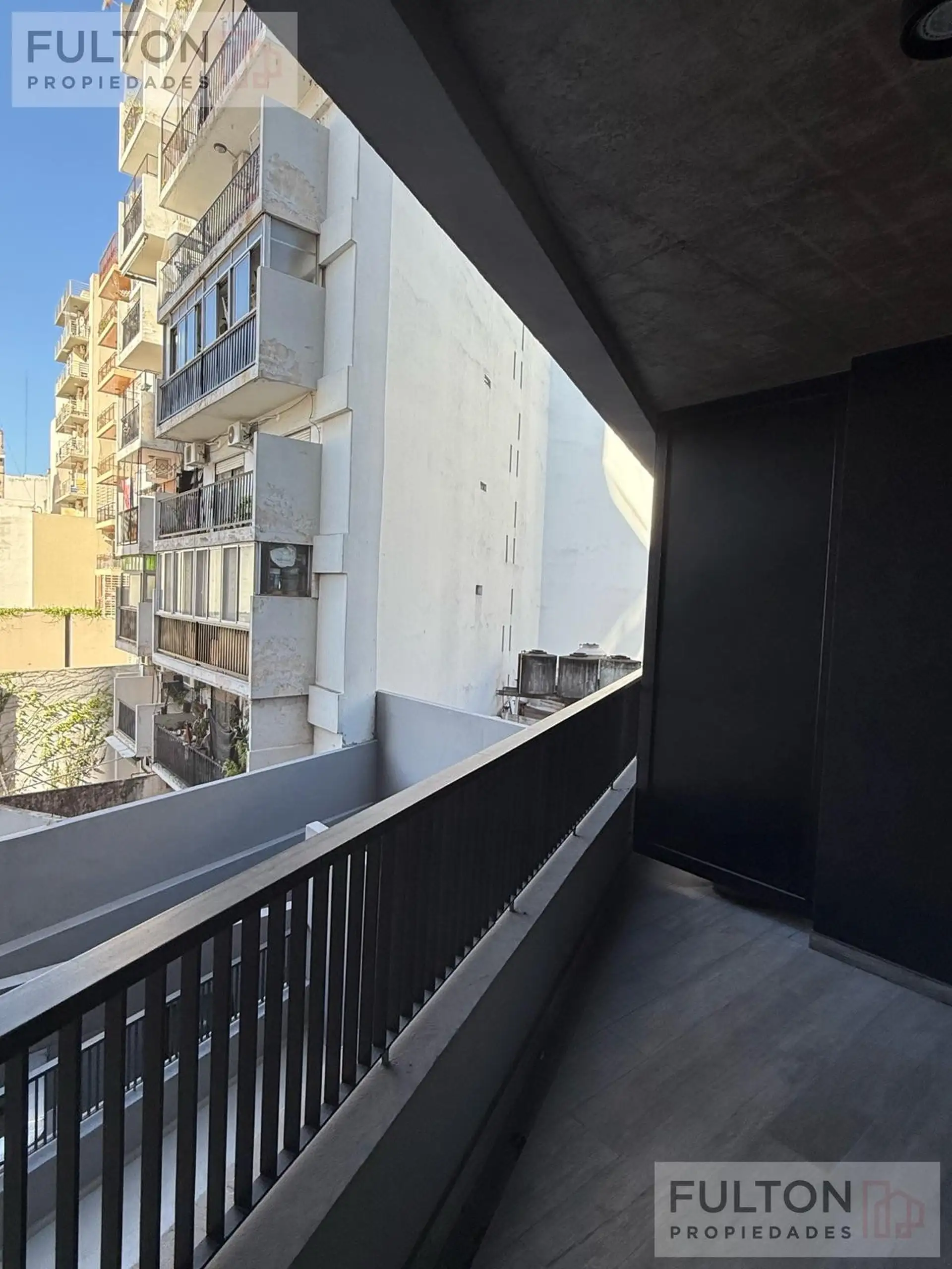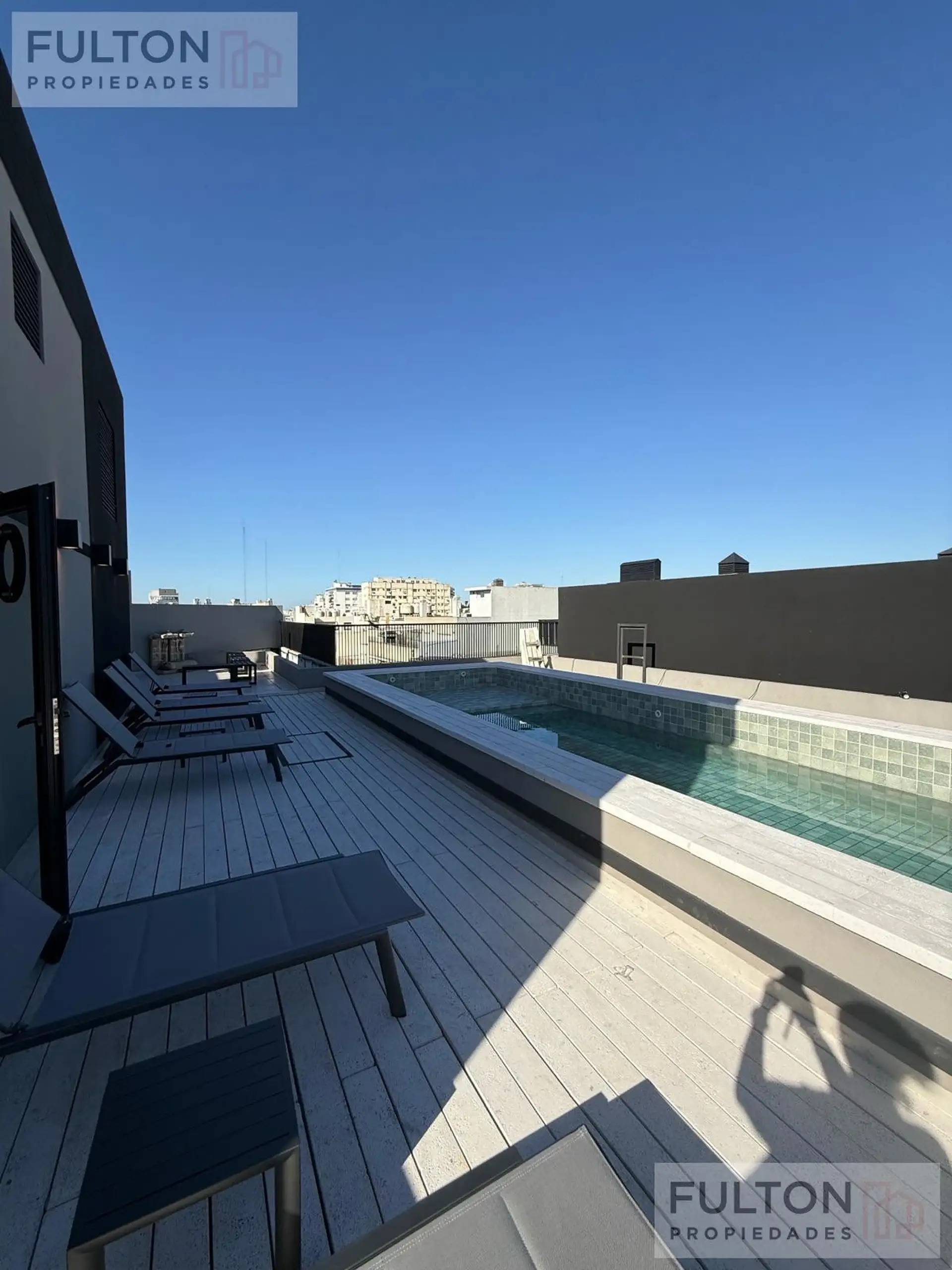 Kitnet de 1 ambiente com balcão de fundos, cozinha com cooktop elétrico e espaço para geladeira, e banheiro completo com chuveiro. Inclui ar-condicionado F/C e fechadura digital. O prédio tem piscina, área de churrasco, lavanderia e salão comunitário; fica a 2 quadras de Scalabrini Ortiz, Corrientes e Angel Gallardo.