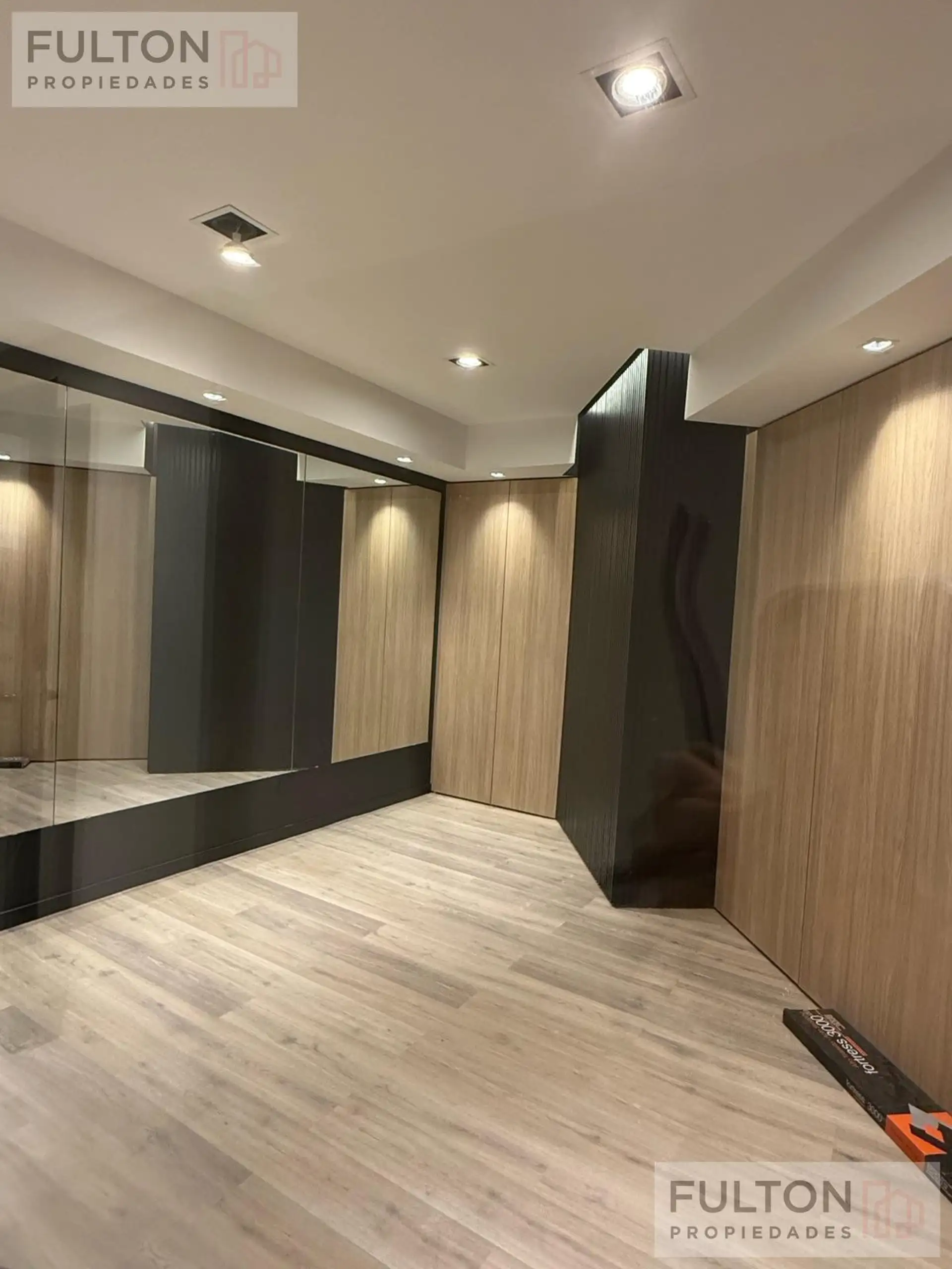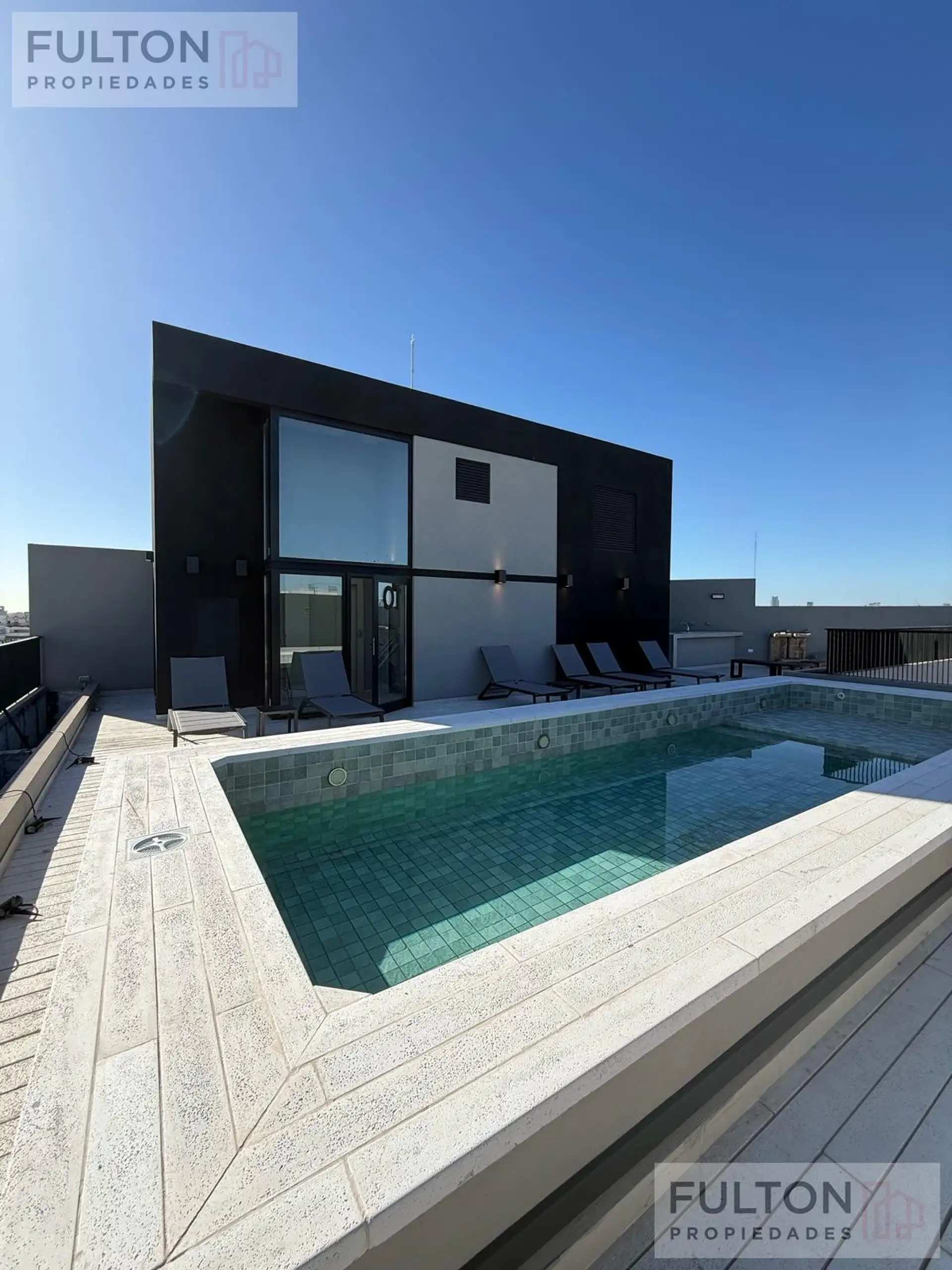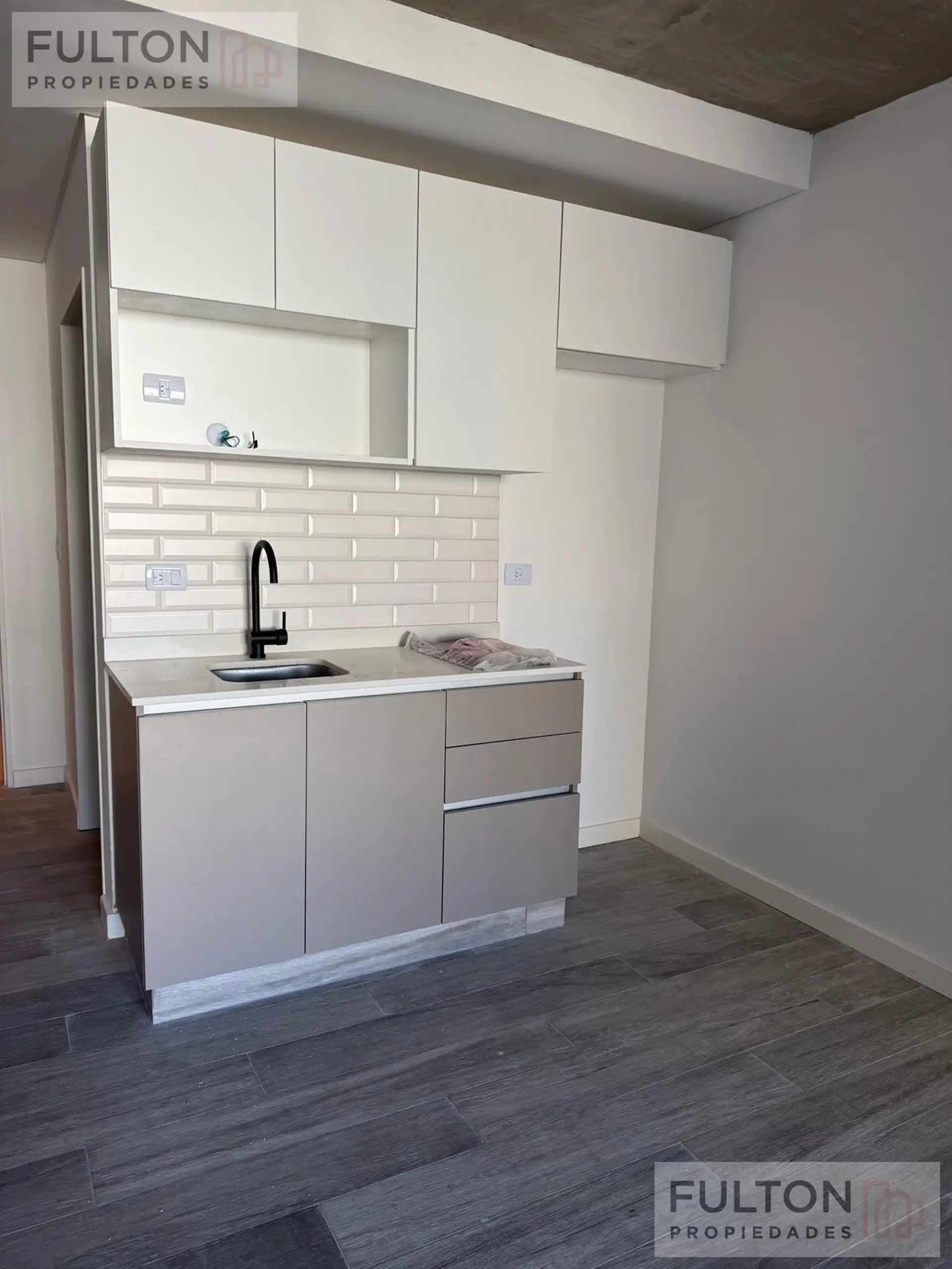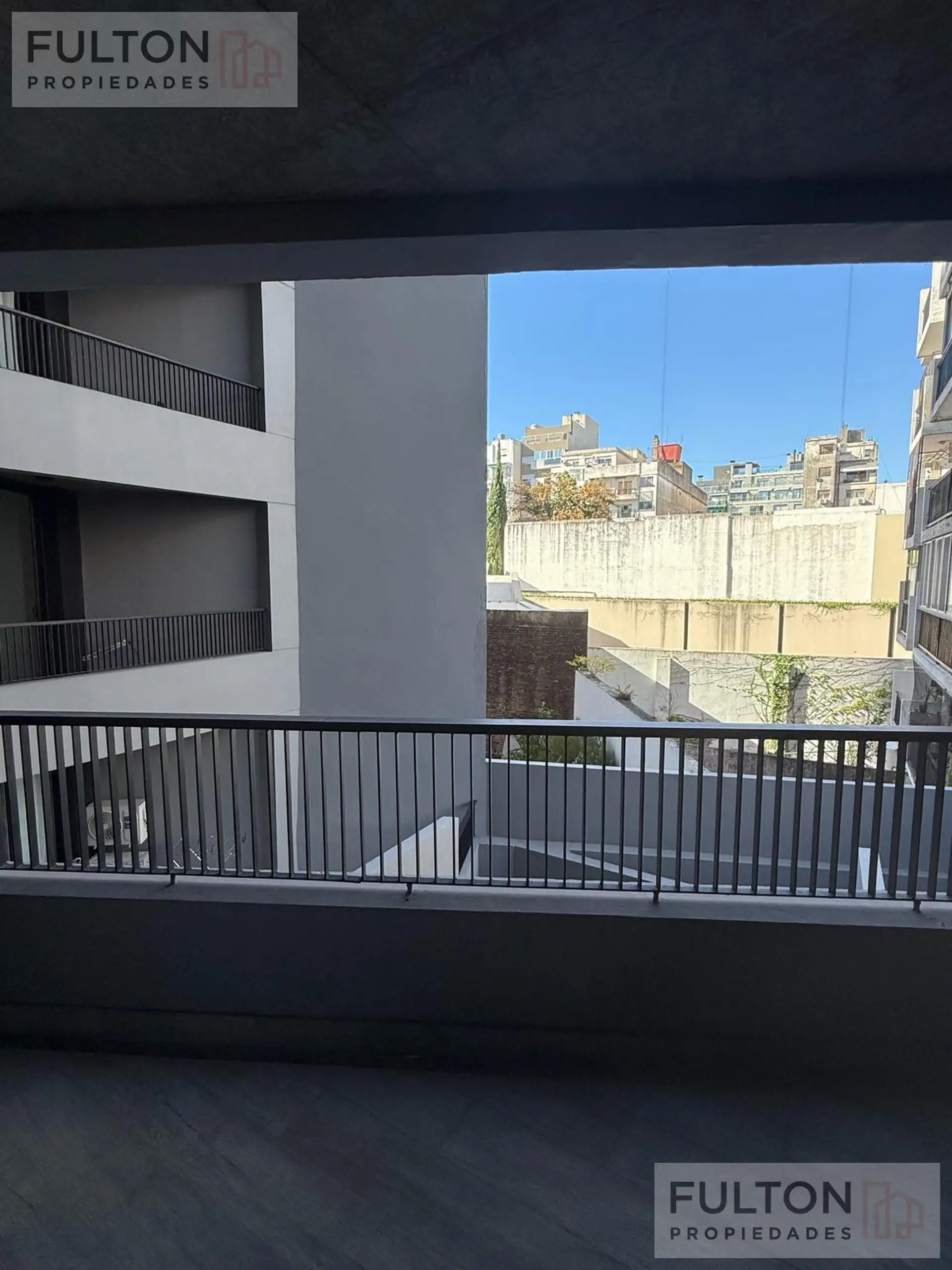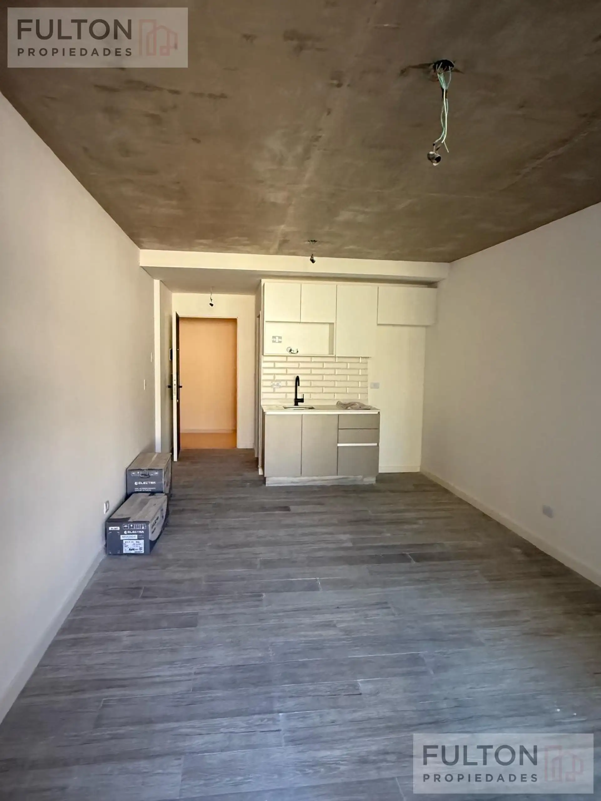 Kitnet de 1 ambiente com balcão de fundos, cozinha com cooktop elétrico e espaço para geladeira, e banheiro completo com chuveiro. Inclui ar-condicionado F/C e fechadura digital. O prédio tem piscina, área de churrasco, lavanderia e salão comunitário; fica a 2 quadras de Scalabrini Ortiz, Corrientes e Angel Gallardo.