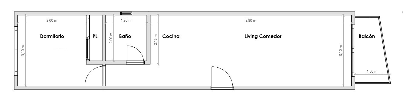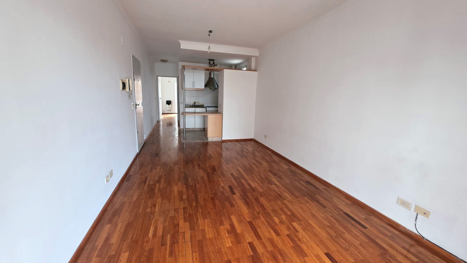 Apartamento de 2 ambientes com 46 m² cobertos e 50 m² totais, de frente para a rua, com pisos de parquet. Sala de jantar com cozinha e área de lavanderia integradas, balcão corrido de 3 x 1,30 (irregular) e banheiro completo. Dormitório de 3,10 x 3 m com armário embutido e aquecimento por estufas de tiro balanceado.
