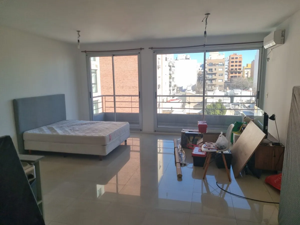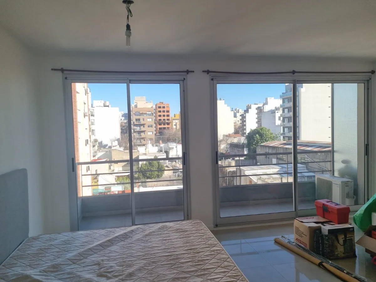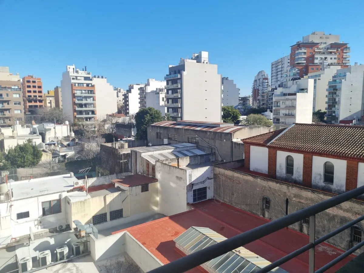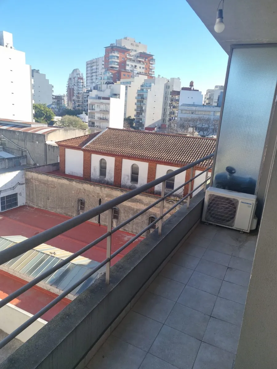 Kitnet mobiliada em Villa del Parque, de frente para a rua, no 8º andar (último). São 4 apartamentos por andar. Possui varanda em formato de área aberta com vista. Inclui black out e fica totalmente mobiliada.