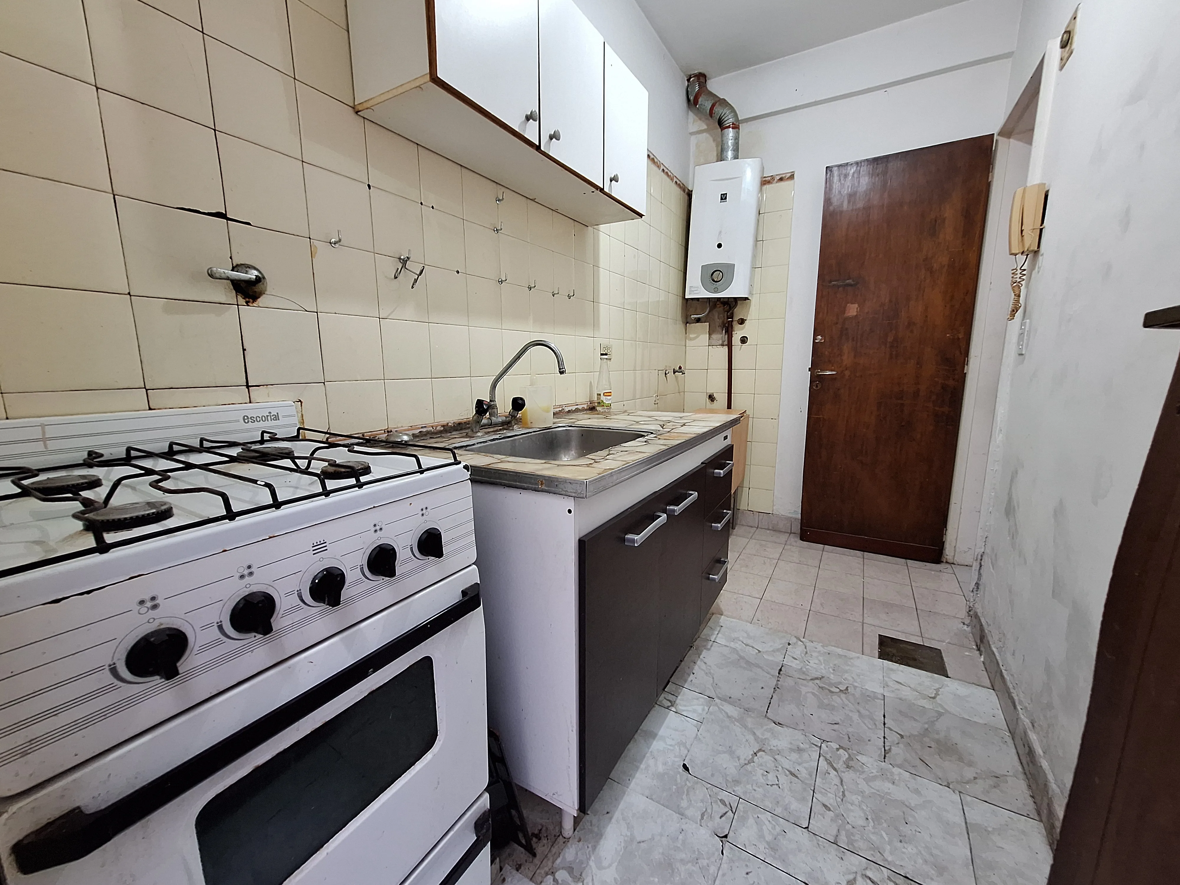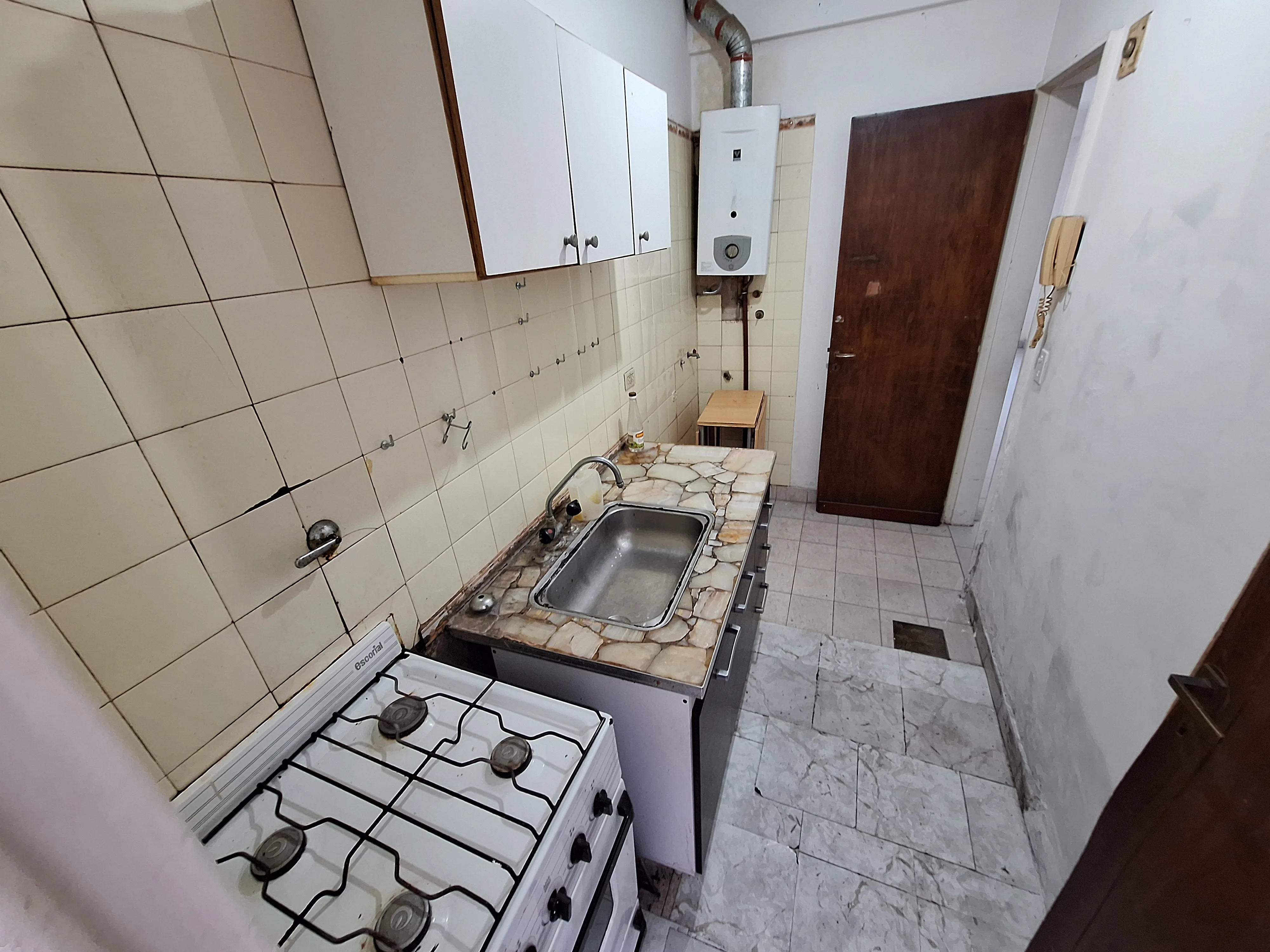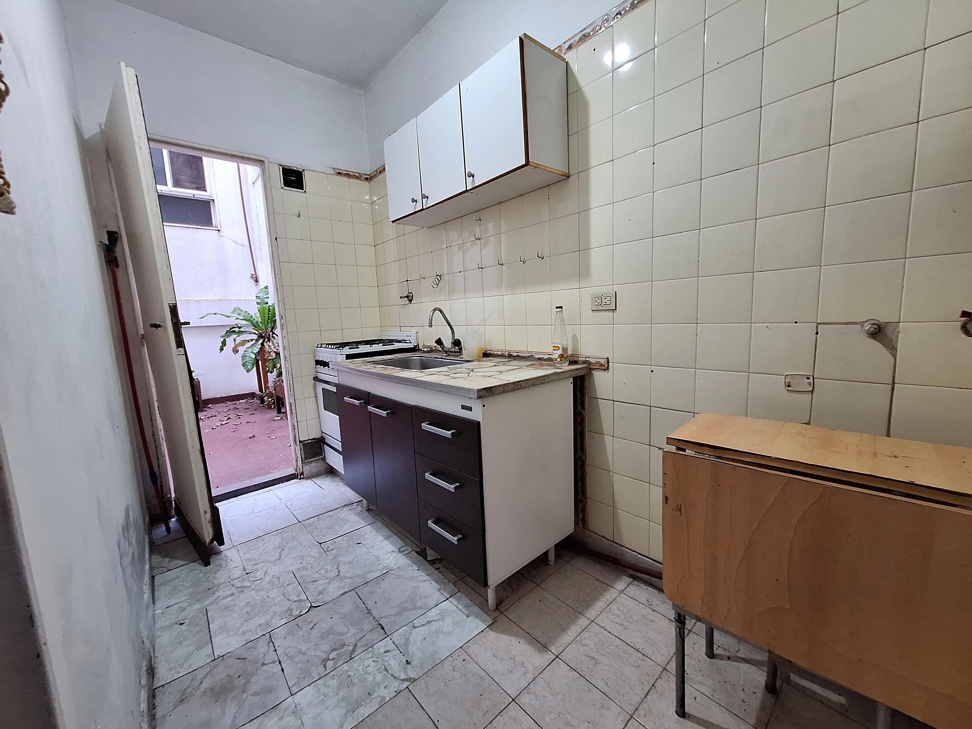 Kitnet com área de 5,65 x 3,00, cozinha independente (3,07 x 1,50) e banheiro completo (2,10 x 1,40). Há pátio de 3,60 x 3,50. Água quente por calefón, pisos em cerâmica e revestimentos de banheiro e cozinha em azulejo. O condomínio custa cerca de $ 40.000. Despesas de luz, gás, ABL e AySA ficam a cargo do locatário.
