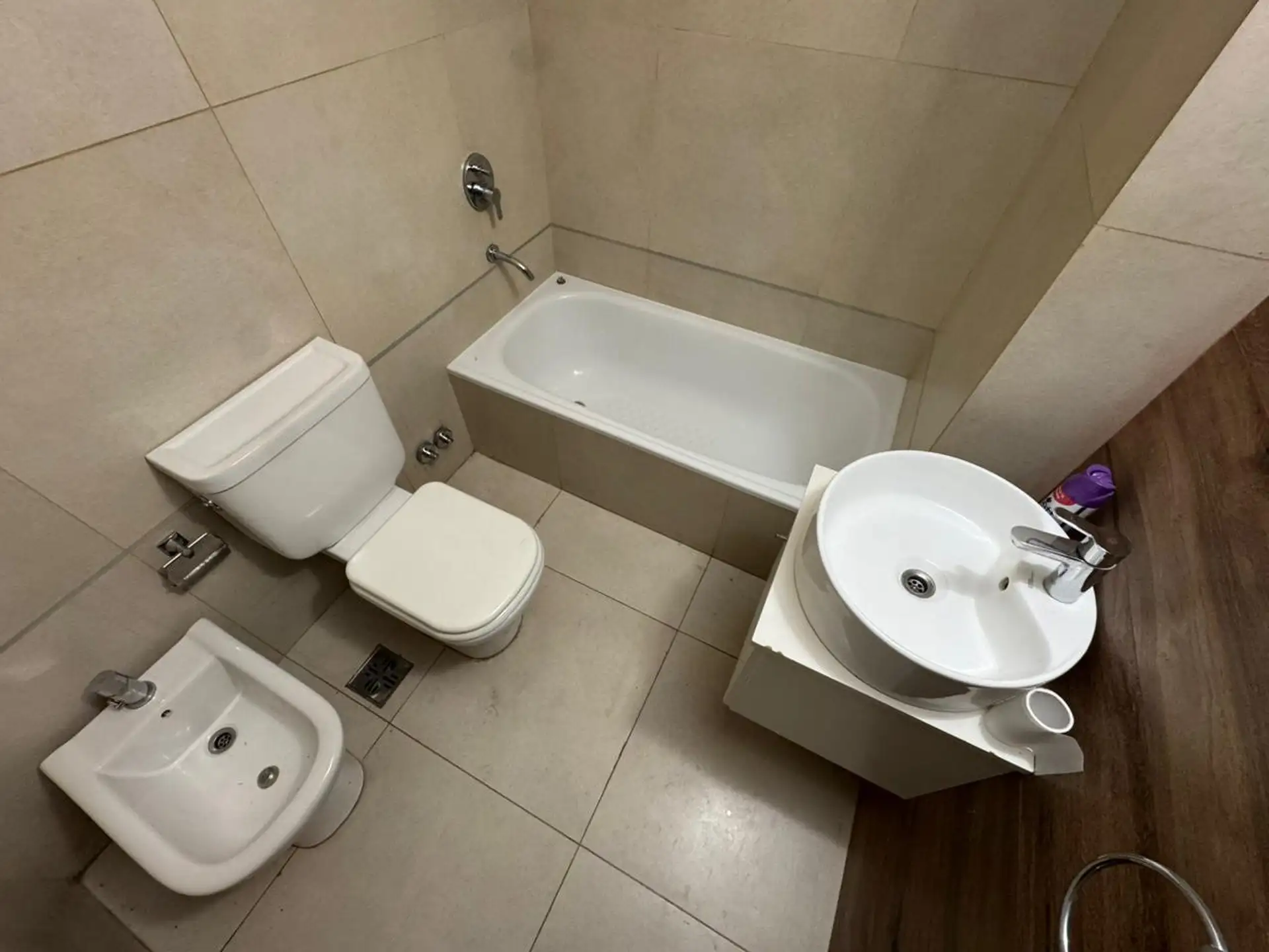 Apartamento de dois ambientes com 1 quarto, com armário embutido. Cozinha integrada com móveis sob a bancada e despensa, e banheiro completo com banheira.