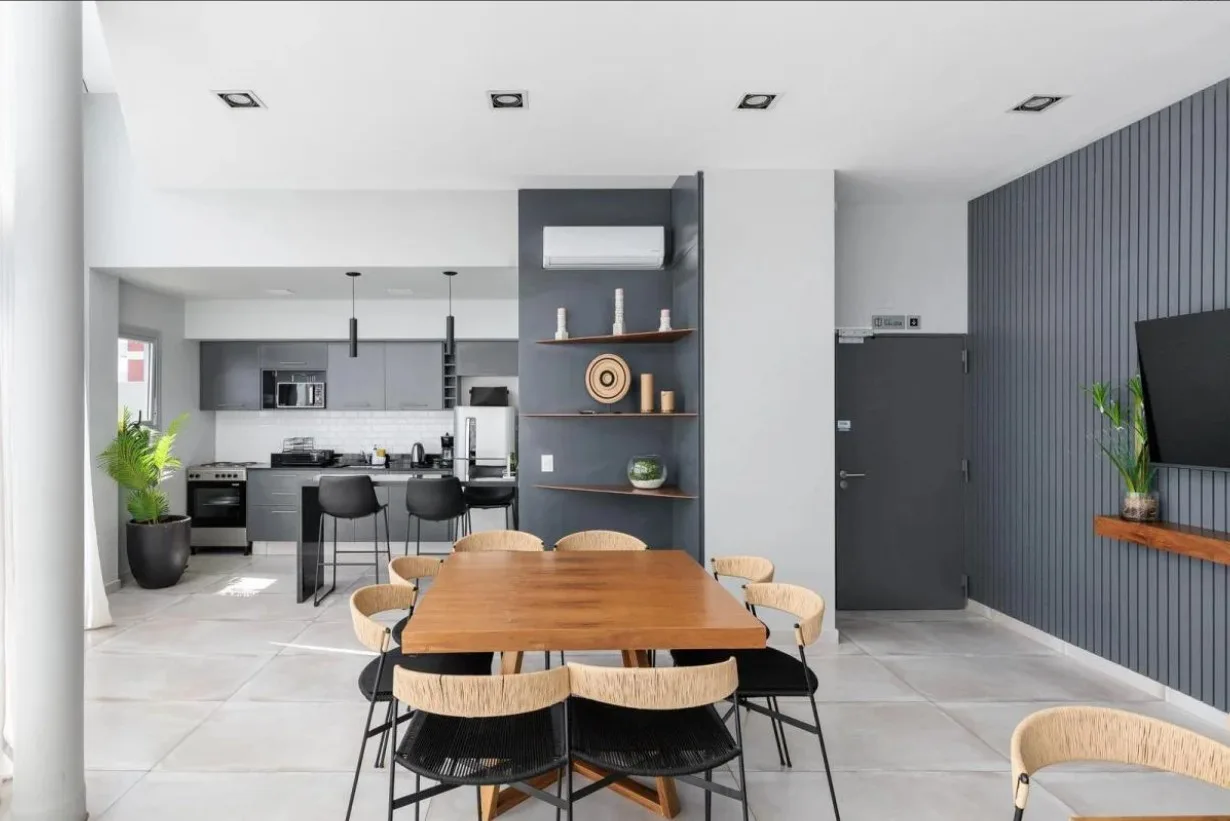 Apartamento de 2 ambientes com 59 m² totais, 47 m² cobertos e 12 m² de varanda. Fica de frente para a rua, com varanda corrida. Tem sala de estar e jantar com cozinha integrada, lavabo de serviço e 1 dormitório com banheiro em suíte e armário; há ar-condicionado em todos os ambientes. O prédio tem SUM, piscina, área de churrasco e academia. Contrato de 24 meses, valor inicial de $1000000, reajuste trimestral pelo índice IPC e garantia via seguro fiança. Exige adiantamento de 1 mês e 1 mês de dep