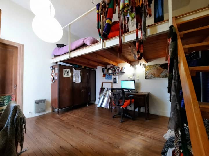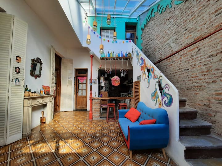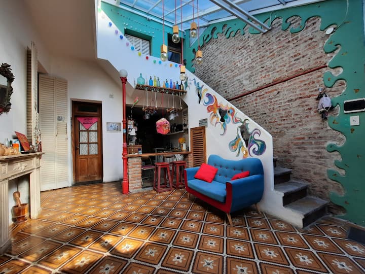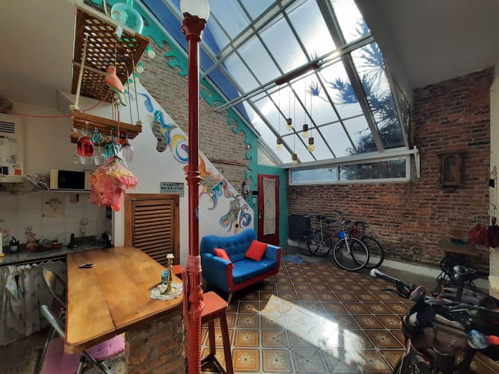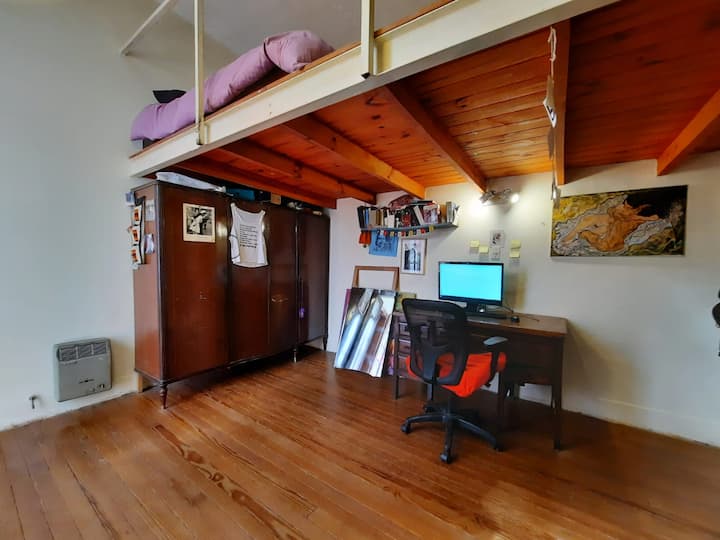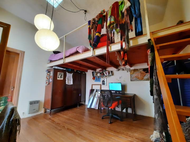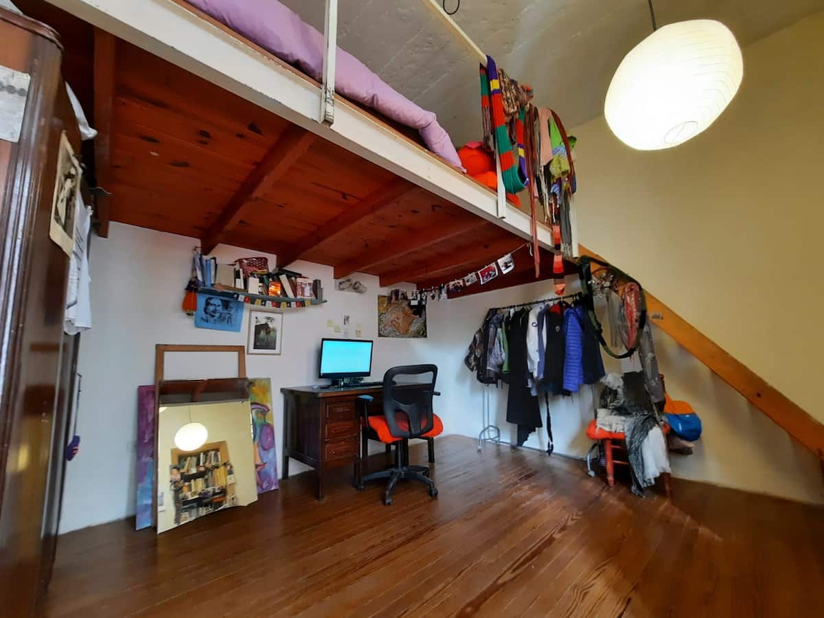 PH mobiliado e equipado em Villa Devoto, com 1 quarto e área de convivência com cozinha integrada. Há mezanino com cama de casal e área de trabalho para uso remoto, além de mesa e biblioteca para TV. A unidade compartilha 1 banheiro completo com banheira antiga, dispõe de área de lavanderia e de terraço com churrasqueira.