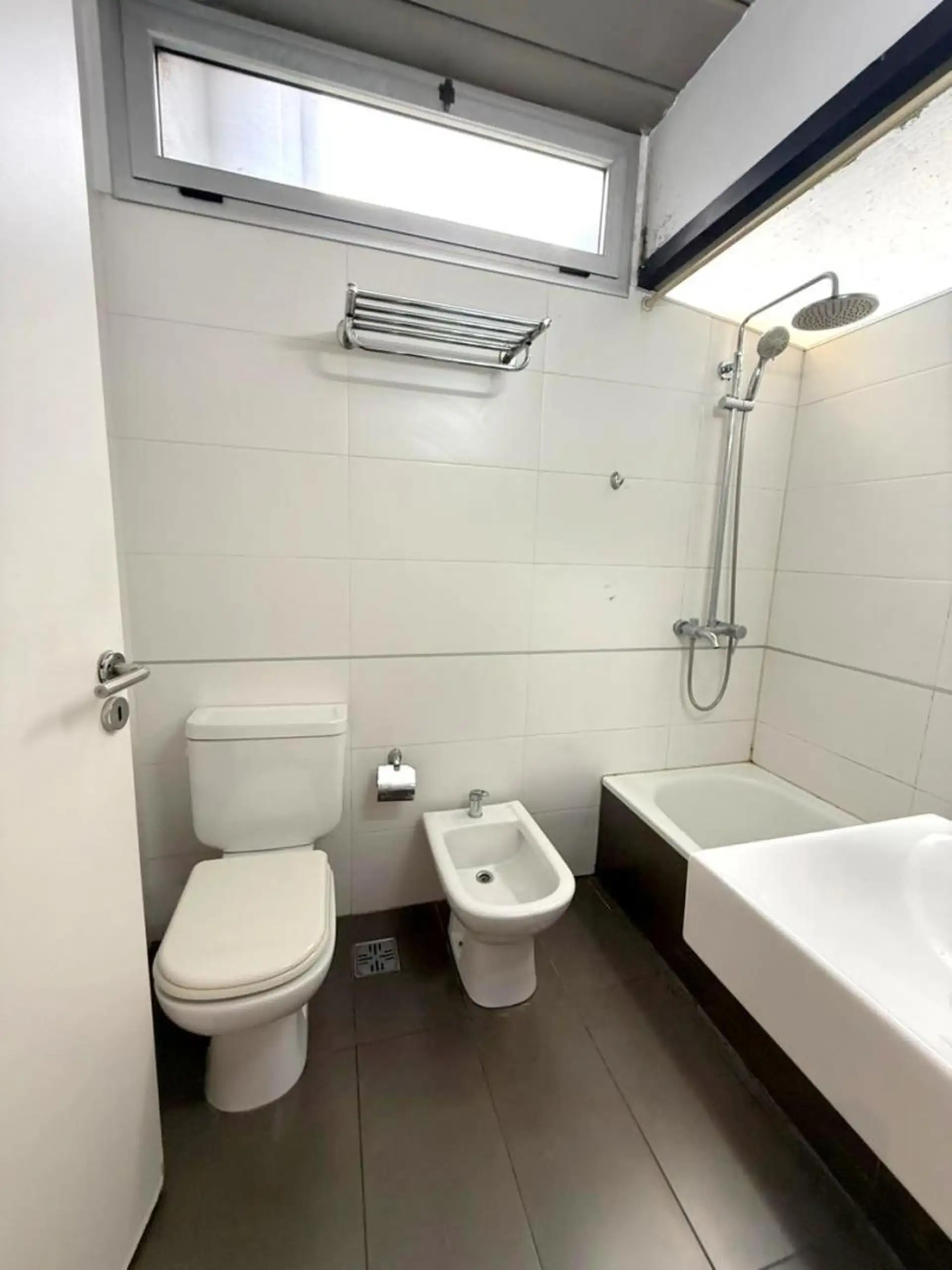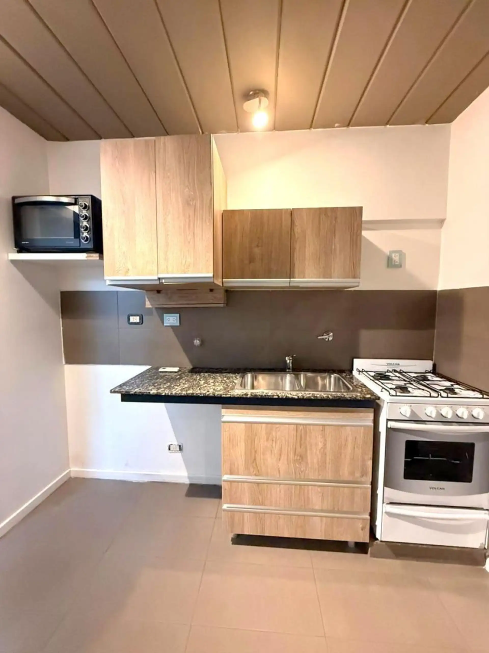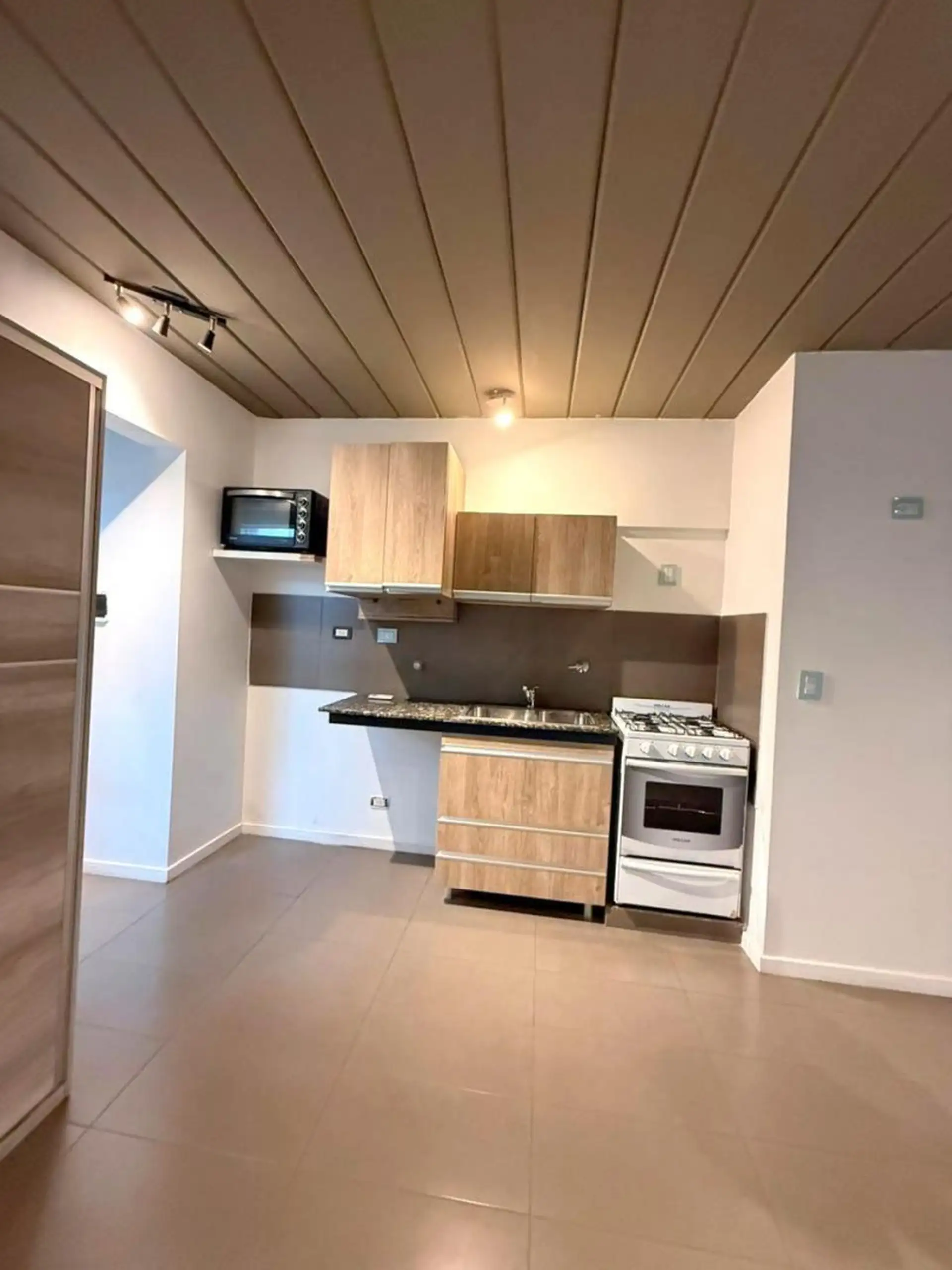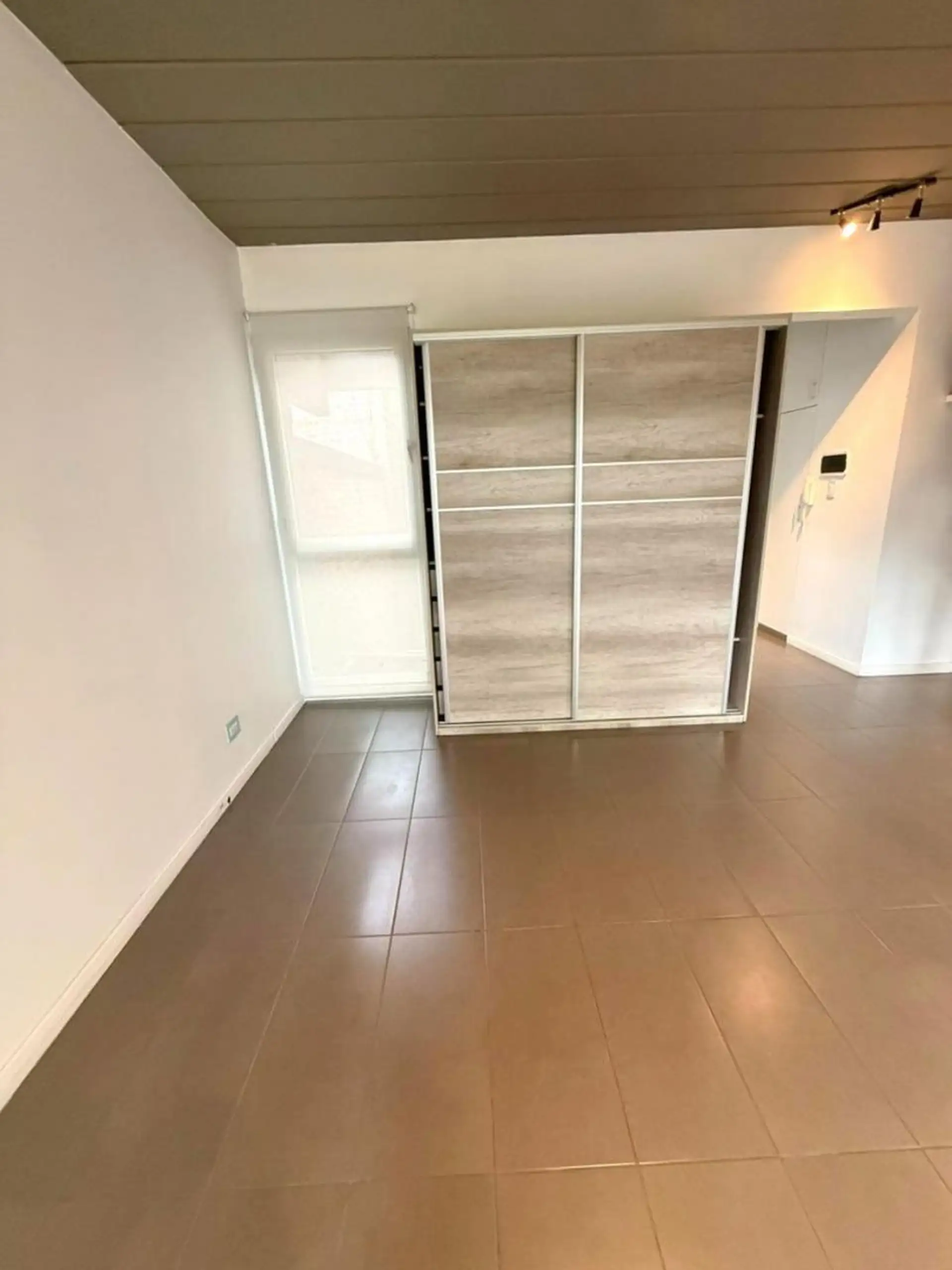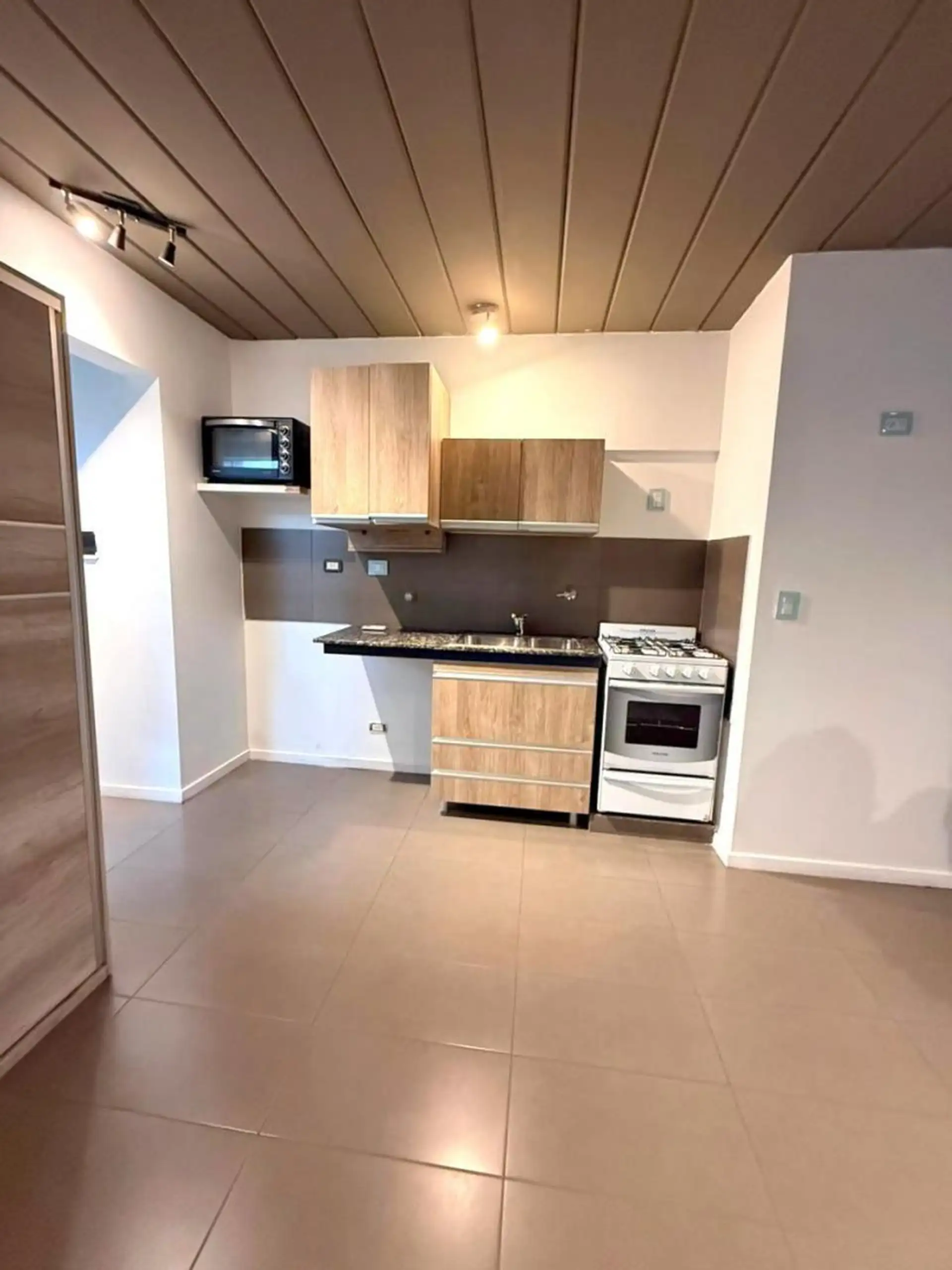 Kitnet no 1º andar, de frente para a rua, com varanda semi coberta, em Villa Devoto. Possui living-comedor com armário, cozinha com armário baixo e alçena, conexão para lavadora, ar-condicionado e banheiro completo. O valor anunciado inclui vaga de garagem descoberta; o condomínio inclui AYSA. Aceita pet, contrato de 24 meses com reajuste trimestral pelo IPC, e limite de 2 pessoas.