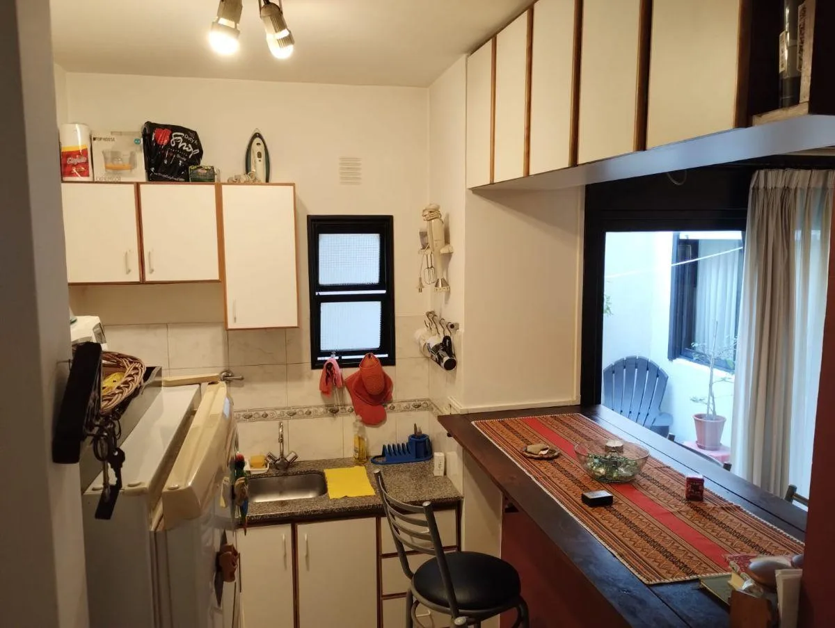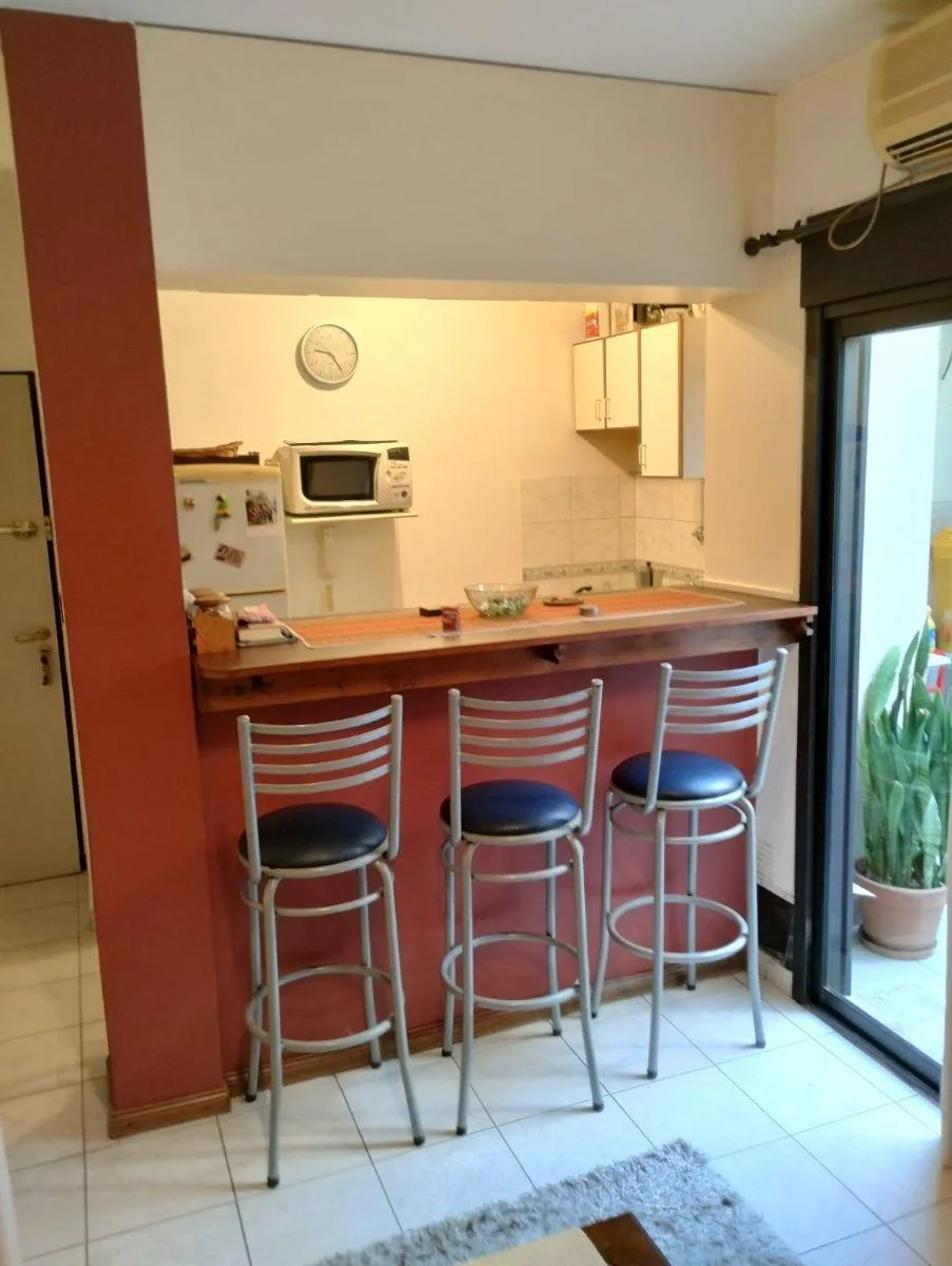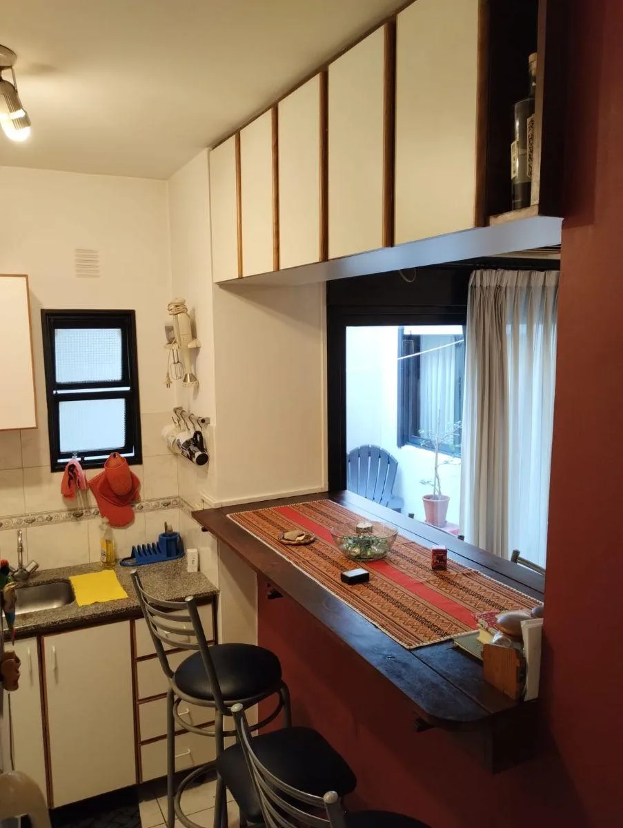 PH de dois ambientes para alugar com 1 dormitório e 1 banheiro, cozinha com integração parcial e sala de estar e jantar. Tem pátio e espaço para máquina de lavar roupas. O acesso é por corredor comum, com disposição lateral.