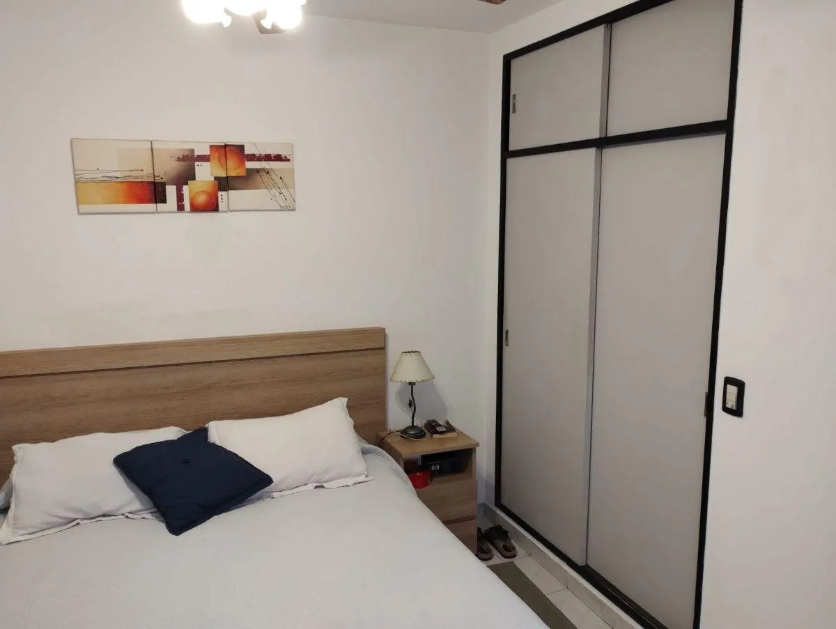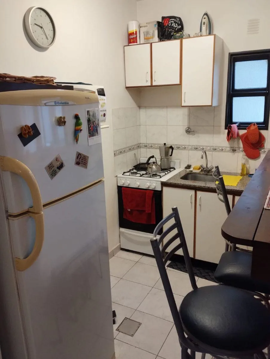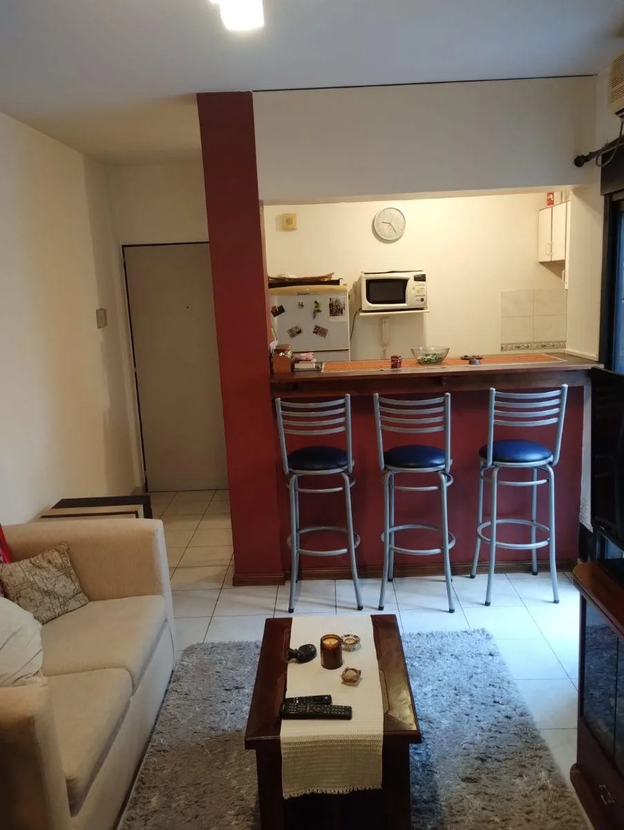 PH de dois ambientes para alugar com 1 dormitório e 1 banheiro, cozinha com integração parcial e sala de estar e jantar. Tem pátio e espaço para máquina de lavar roupas. O acesso é por corredor comum, com disposição lateral.