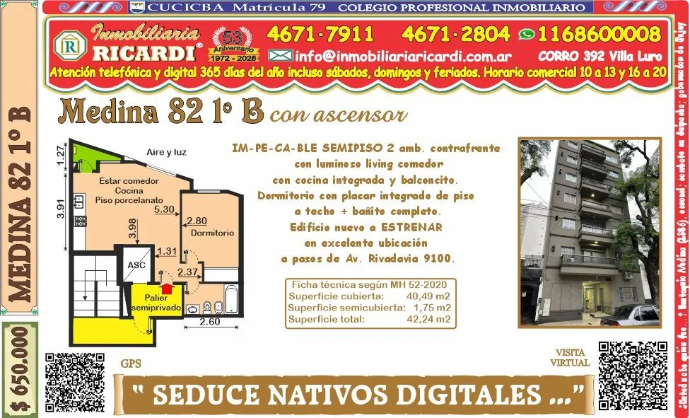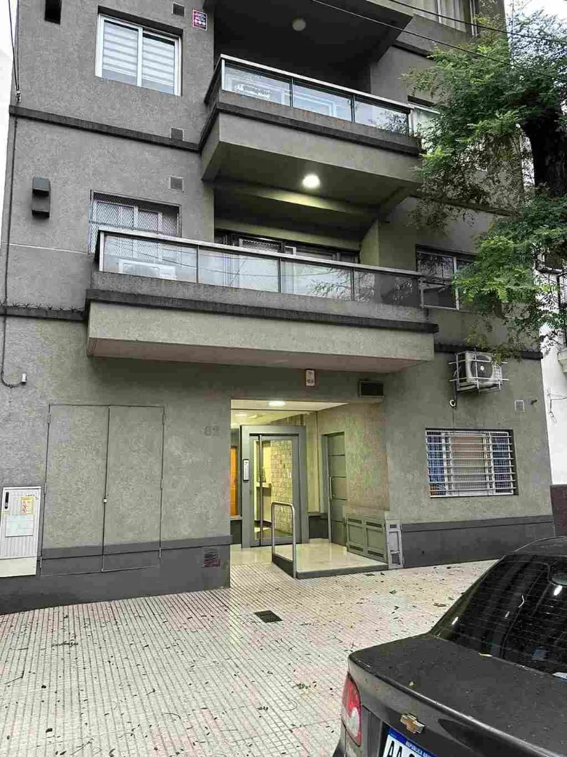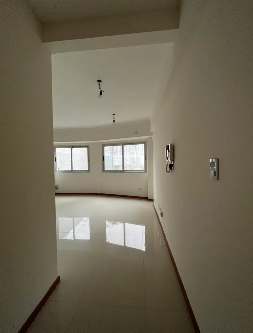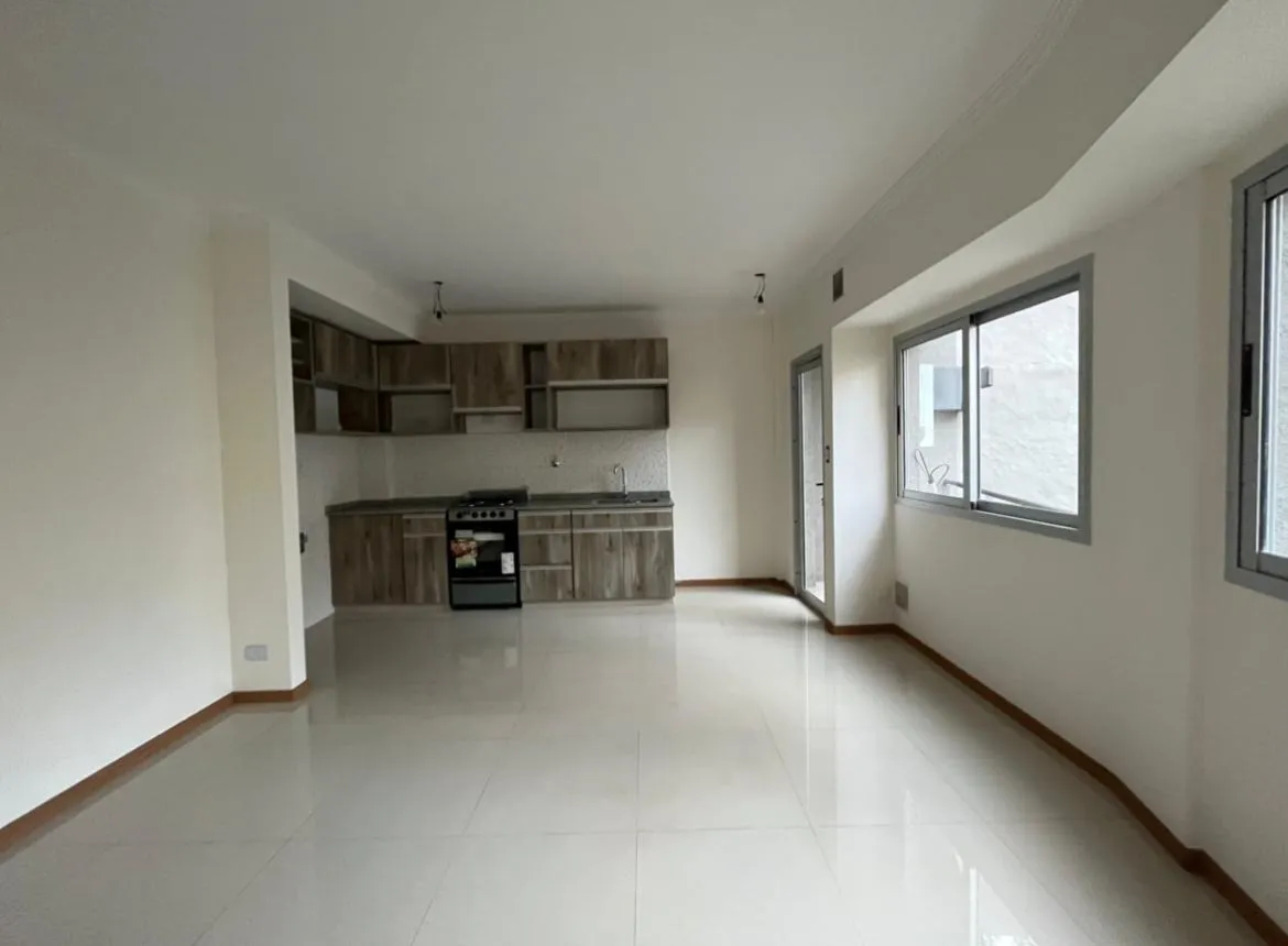 Apartamento de 2 ambientes com 40,49 m² cobertos, 1,75 m² semicobertos e 42,24 m² totais, novo (nunca habitado), de fundos (contrafrente) e orientação para o nascente. A unidade tem living com cozinha integrada de 5,30 x 4,00, piso de porcelanato e saída para uma varanda com calefón. Há hall de distribuição, quarto de 3,70 x 2,80 com armário embutido do piso ao teto e banheiro completo com banheira e bidê. O regulamento de condomínio permite uso profissional.