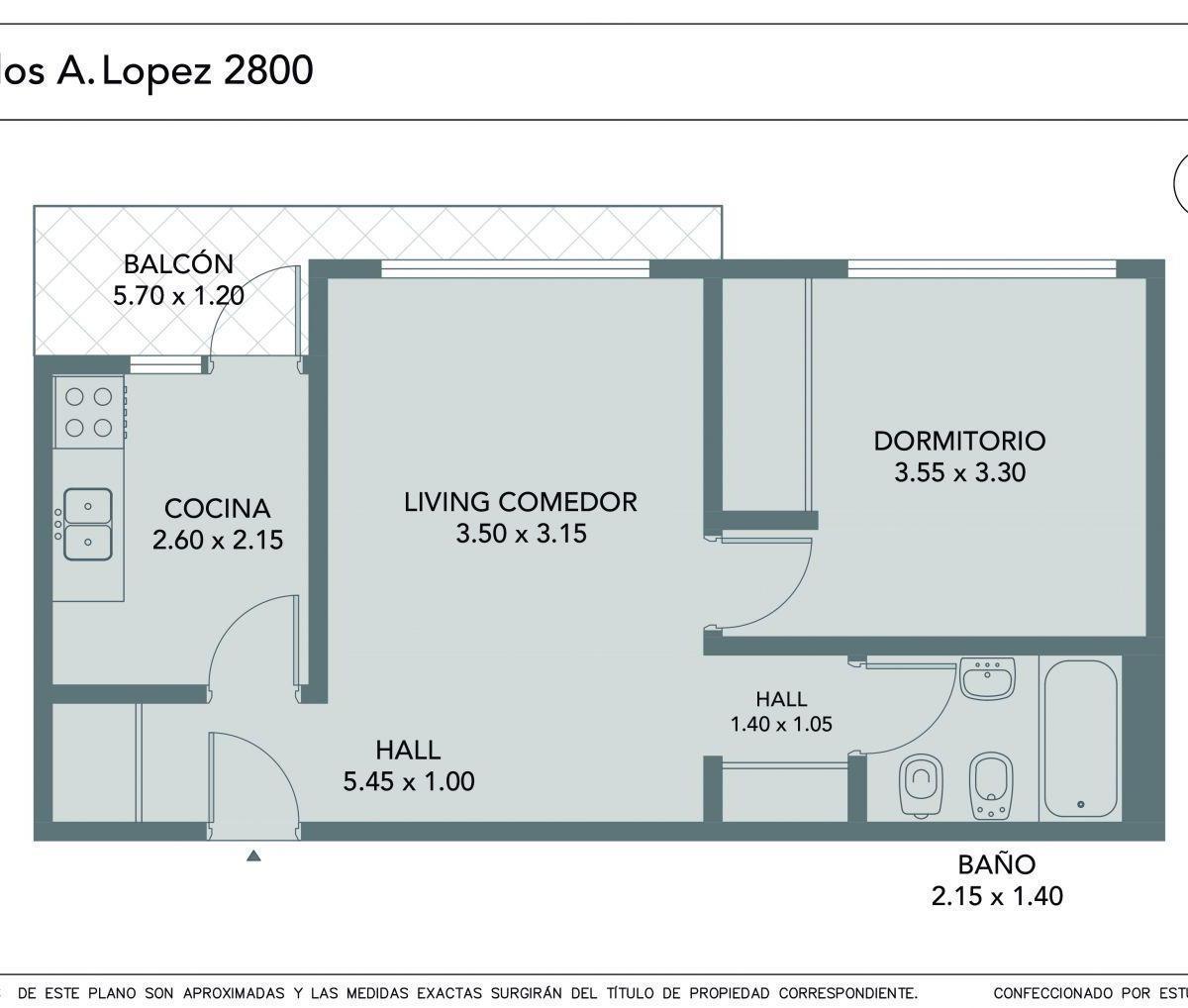 Apartamento de 2 ambientes com hall de entrada. Inclui living com 3,50 x 3,15 m e acesso a varanda de 5,70 x 1,20 m, cozinha independente de 2,60 x 2,15 m com saída para a varanda, e segundo hall que leva ao dormitório de 3,55 x 3,30 m com armário embutido. Possui banheiro completo de 2,15 x 1,40 m. O edifício oferece segurança 24 horas, salão de festas, piscina e área de churrasco. Não aceita pets. Exige garantia Capital ou seguro Finaer, 1 mês de adiantamento e 1 mês de depósito; inclui contra