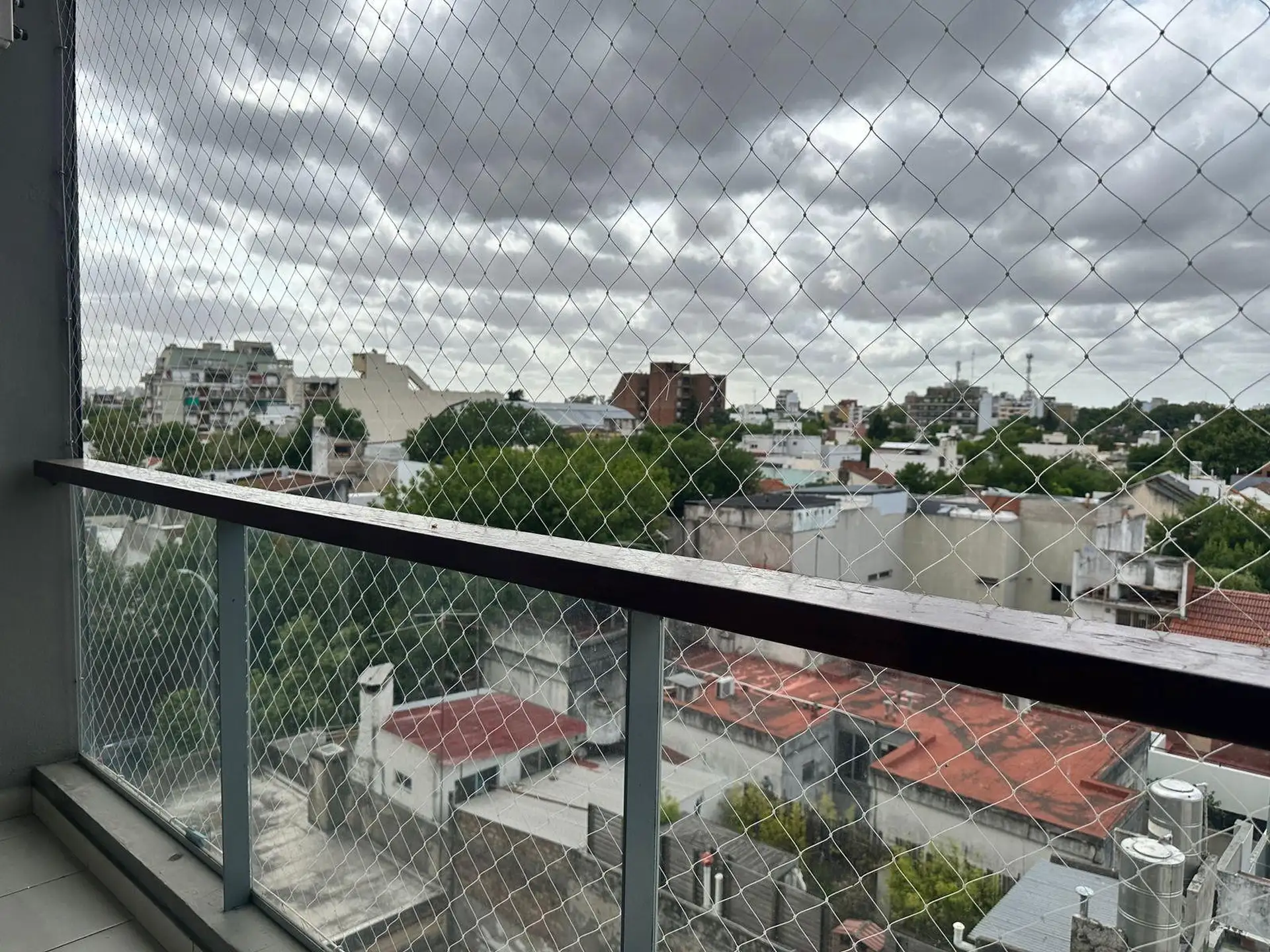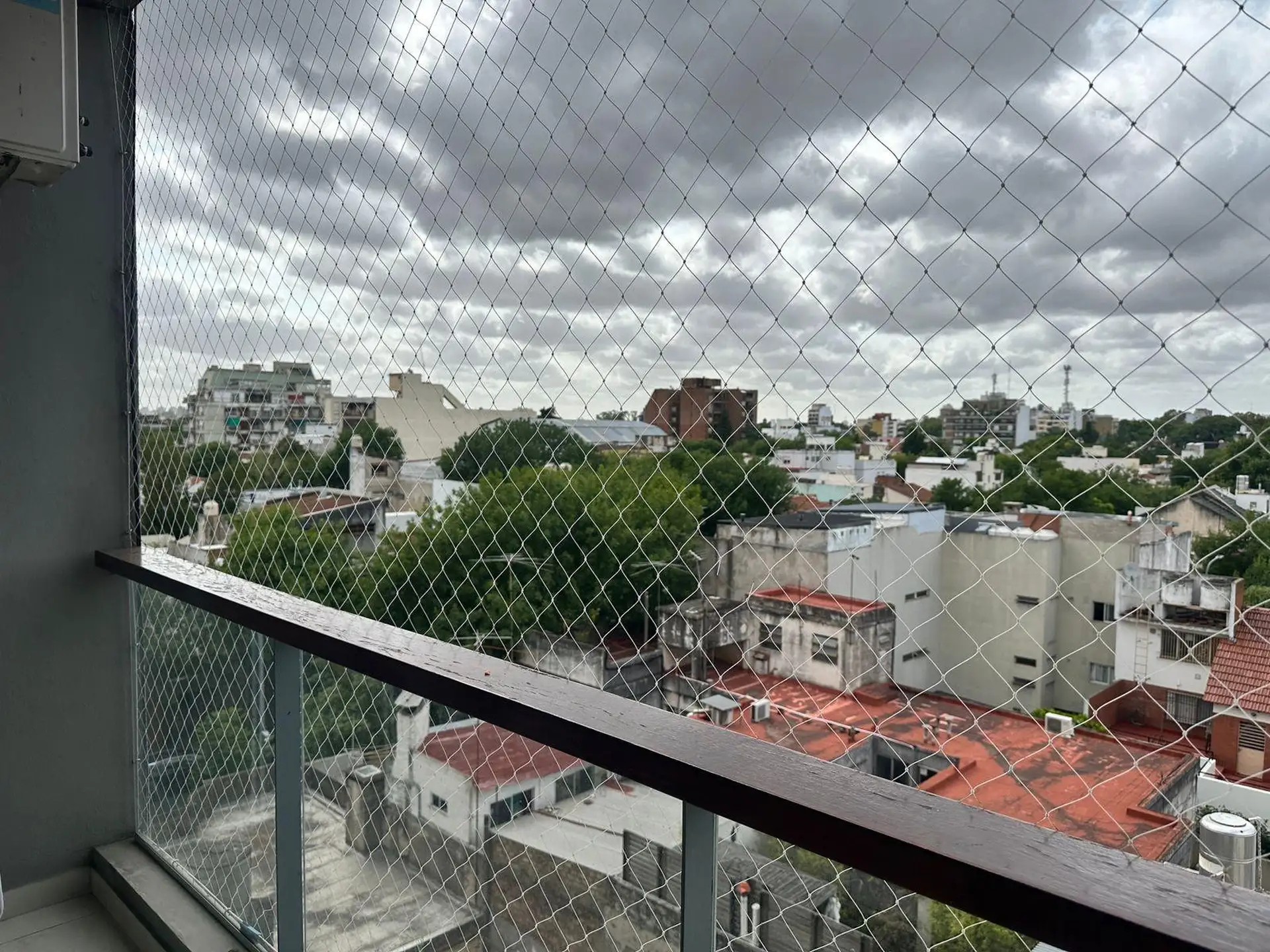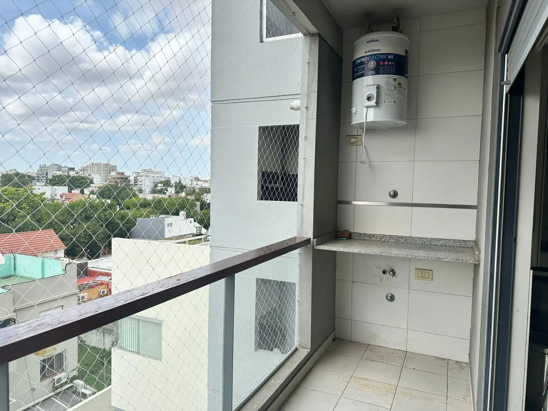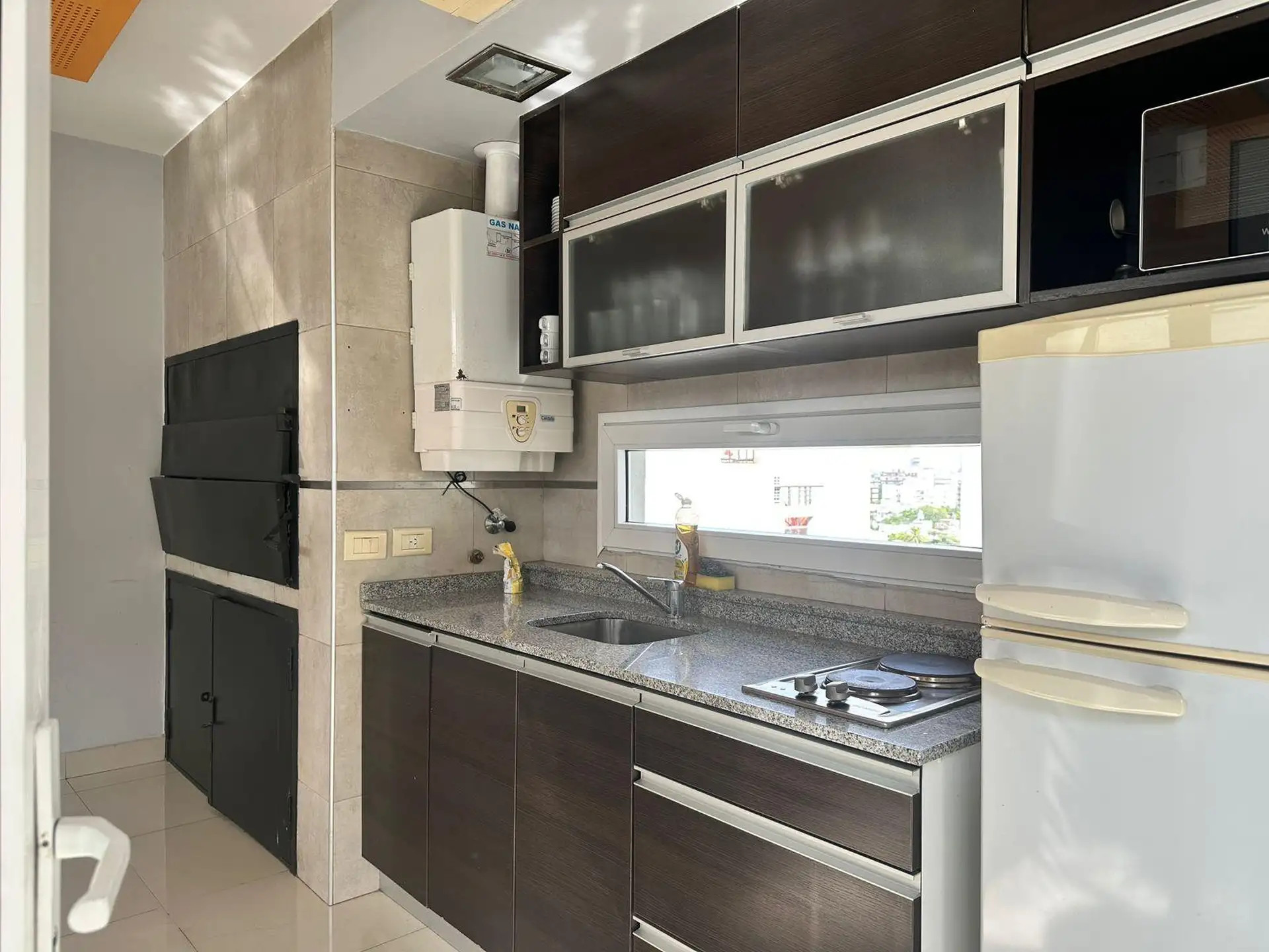 Studio (kitnet) de 1 ambiente em andar 5, de fundos (contrafrente). Possui 4,50x7,55 m de área de ambiente e cozinha integrada com móveis sob e sobre a bancada, com fogão a gás. Banheiro completo com banheira, além de varanda de 4,50x1,50 m com conexão para lavadora. O condomínio inclui a AYSA; o edifício tem 10 andares, 3 unidades por andar, 1 elevador, piscina, solarium e SUM.