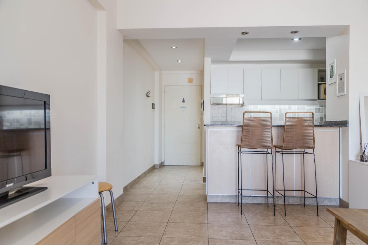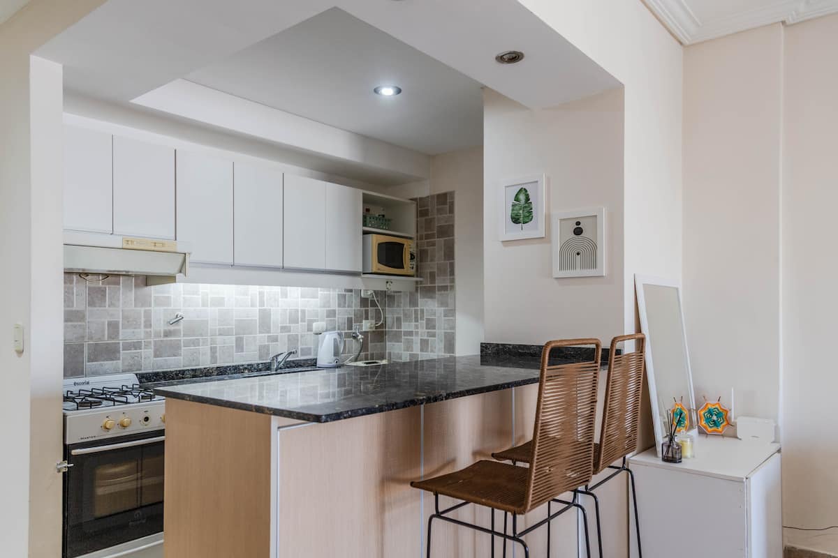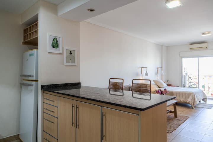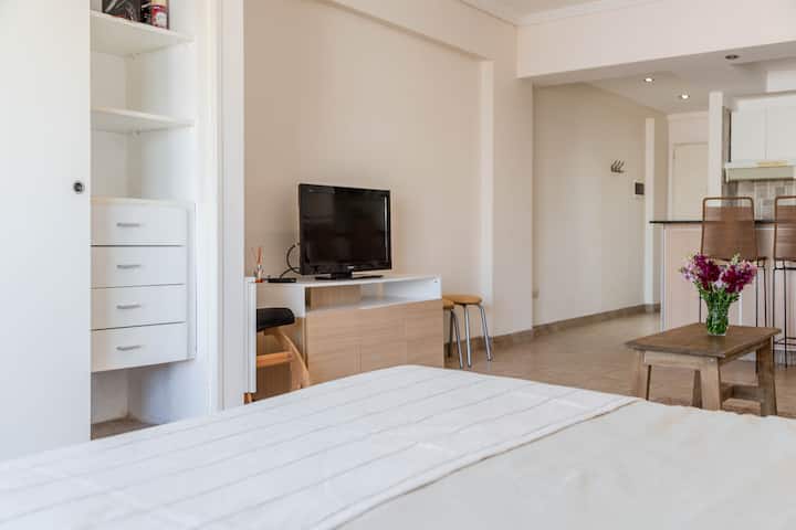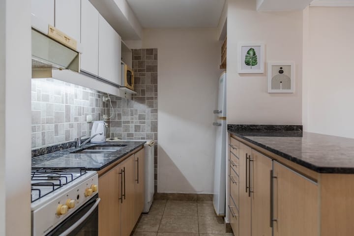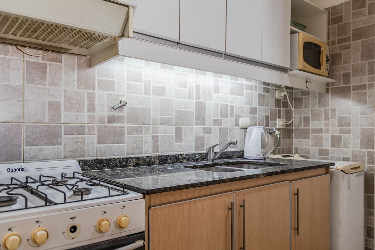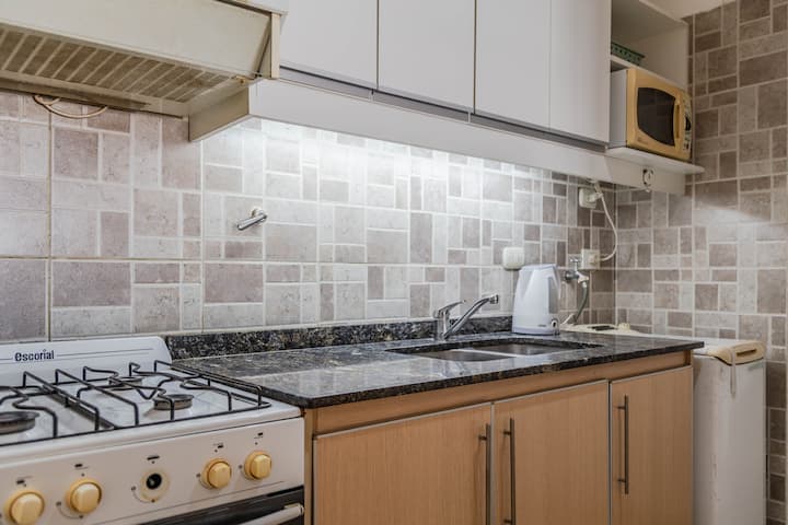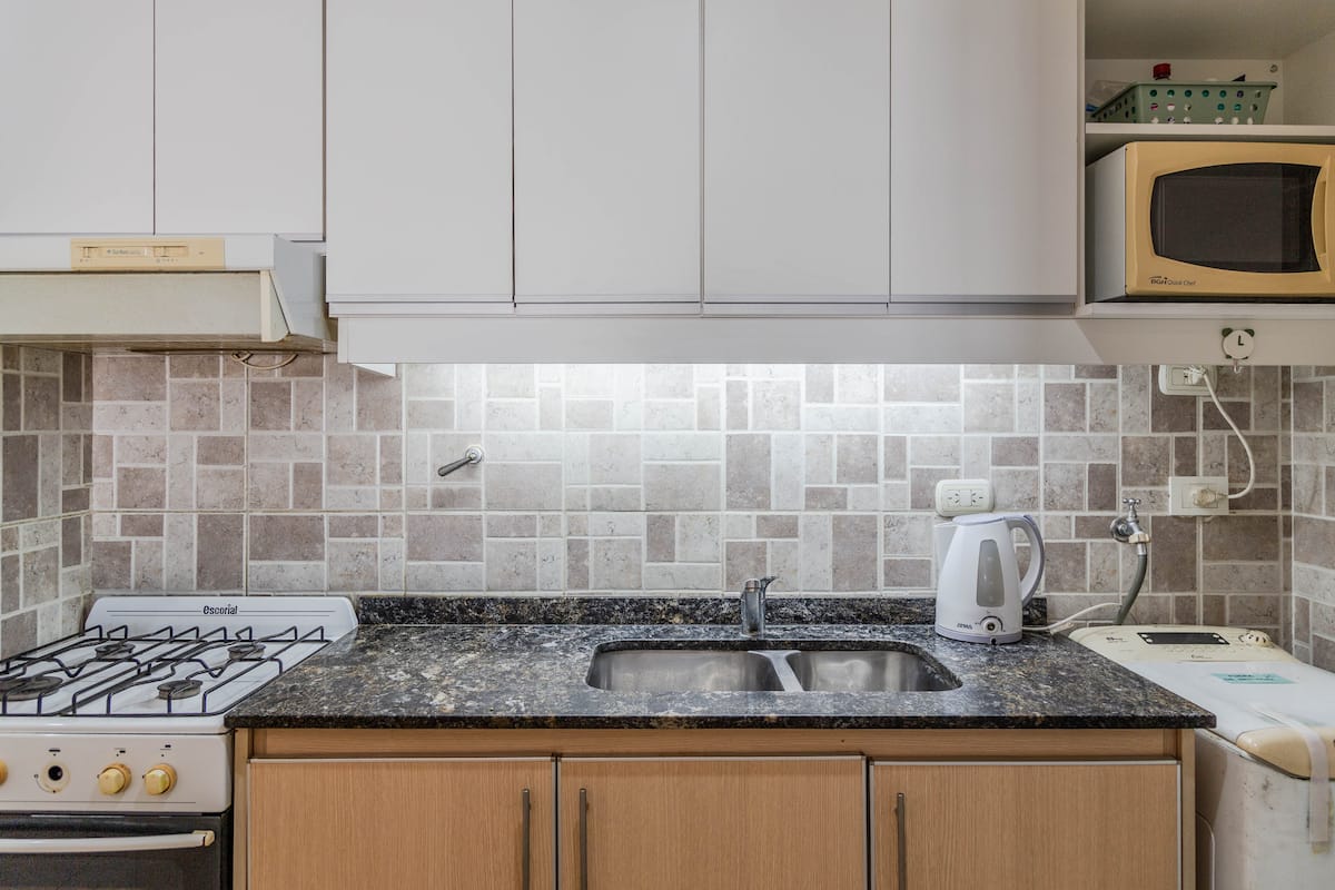 Kitnet mobiliada em Villa Santa Rita, com 1 cama de casal fixa, sala integrada com área de jantar, cozinha e dormitório no mesmo ambiente. Possui ar-condicionado (frio e quente), aquecimento eficiente e Wi‑Fi de alta velocidade. A cozinha tem geladeira, forno e fogão, além de micro-ondas, chaleira elétrica, cafeteira e torradeira; banheiro moderno com chuveiro e banheira e secador de cabelo. Há terraço com churrasqueira privativa e varanda com churrasqueira, além de vaga de garagem sem cobertura