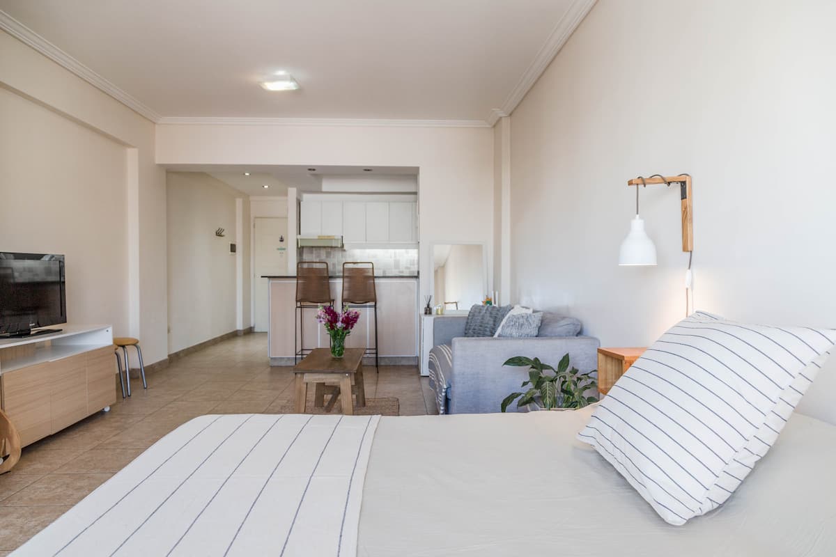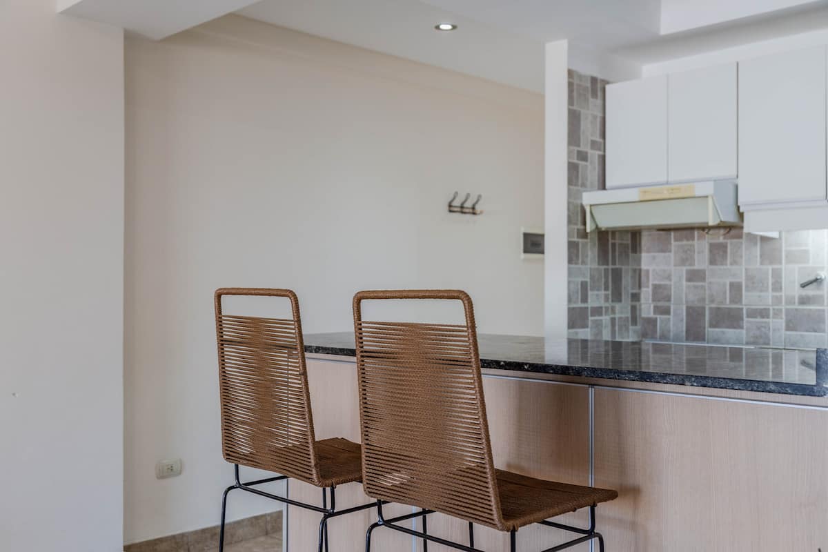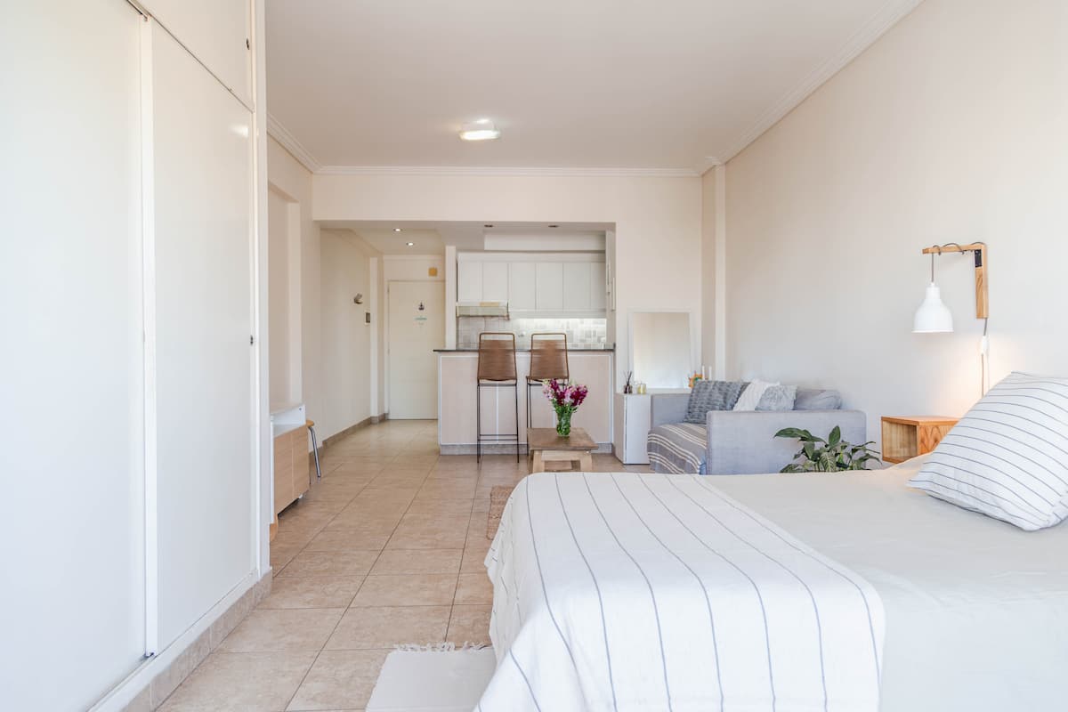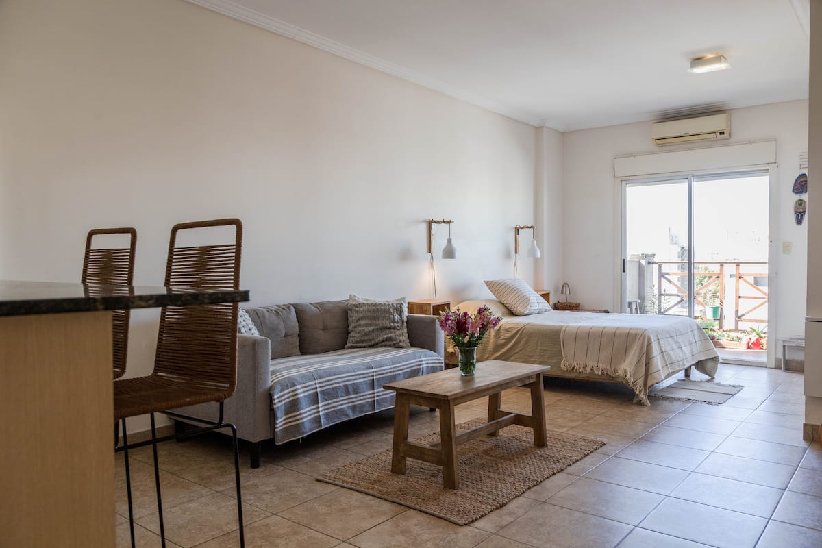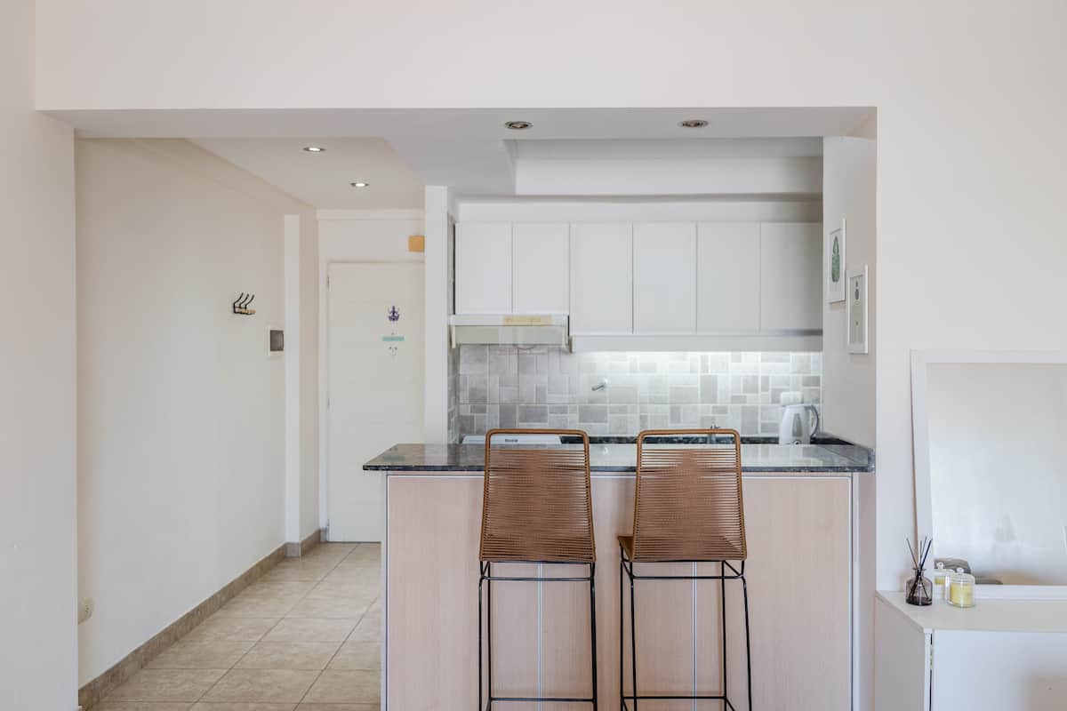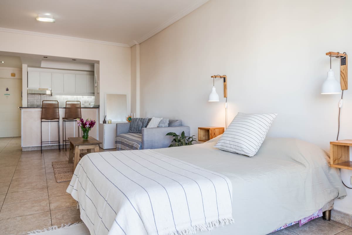 Kitnet mobiliada em Villa Santa Rita, com 1 cama de casal fixa, sala integrada com área de jantar, cozinha e dormitório no mesmo ambiente. Possui ar-condicionado (frio e quente), aquecimento eficiente e Wi‑Fi de alta velocidade. A cozinha tem geladeira, forno e fogão, além de micro-ondas, chaleira elétrica, cafeteira e torradeira; banheiro moderno com chuveiro e banheira e secador de cabelo. Há terraço com churrasqueira privativa e varanda com churrasqueira, além de vaga de garagem sem cobertura